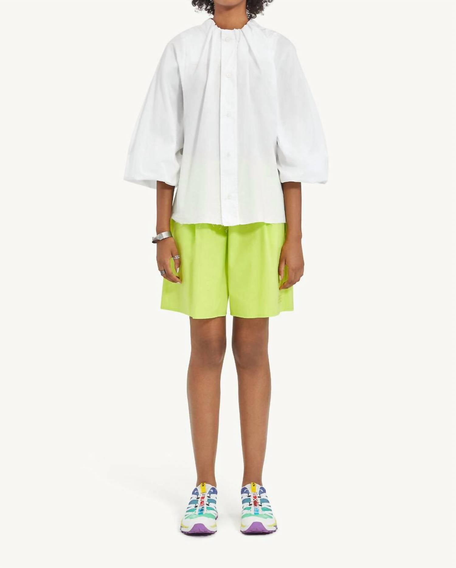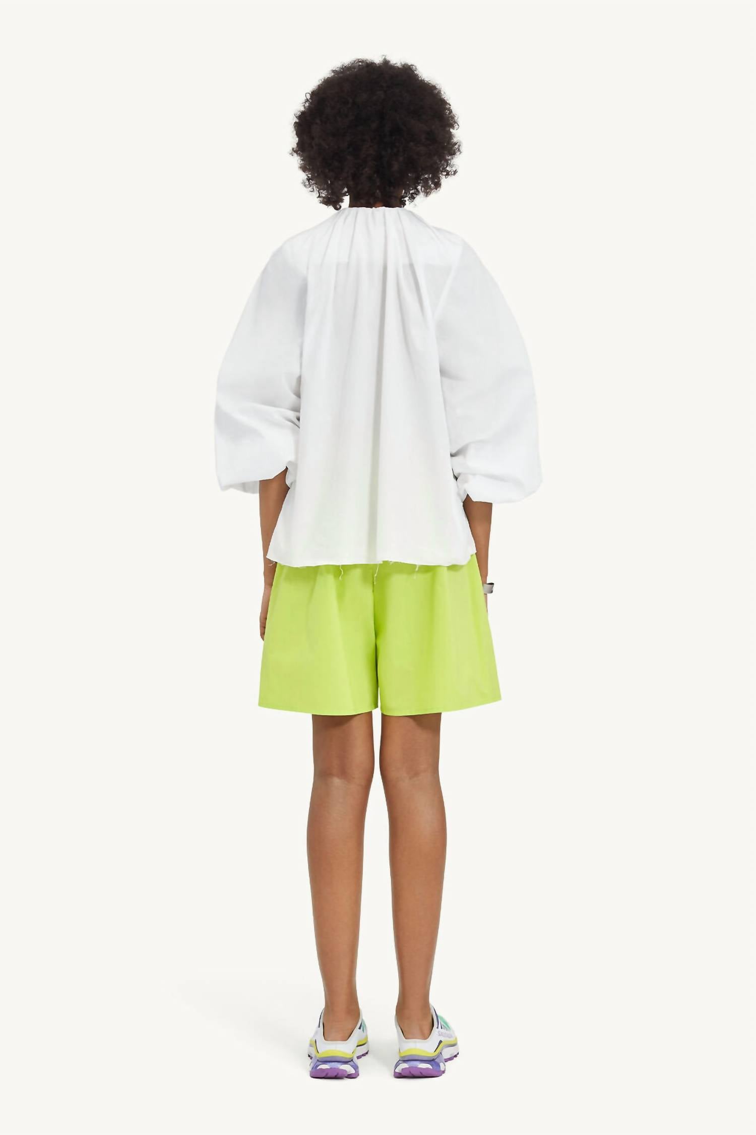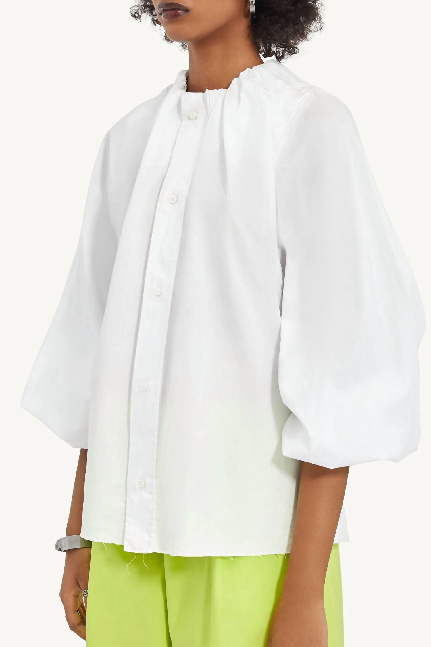 This Gathered Neck Long Sleeve Top features 100% cotton poplin, a mockneck design with an intriguing gathered neckline, and a raw-edged hem. It is marked by iconic horizontal white stitches at the back. Made in Portugal.