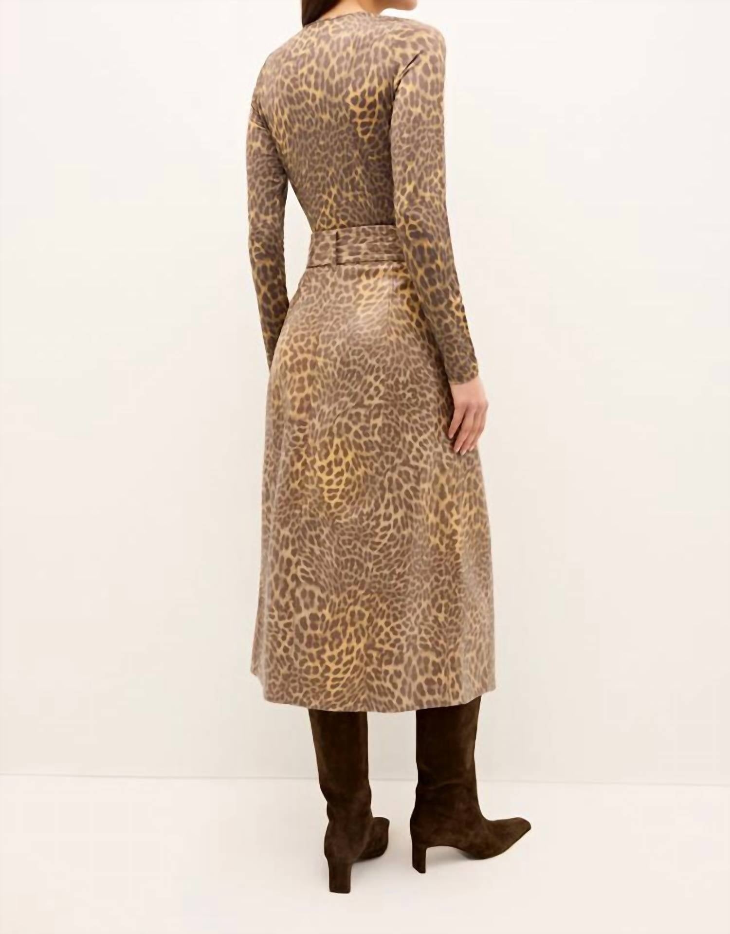 Show off just the right amount of skin in this beautifuly designed midi length skirt. Introducing the Chelsea Midi Skirt by Marie Oliver, a statement piece in a bold Leopard print perfect for the Fall season. This women's midi skirt is crafted from vegan leather and a coated Rayon blend, ideal for those who embrace sophistication with a heart for sustainability. Closure is effortlessly secured with a snap closure. Care instructions: Spot or wipe clean.