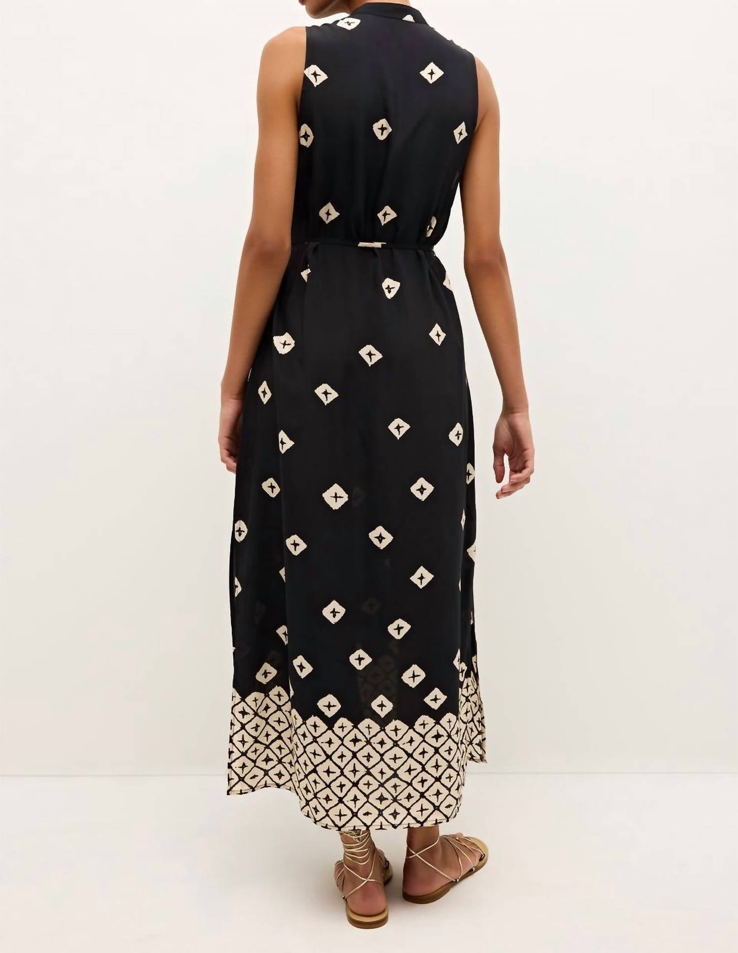Style this maxi with your favorite statement necklace and sandals for the perfect look. Discover the Kirkley Dress by Marie Oliver, a perfect addition to your vacation wardrobe in an eye-catching ceramic graphic pattern. This sleeveless maxi dress combines style with comfort, featuring a classic shirt silhouette and a button front placket. Made from 100% viscose, it offers the versatility of an optional skinny tie belt and side slits for ease of movement. Care is simple with hand washing using gentle detergent and a choice to hang dry or dry clean.