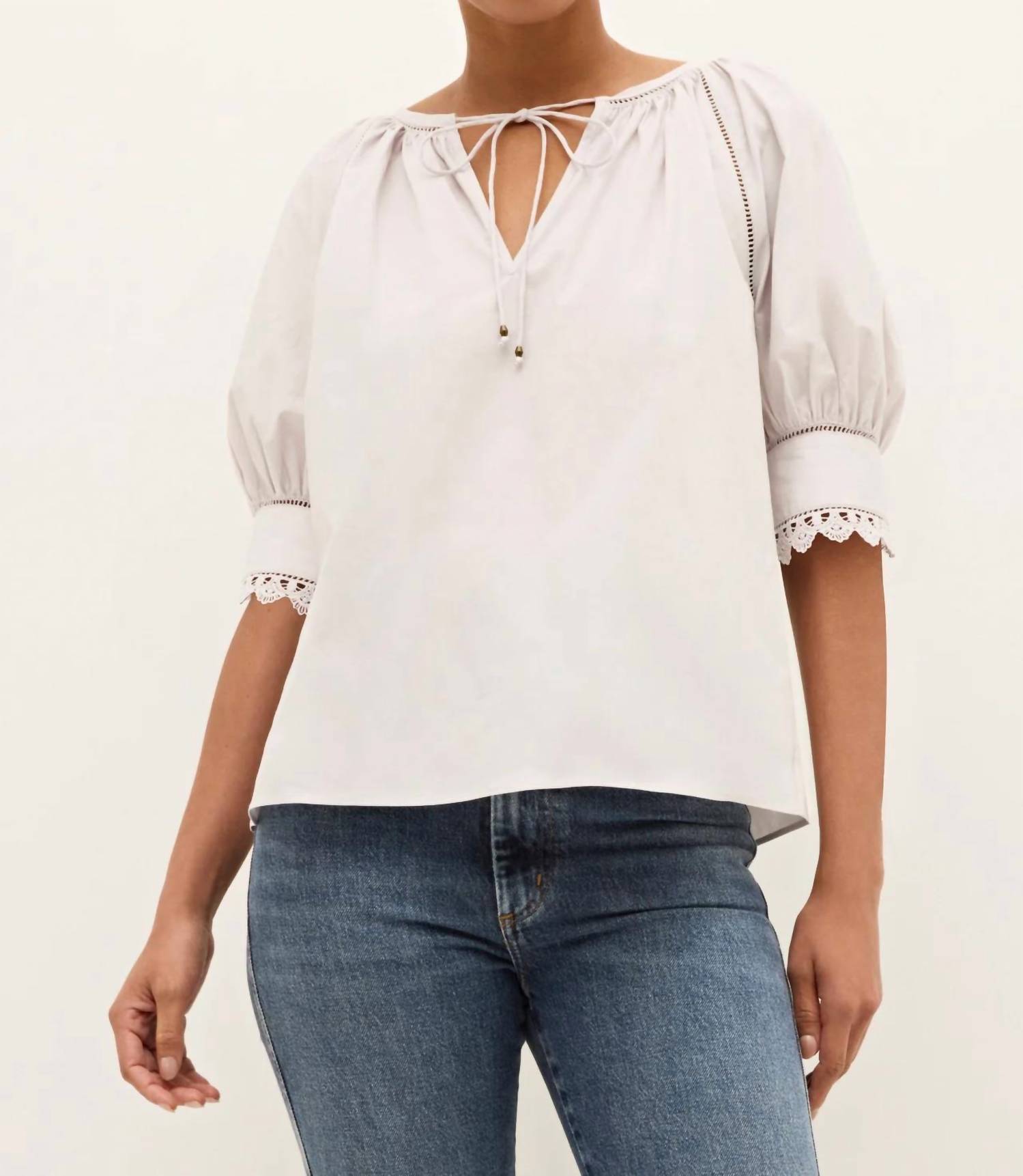 The short sleeve tee you'll want in every color. Every fall wardrobe needs a great “jean top,” and Lilianna is just that top. The slip-on silhouette features a flattering v-neck with beaded ties and embroidered trim along the ¾-length cuffs. Lilianna is pictured here in Antarctica.