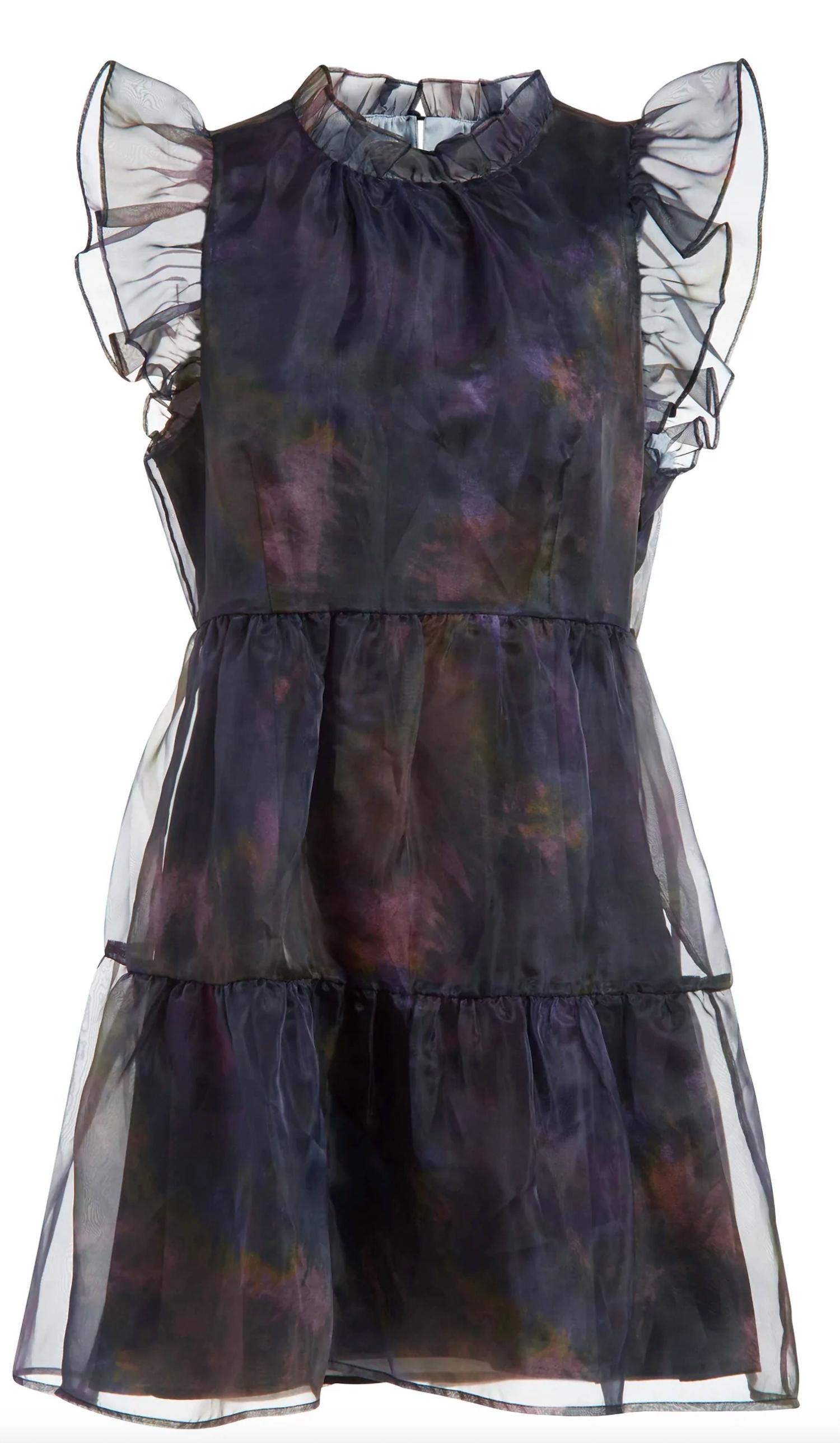 The kind of easy and flattering dress you'll be reaching for all season long. Introducing the Taren Dress by Marie Oliver, a chic and romantic choice for your cocktail party or New Year's Eve event. This mini dress in Moon Dye color features cap sleeves, a scoop neckline, and a trendy 90s-inspired pattern. Designed with a tiered A-line silhouette and a lined polyester bodice overlaid with organza, it exudes elegance and edge. Closure: Hook and eye closure.