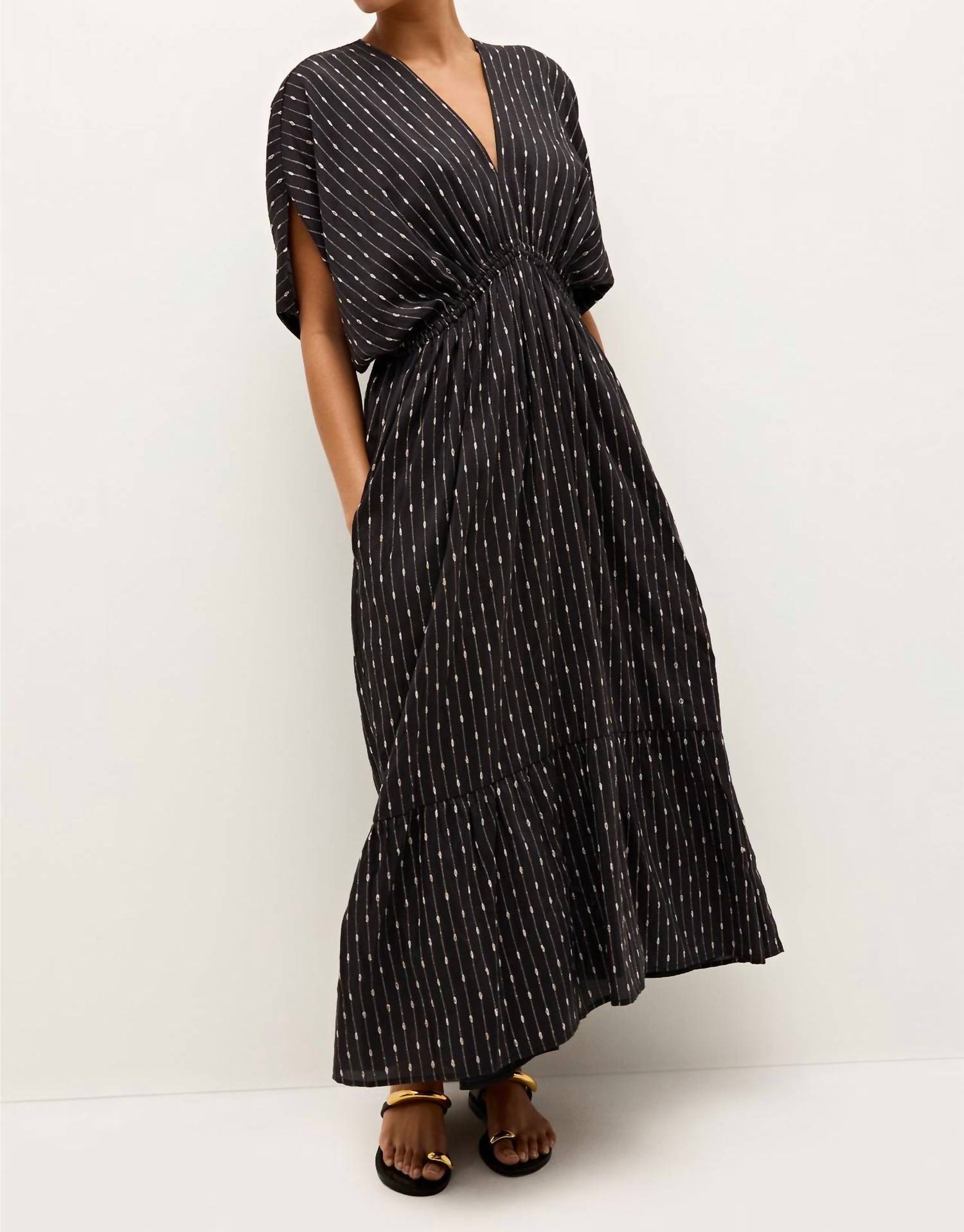 A maxi dress that is just as cute as it is comfortable. Introducing the Venus Maxi Dress by Marie Oliver, a captivating piece in a molten color that will have you dreaming of beach getaways. This kaftan silhouette boasts cap sleeves, a cinched elastic waist, and a slip-on style for effortless elegance. Crafted from a luxurious blend of 42% Cotton, 30% Silk, and 28% Polyester, this dress features side seam pockets and an optional hook and eye closure at the neckline. Care is simple with dry clean instructions, ensuring it remains a staple for summer dinner parties.