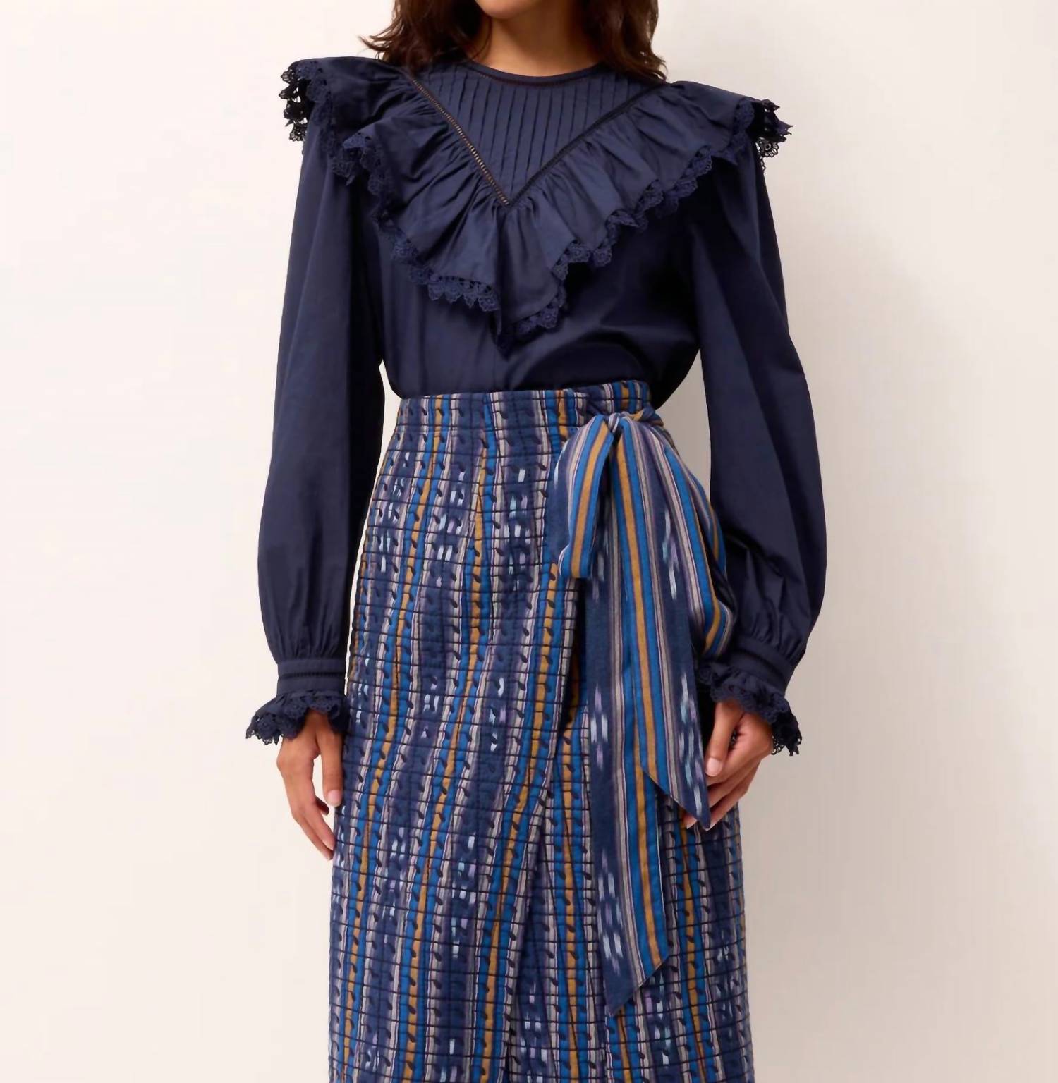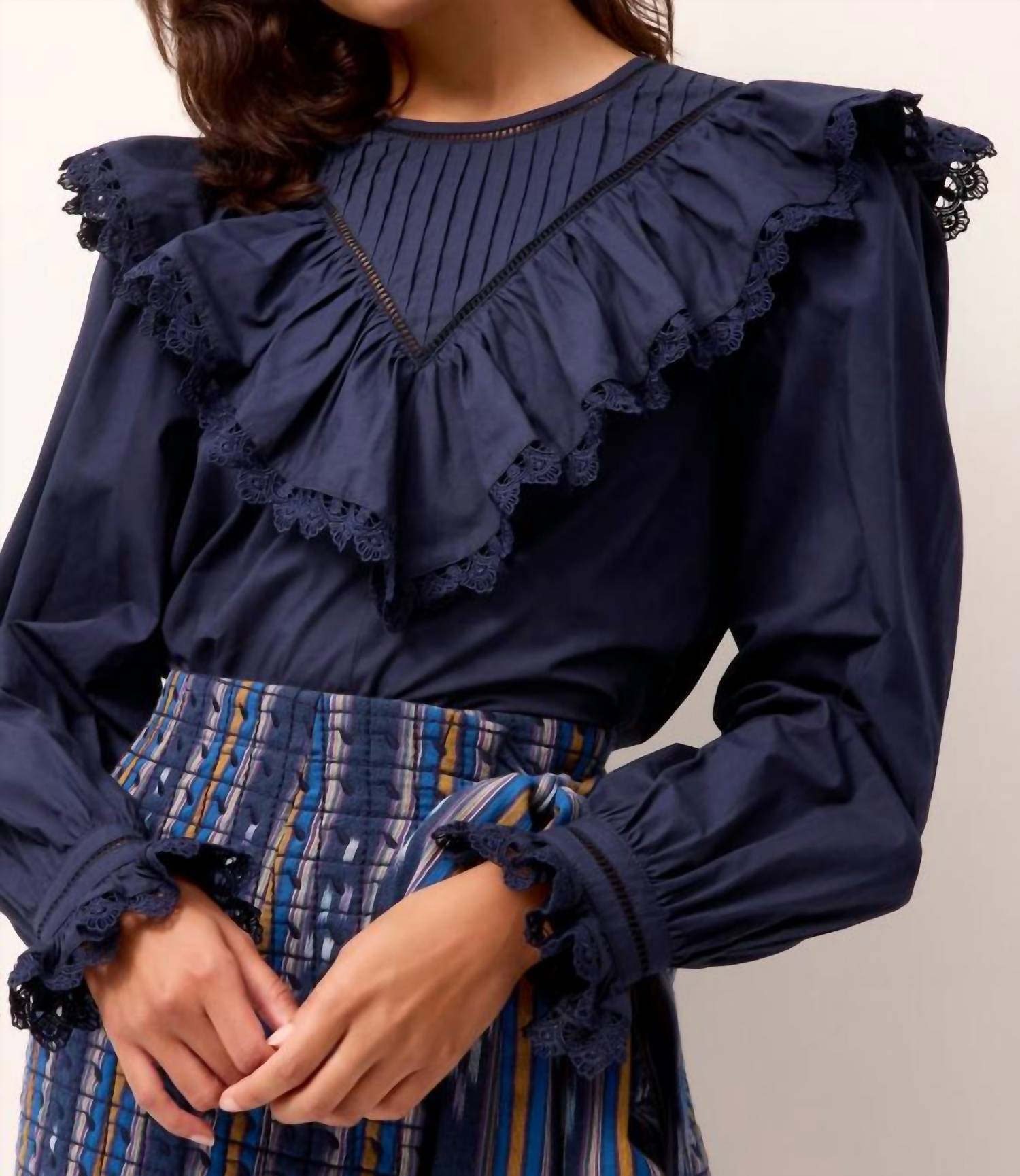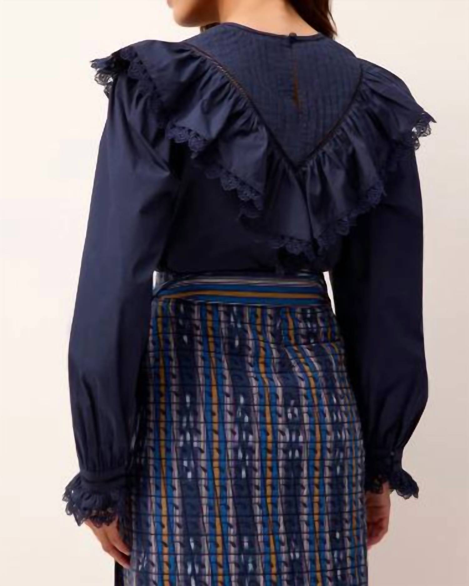 Pair this with your favorite jeans and slides for your next girls night out. Embrace elegance with the Women's Carissa Top by Marie Oliver, showcasing long sleeves and crafted from 100% cotton poplin in a stunning naval color. This solid blouse features statement-making details like a pleated yoke, V-shaped ruffle, and intricate embroidered edging. Designed with a slip-on silhouette, it closes with a button and elastic loop at the center back neck keyhole. Perfect for a vacation in spring, machine wash on a gentle cycle and hang dry for easy care.