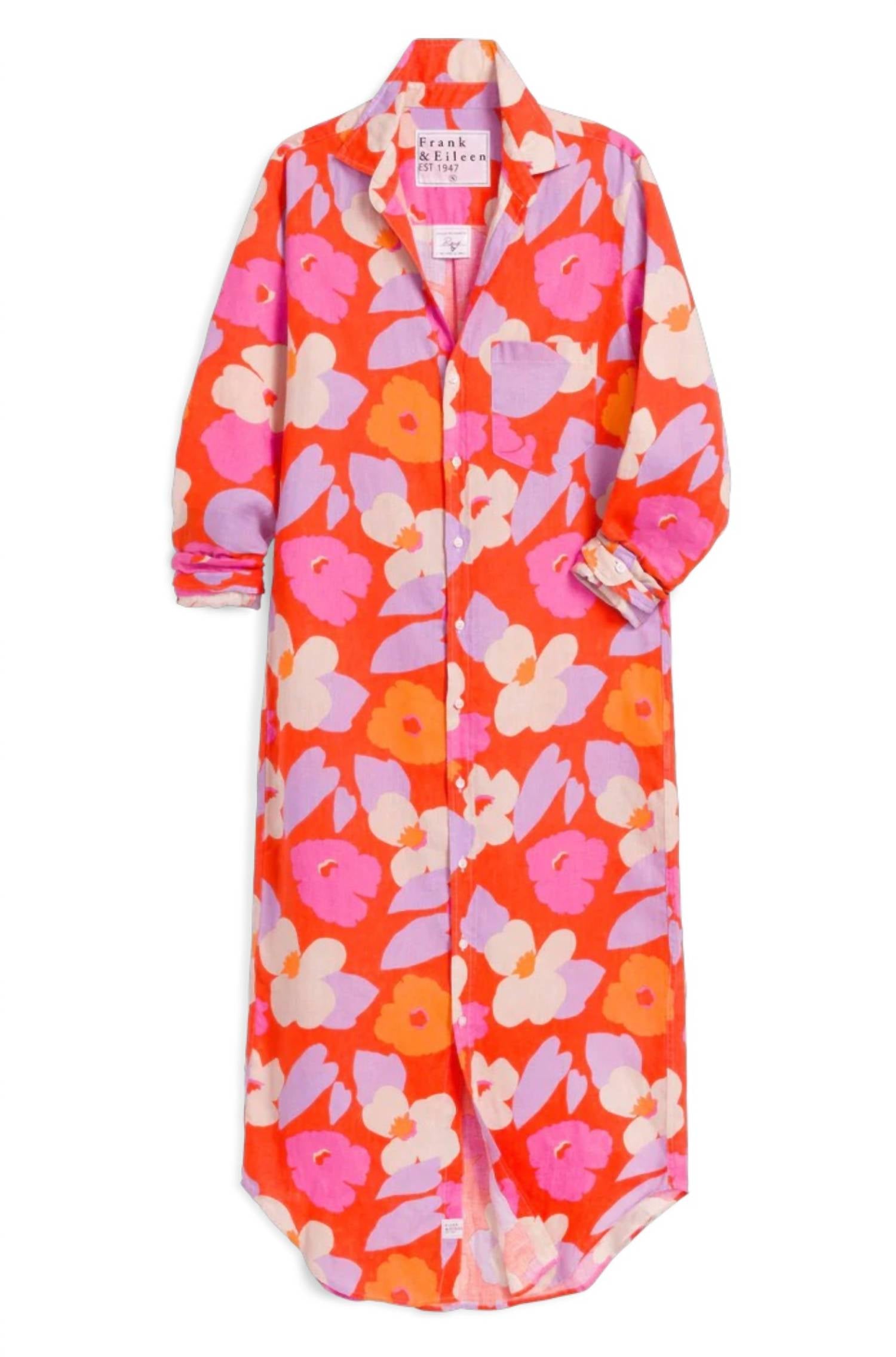 Who doesn't love a good maxi dress? This one you'll be reaching for season after season. Discover the Rory Maxi Shirtdress by Frank & Eileen, your go-to piece for breezy chic style this season. Featuring long sleeves with button cuffs and a flattering maxi length of 47 inches, this dress is crafted from premium 100% Italian Linen and showcases a vibrant Orange/Pink floral pattern perfect for that vacation vibe. Its design includes a shirttail hem and signature bust-flattering button placement along with a handy chest pocket. Closure: Front button closure. Care: Machine wash cold and tumble dry low for easy maintenance.