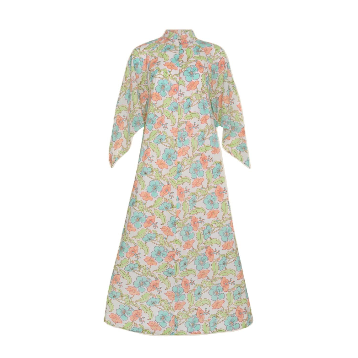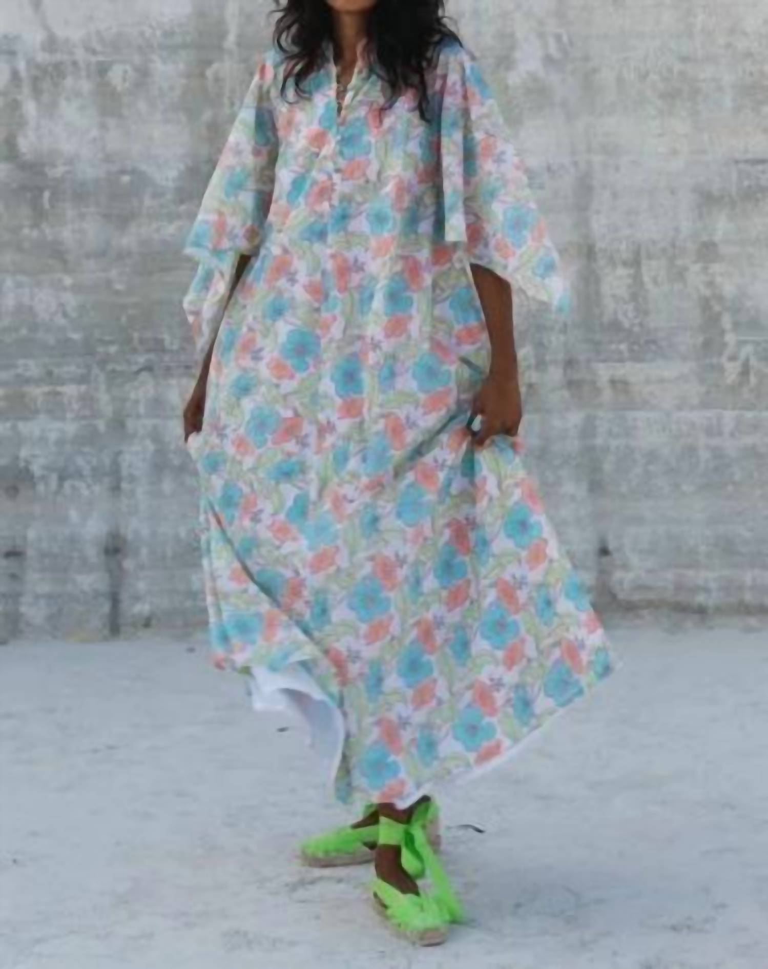 A maxi dress that is just as cute as it is comfortable. Introducing the Artemisia Dress by SZ Blockprints, an ideal choice for a boho-chic look this Spring. This piece showcases short sleeves paired with a shift silhouette, perfect for wafting around in style. Crafted from 100% Indian cotton and hand block printed in an array of neon floral patterns, it promises comfort and uniqueness. Closure: Button closure.