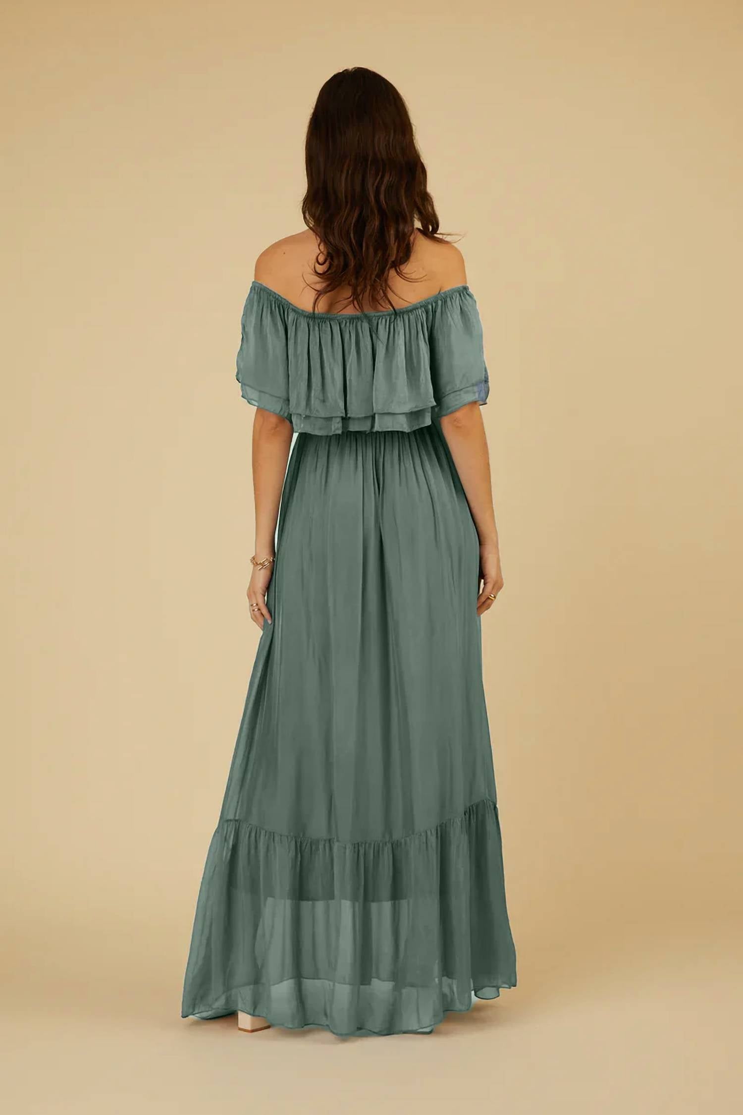 A maxi dress that is just as cute as it is comfortable. The Laurie Dress by Scandal Italy in a stunning Pepe Rose hue epitomizes glamour with its luxurious Italian silk blend composition, including a soft silk overlay and a full lining for added elegance. This women’s off-the-shoulder maxi dress, perfect for bridesmaids or any special occasion, features a comfortable elastic waist. Composition: 30% Silk, 70% Viscose, with a lining of 95% Viscose and 5% Elastic. Care: Wash on a delicate cycle and lay flat or hang to dry.