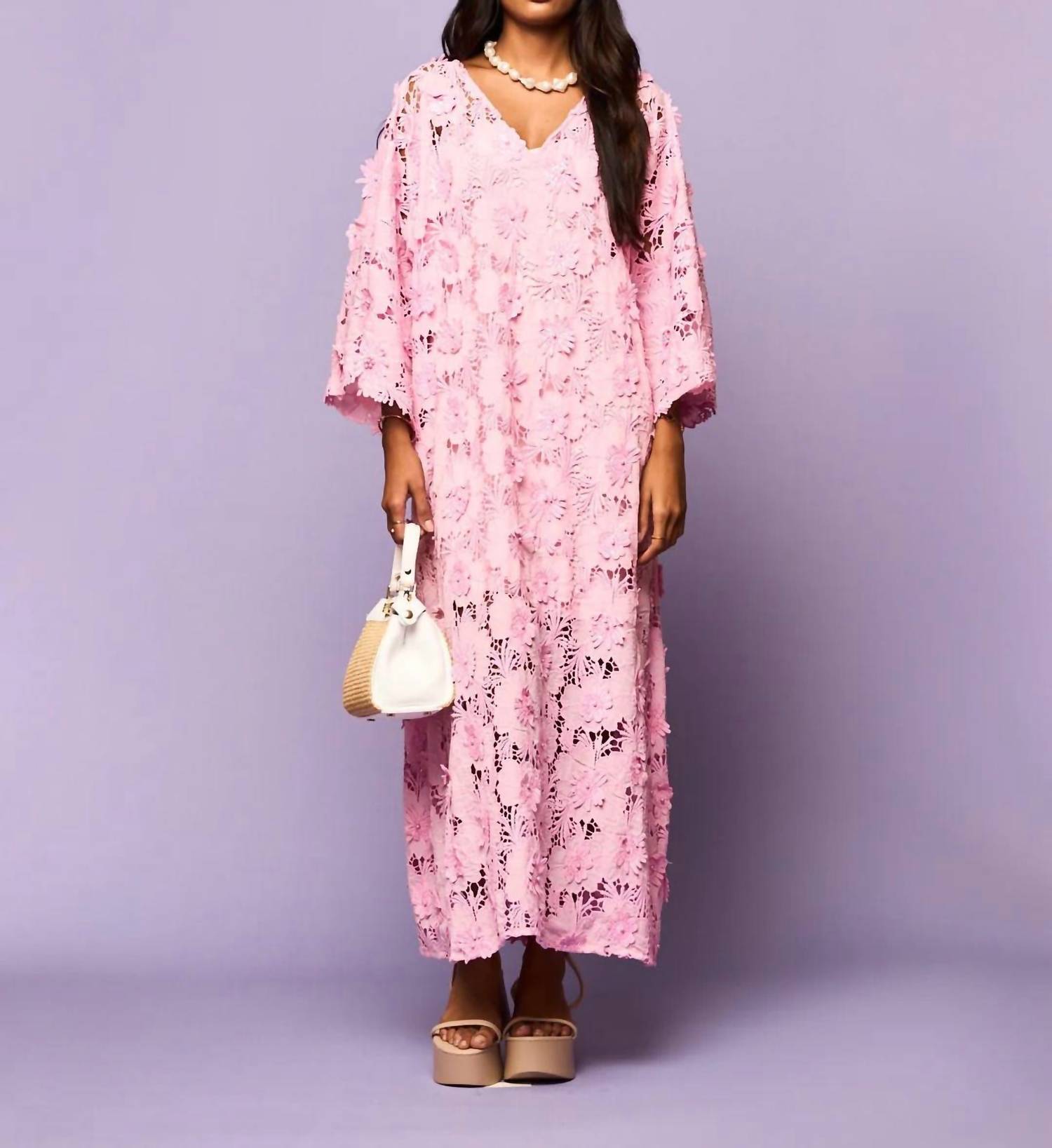 A maxi dress that is just as cute as it is comfortable. The Palm Beach Proper Maxi Dress by Tela effortlessly combines elegance with boho chic, perfect for summer vacations. Crafted from textured pink lace, this one-size-fits-all kaftan. Perfect for S-XXL offers a flowing silhouette with a shoulder-to-hem length of 50 inches. It features long sleeves, a flattering V-neckline, and a convenient pull-on closure for a relaxed yet sophisticated look. Care for this delicate piece is simple: spot or wipe clean.