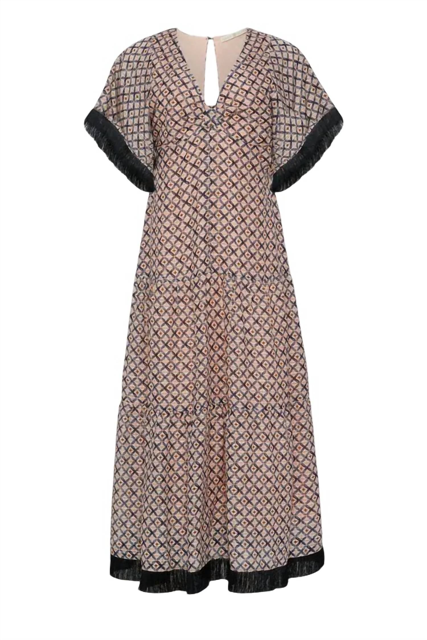 Who doesn't love a good maxi dress? This one you'll be reaching for season after season. Introducing the Marie Oliver Bernadette Maxi Dress, a stunning piece in a Blush Lattice pattern exuding Boho Chic elegance. This A-line silhouette dress features short sleeves and a feminine V-neckline, crafted from a viscose and linen blend for comfort and style. With button closure details and a keyhole back, this dress is perfect for spring vacation or a New Year's Eve celebration. Care instructions specify dry clean only. 56% Viscose, 44% Linen.