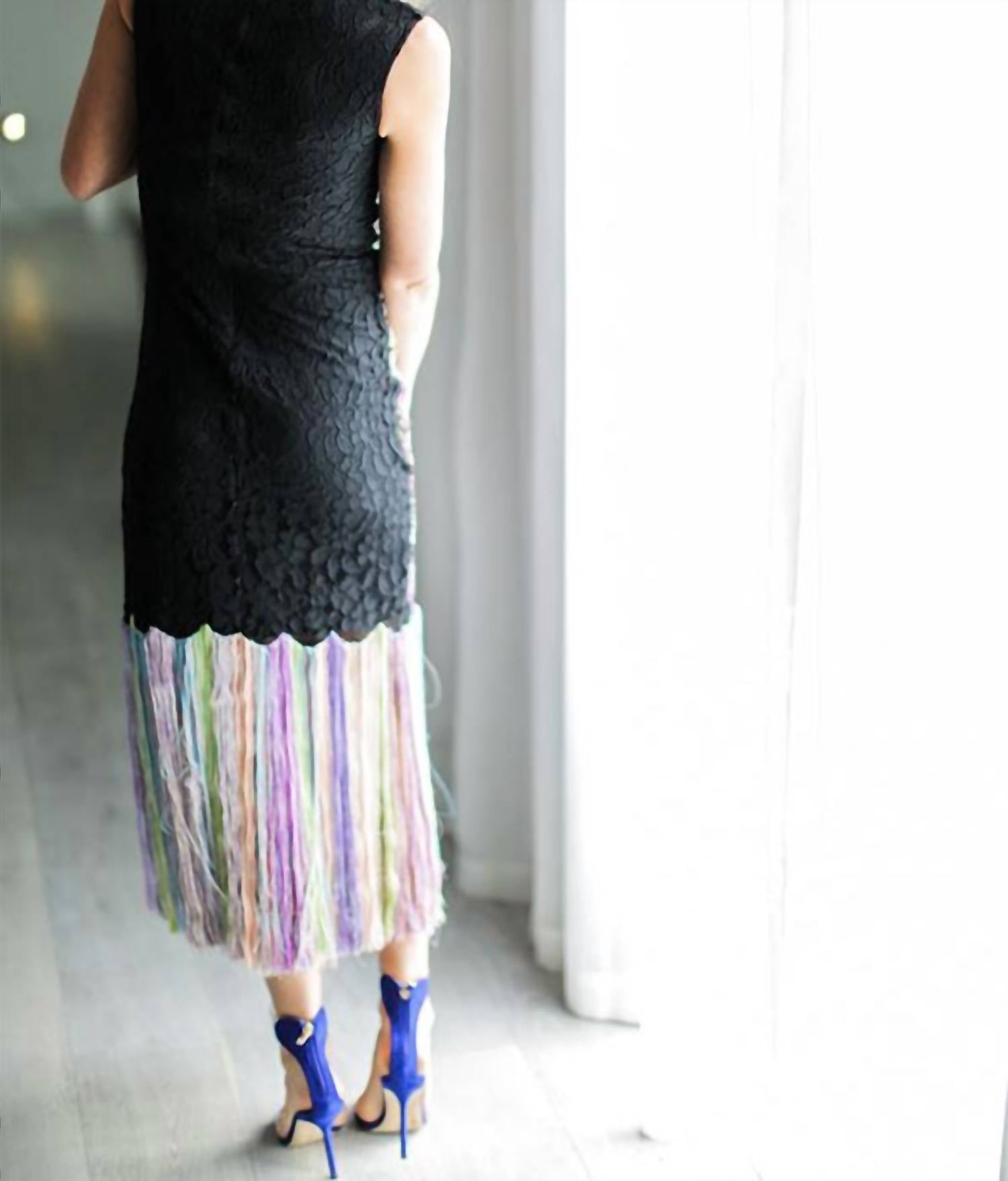 A maxi dress that is just as cute as it is comfortable. The Fireworks Concerto Lace Dress by Romance Was Born is a striking black maxi dress that embodies a maximalist trend with its intricate patterned lace design. Featuring a sleeveless sheath silhouette with a scoopneck, it is perfect for a dinner party or New Year's Eve celebration. It includes a zip closure for easy wear and is meticulously crafted with embroidered front details and multi-colored silk fringe hem, adding vibrant dimensions to the composition. Please note it runs small and requires dry cleaning for optimal care.