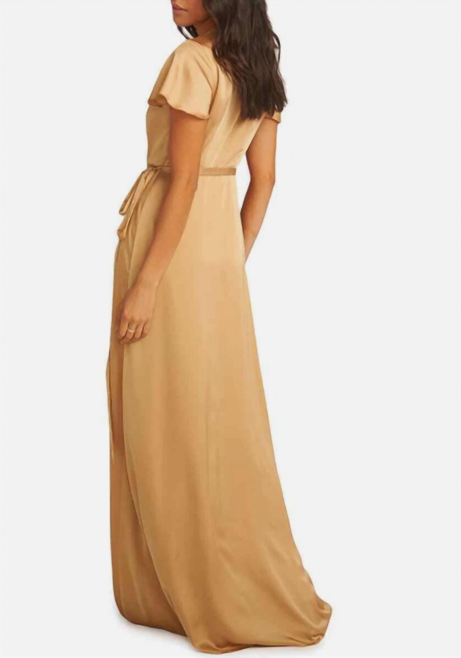 A maxi dress that is just as cute as it is comfortable. Step into elegance with the Noelle Satin Wrap Maxi Long Dress by Show Me Your Mumu. This flowing A-line maxi dress in a stunning gold hue features short ruffled sleeves and a sophisticated surplice V-neckline. Crafted from 100% polyester, it measures 62" in length, with dimensions including a shoulder width of 13.5", chest width of 16.5", sleeve length of 6.5", and waist width of 12.5". The true wrap style and tie waist enhance its classic fit, offering a graceful silhouette perfect for any special occasion. Care instructions: hand wash and dry flat.