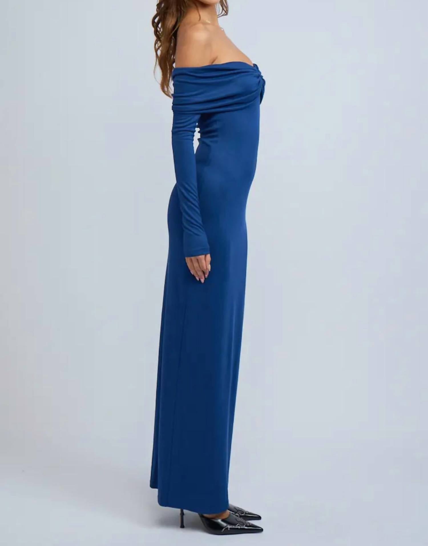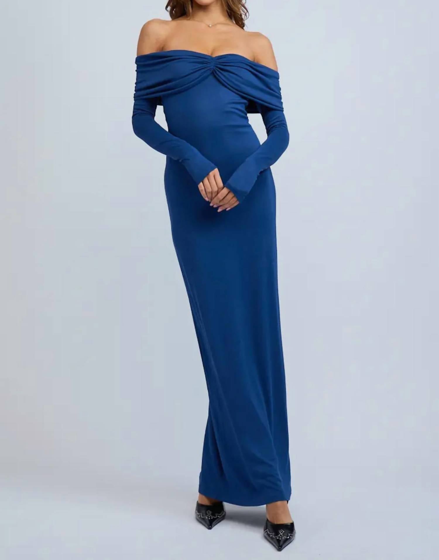 Who doesn't love a good maxi dress? This one you'll be reaching for season after season. Introducing the Off Shoulder Ruched Retro Maxi Dress by Sky to Moon, a stunning choice for evening events. This sheath silhouette dress in solid blue boasts a minimalist design with long sleeves and an elegant off-the-shoulder neckline, perfect for New Year's Eve celebrations. Crafted from a luxurious blend of materials including 73% Modal and 27% Cotton, it offers a flattering fit. Care for this exquisite piece with dry cleaning.