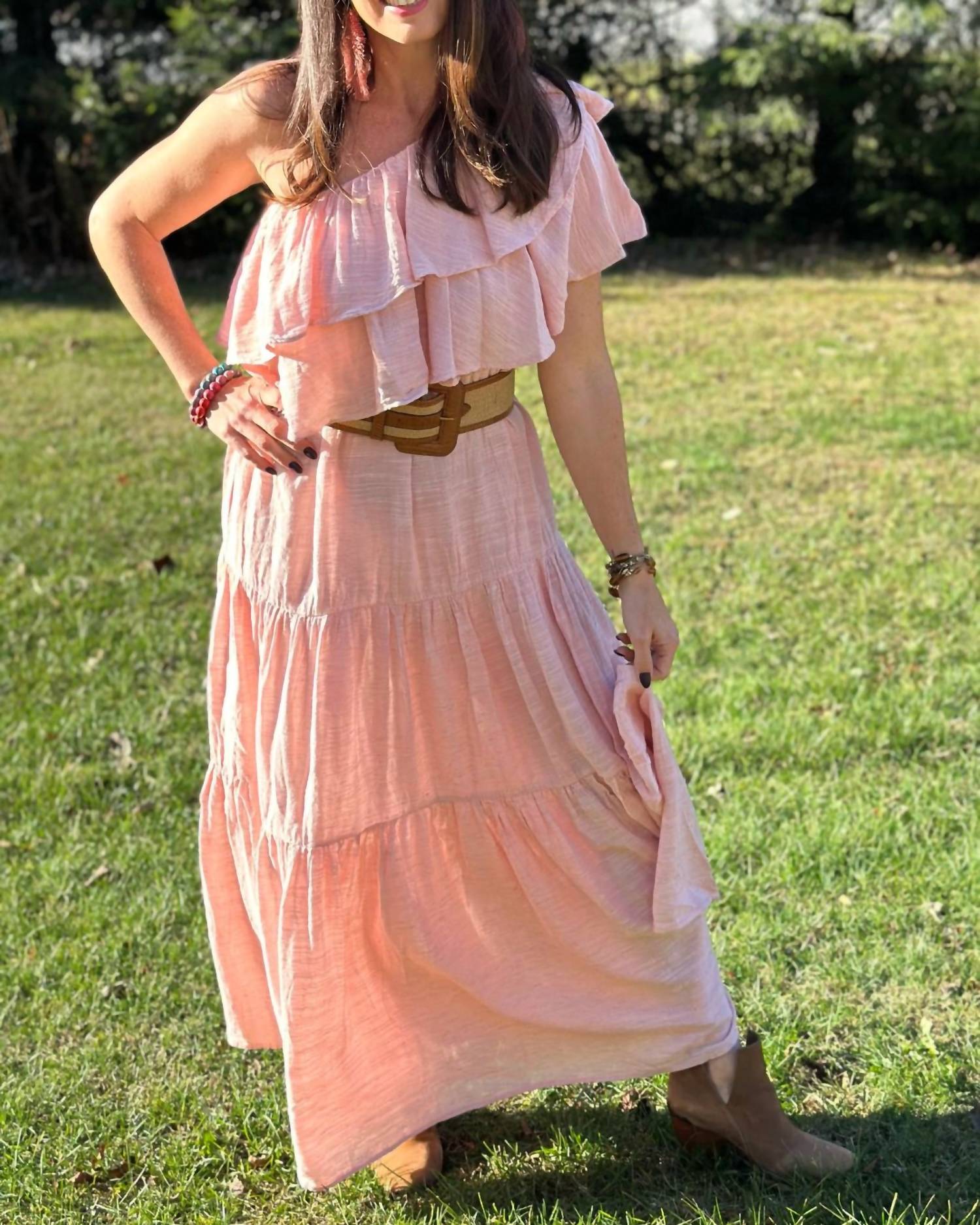 A maxi dress that is just as cute as it is comfortable. Elevate your vacation wardrobe with the Anna One Shoulder Ruffle Maxi Dress from Pearl and Caviar in a striking pink hue. Designed with a short sleeve off-the-shoulder neckline, this dress features a ruffled top layer and a tied waist belt for a flattering A-line silhouette. Crafted from a 30% linen, 40% cotton, and 30% tencel blend, it is lightweight and breathable, perfect for warm spring days. Closure is pull-on, and care is hand wash only.