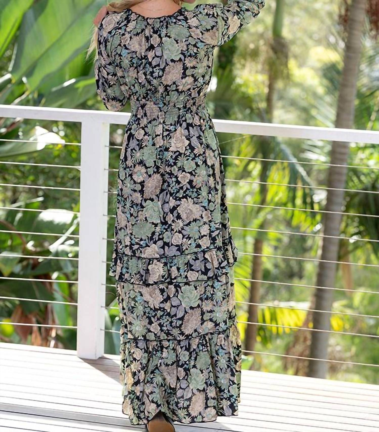 Style this maxi with your favorite statement necklace and sandals for the perfect look. Imagine wrapping yourself in a midnight garden where silver roses and sage-green leaves dance together in the moonlight – that's the magic of the GIA maxi dress. Those dreamy bishop sleeves and perfectly placed tiers aren't just design elements; they're like gentle whispers of confidence as you move through your day. The dress feels like it was created by someone who really gets it – amazing silk blend that's super wrinkle fee and luxurious. The deep V-neckline creates that perfect "I woke up like this" sophistication, while the tiered ruffles add a playful bounce to every step. Paired with those edgy black boots, it's giving "I could be heading to a secret garden party or just grabbing coffee – you'll never know!" energy. The moody gold embellished florals in sage and ivory on that black background tell a story that changes with every light – like wearing a piece of enchanted art that just happens to have pockets (because yes, practical magic is totally a thing!). The dress can easily transition to evening wear with a change of accessories. Add a sweater over for cooler weather. The airy poly/silk blend fabric is extraordinary. 70% Poly 30% Silk