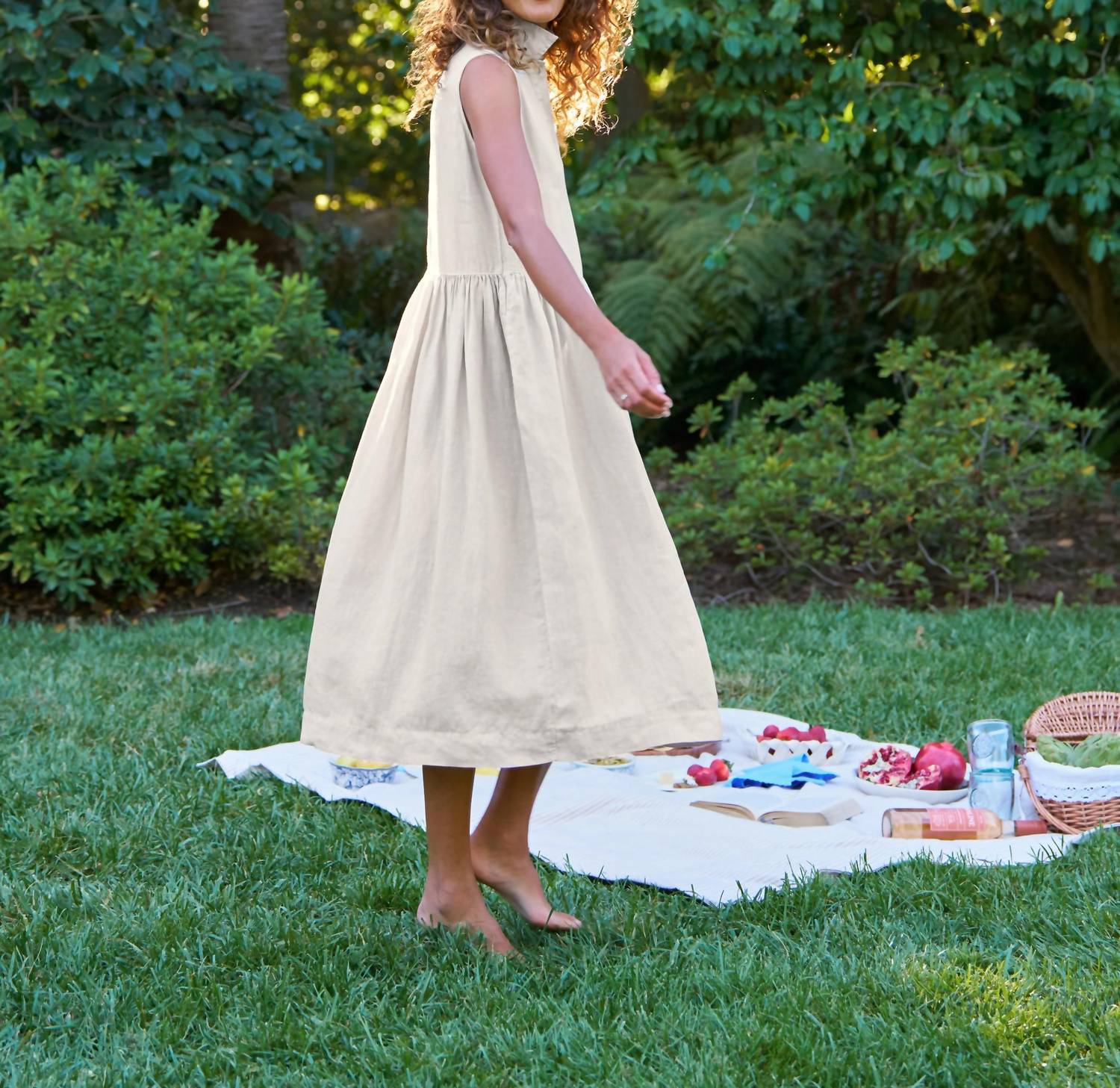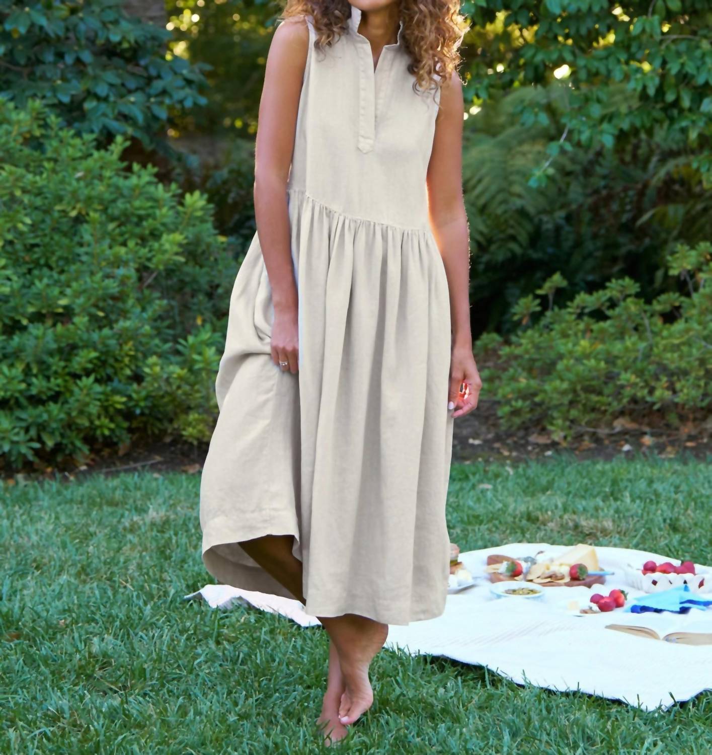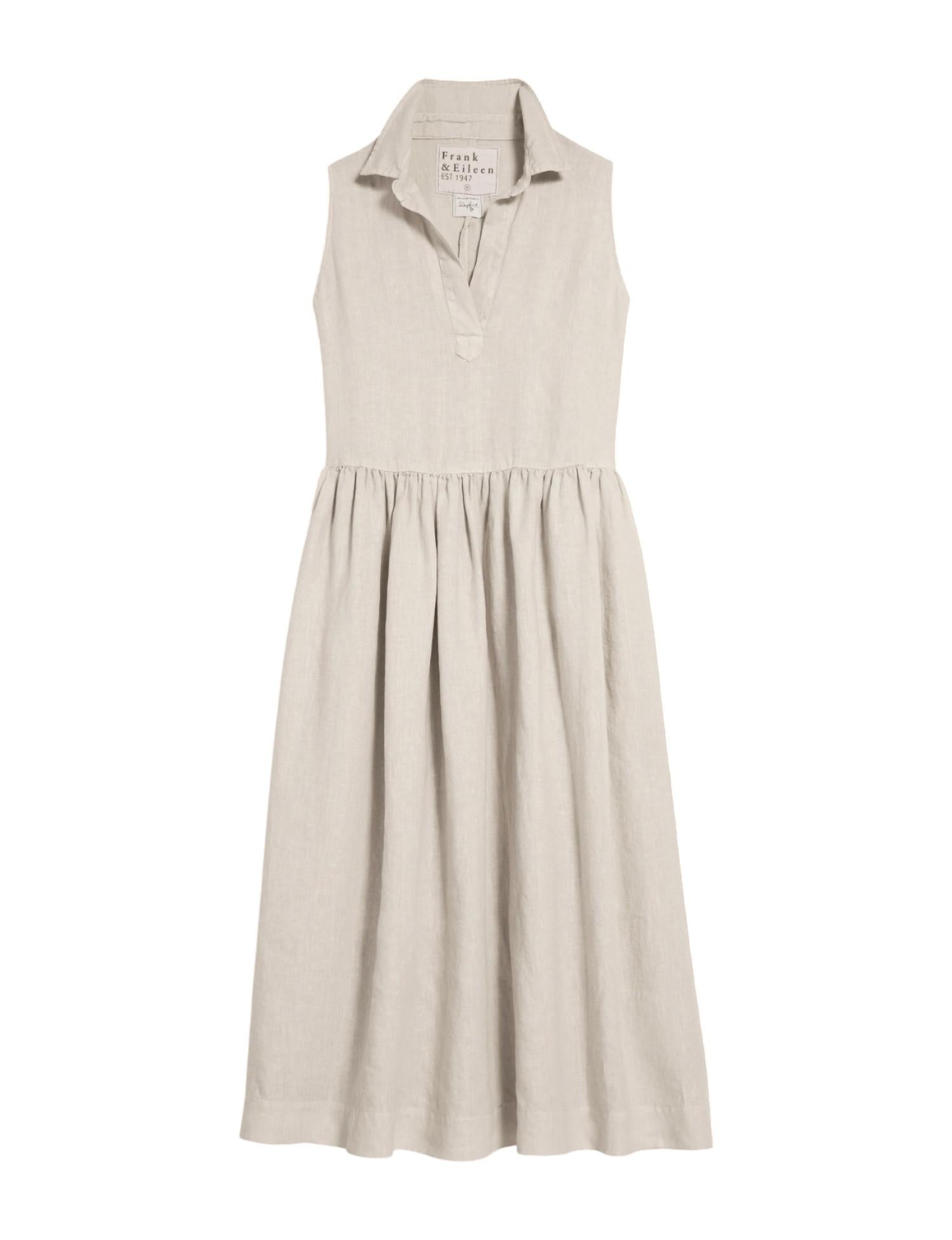 Who doesn't love a good maxi dress? This one you'll be reaching for season after season. Introducing the Daphne Sleeveless Popover Dress by Frank & Eileen, an effortlessly chic maxi designed for the ultimate minimalist style. This versatile sand-hued dress features a collared V-neckline, a gathered skirt at natural waist, and convenient side hip pockets. Crafted from 100% Linen, it offers easy elegance with its pull-on design and sleeveless silhouette. Care instructions include machine wash and tumble dry, with a garment length at 49 inches from shoulder to hem for a flattering fit.