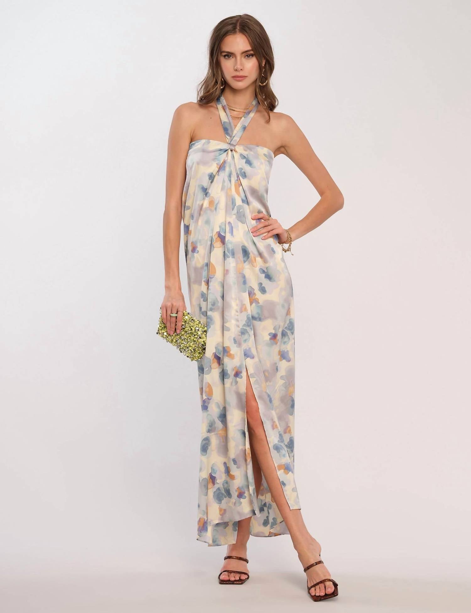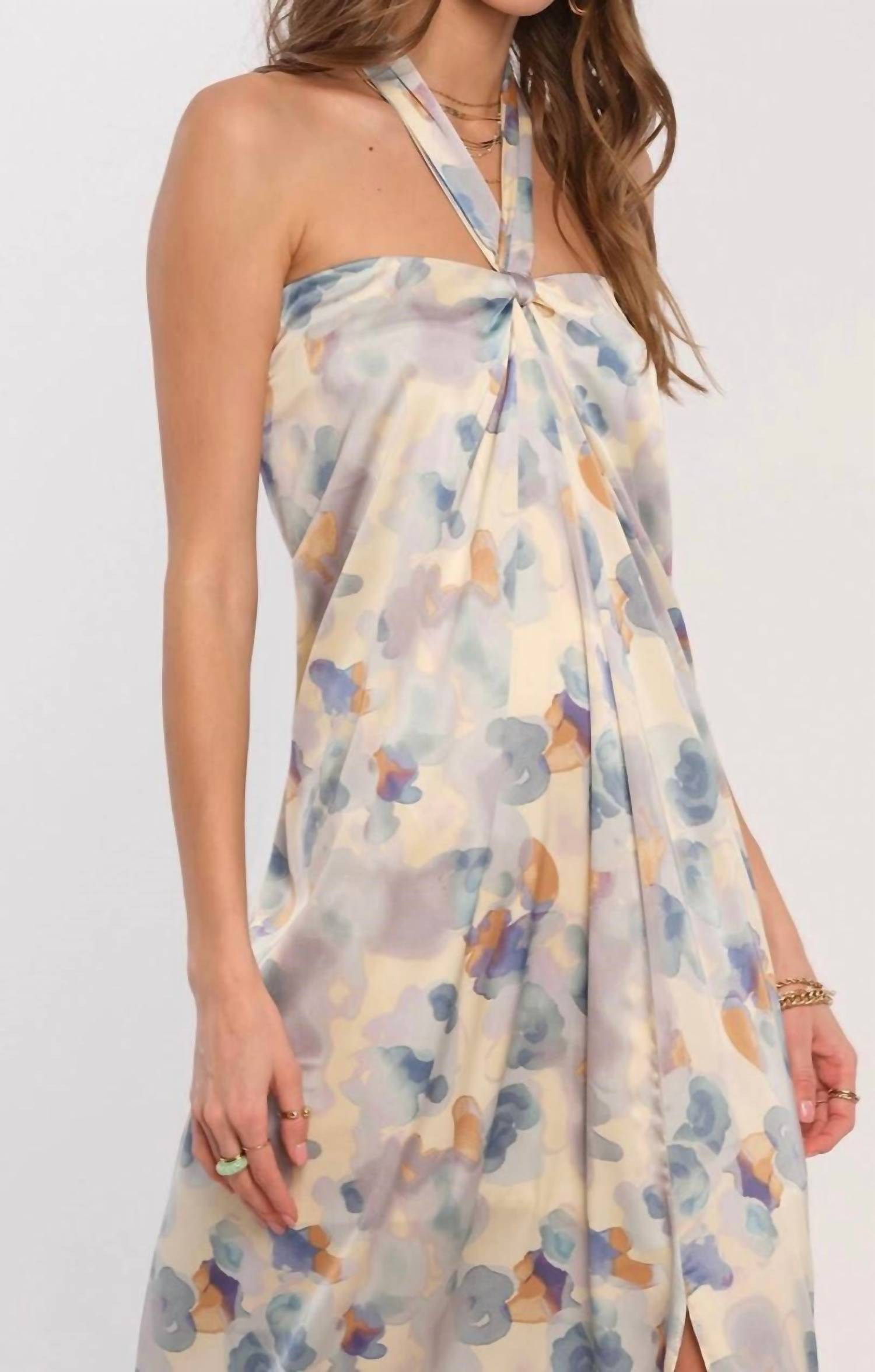 A maxi dress that is just as cute as it is comfortable. Unveil elegance with the Heartloom Kai Maxi Dress, designed in a captivating cloud pattern. This polyester masterpiece flaunts a sleeveless, halter neckline and a zip closure, ensuring a flattering fit. With a graceful 49.5-inch slip silhouette and a maxi length punctuated by a front slit, it's the epitome of boho chic for spring occasions. Ideal for holiday parties like Thanksgiving, this dress seamlessly blends sophistication and style.