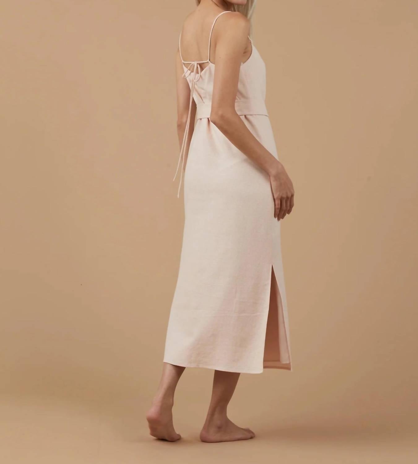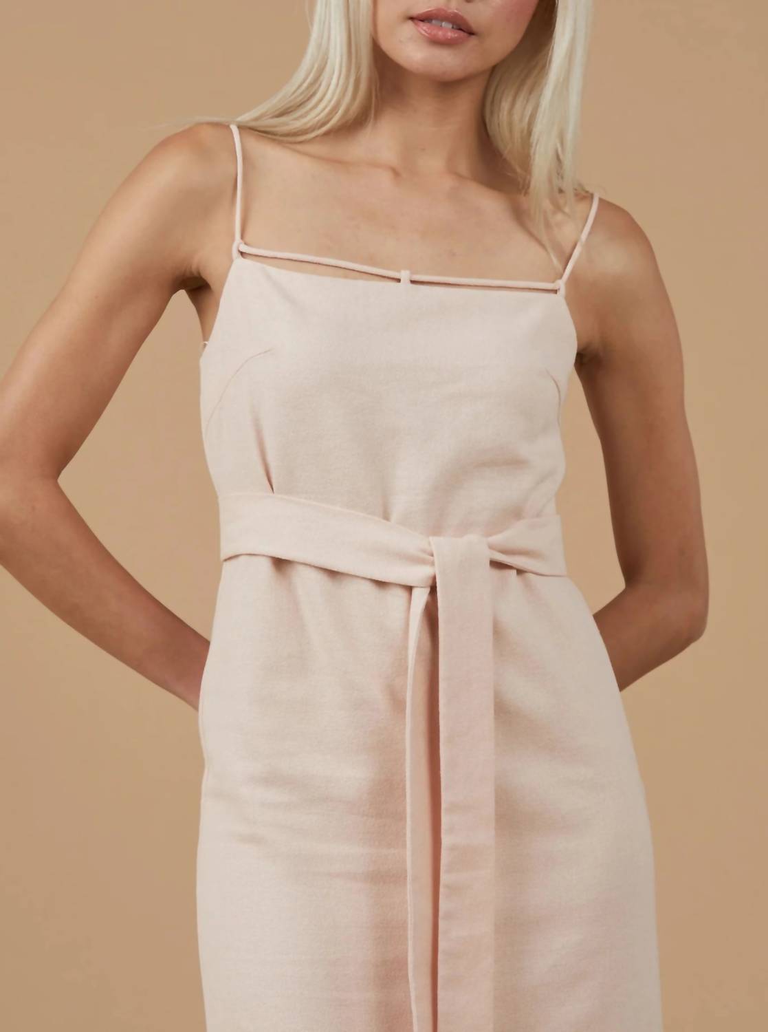 Style this maxi with your favorite statement necklace and sandals for the perfect look. Embrace elegance with the Margo Dress by Sophie Rue, a sophisticated choice perfect for day-to-night transitions. Designed with spaghetti straps and a flattering square neckline, this shift silhouette maxi dress offers a refined look in classic pink. Crafted from a delicate blend of 55% Linen and 45% Tencel, it features a tie closure for a customized fit.