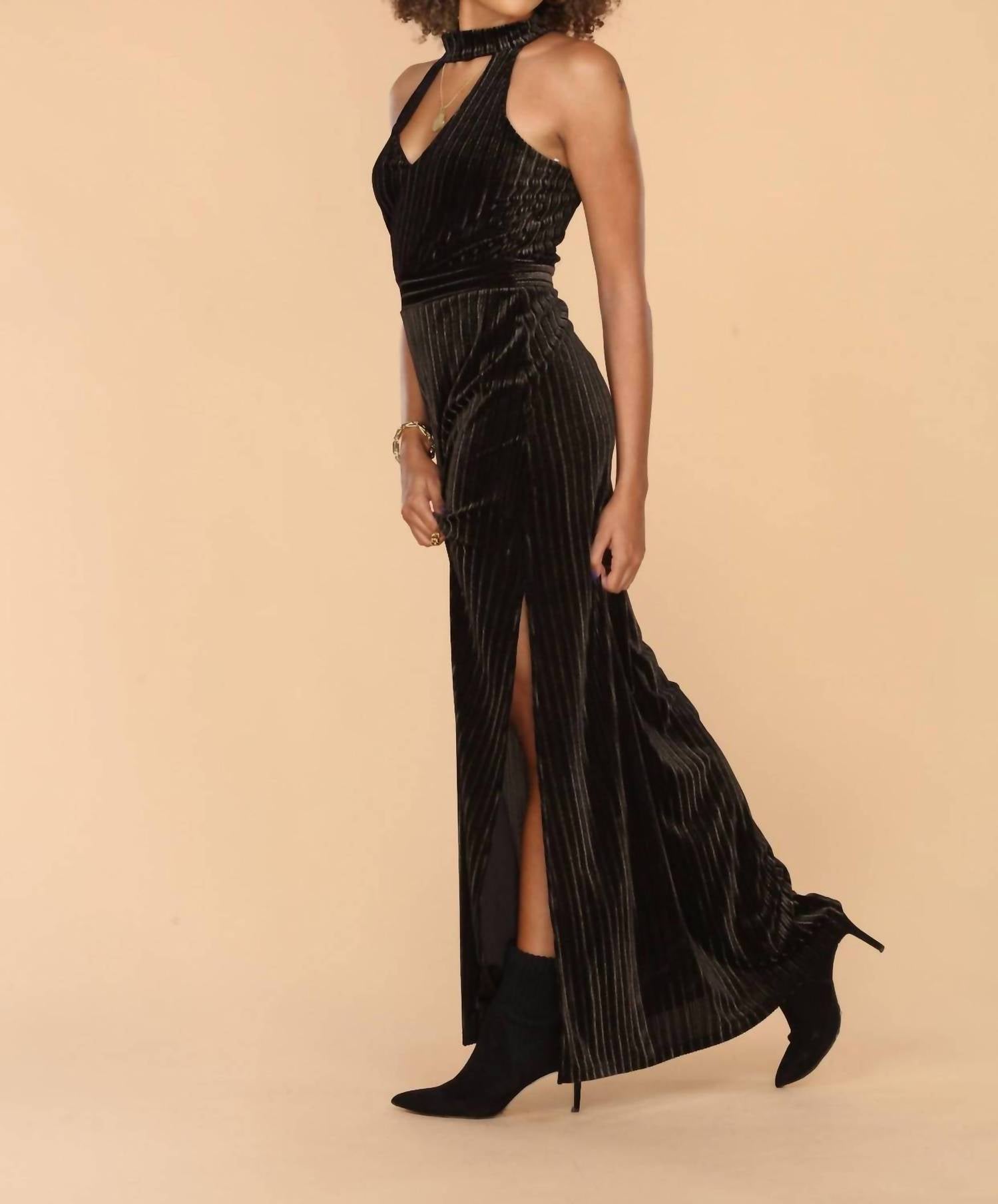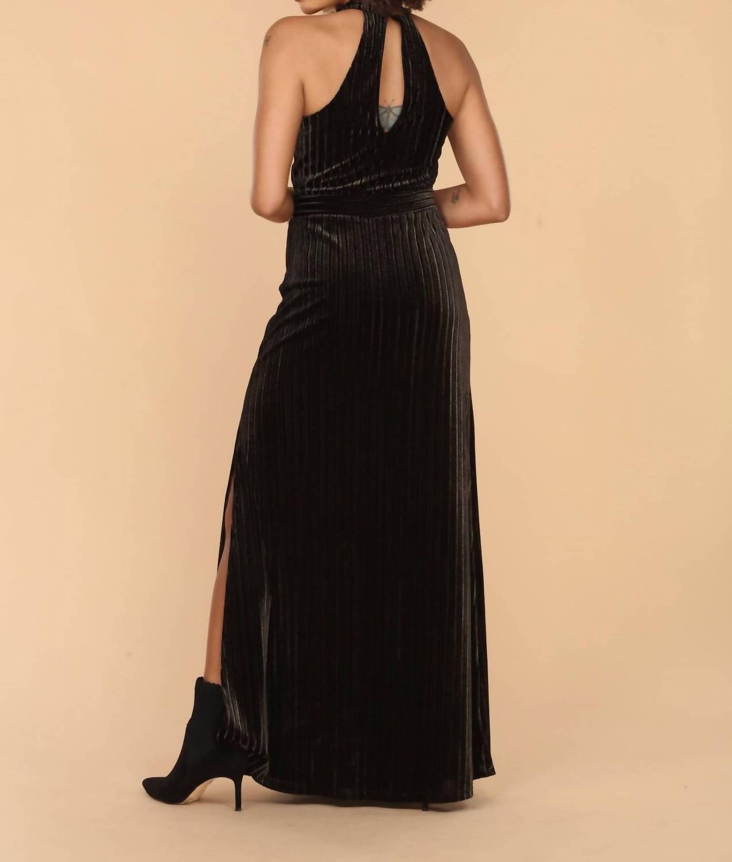Who doesn't love a good maxi dress? This one you'll be reaching for season after season. Ribbed Black Velvet Halter Neckline With Keyhole Back. High Side Slit. Maxi length. Sleeveless. 100% Velvet. Hang Wash Cold.