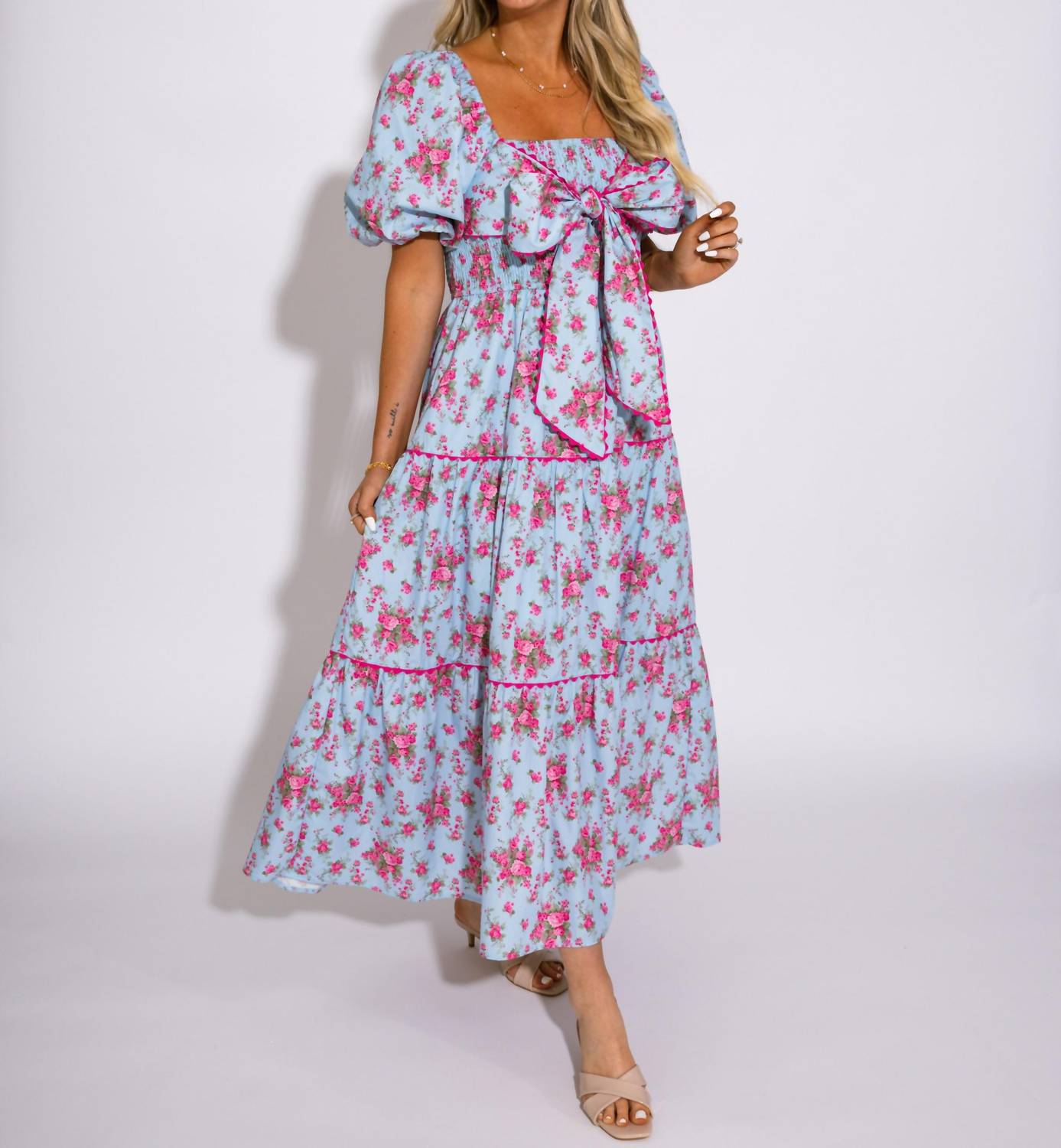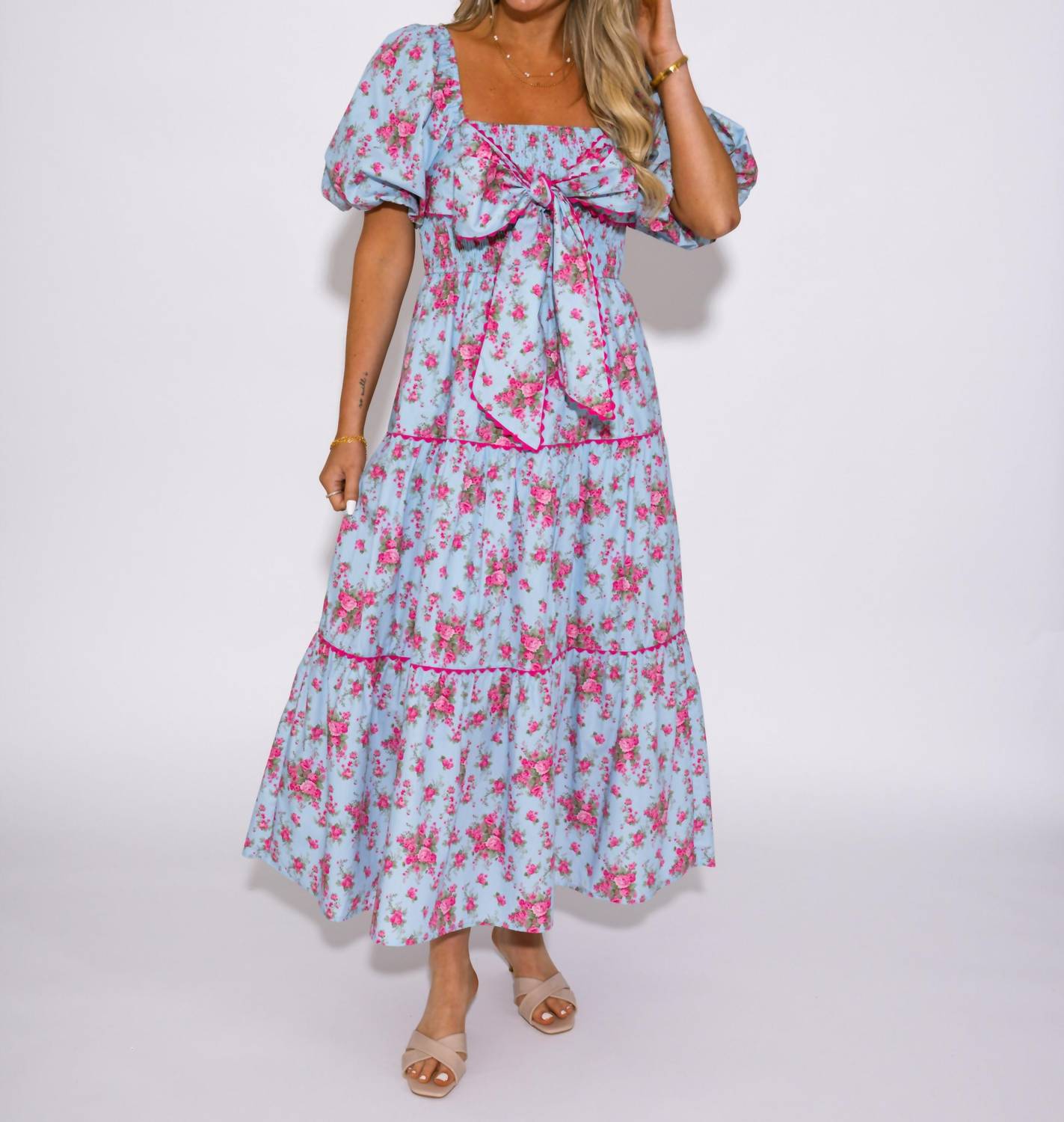 Who doesn't love a good maxi dress? This one you'll be reaching for season after season. Introducing the Bows and Blooms Tiered Maxi Dress by Peach Love, a delightful option for your spring wardrobe. This short sleeve, floral fit and flare dress is crafted from 100% Cotton and features a charming squareneck design. With a convenient pull-on closure, it embodies the boho chic trend. Care is simple with machine wash and tumble dry instructions.