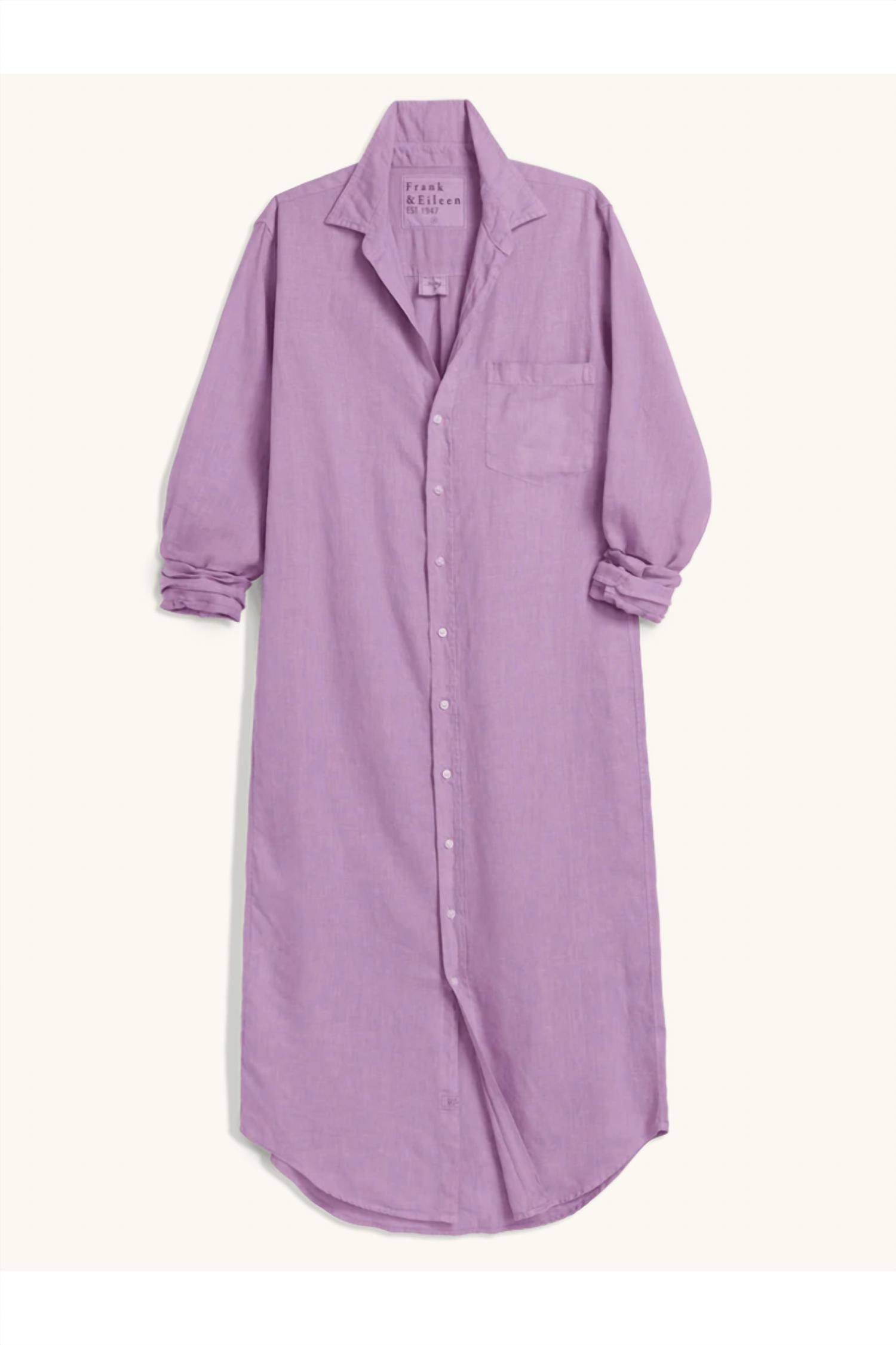 A maxi dress that is just as cute as it is comfortable. Elevate your summer wardrobe with the Rory Washed Linen Dress by Frank & Eileen in a serene lilac hue. This long-sleeve dress, crafted from 100% washed linen, promises a softer feel with each wear and features a shirttail hem and button cuffs, ensuring both style and comfort. Designed with an easy button closure, its maxi length flatters all heights with a loose, airy silhouette, enhanced by a chest pocket and signature bust-flattering button placement. Perfect for a baby shower or any sun-kissed occasion, Rory is your go-to summer staple.
