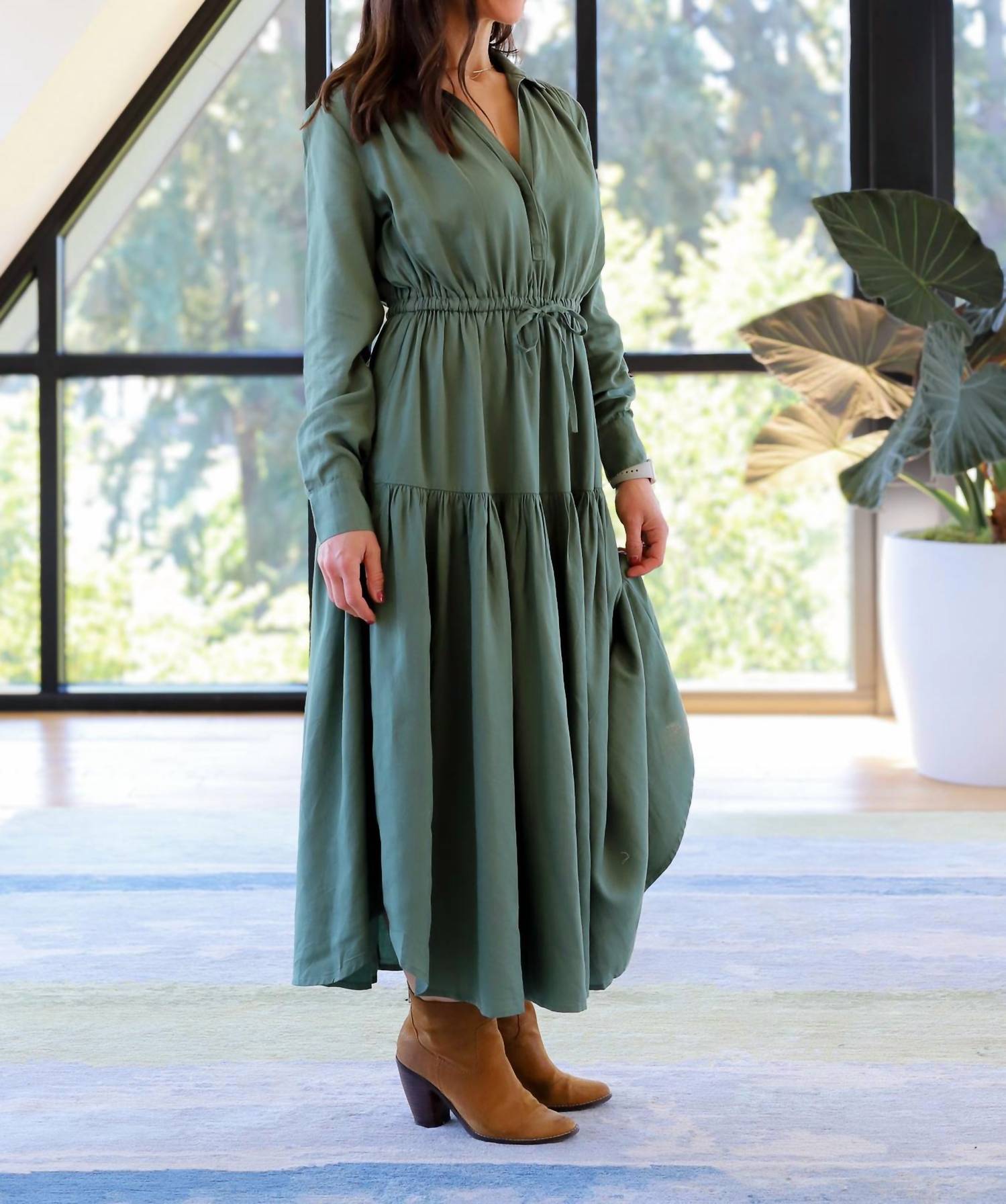 Style this maxi with your favorite statement necklace and sandals for the perfect look. Introducing the Scottsdale Maxi Dress by COREY LYNN CALTER, a stunning addition to your holiday party wardrobe. With long sleeves and a relaxed fit, this dress offers comfort and style in a bold Ivy hue. Crafted from 100% Lenzing Tencel/Lyocell, it features a drawstring at the waist, a snap front closure, and a tiered hem, offering an elegant A-line silhouette. Care is easy with machine-washable, Oeko Tex certified dyes. Perfectly blending soft comfort with sophisticated design, embodying the trend of quiet luxury.