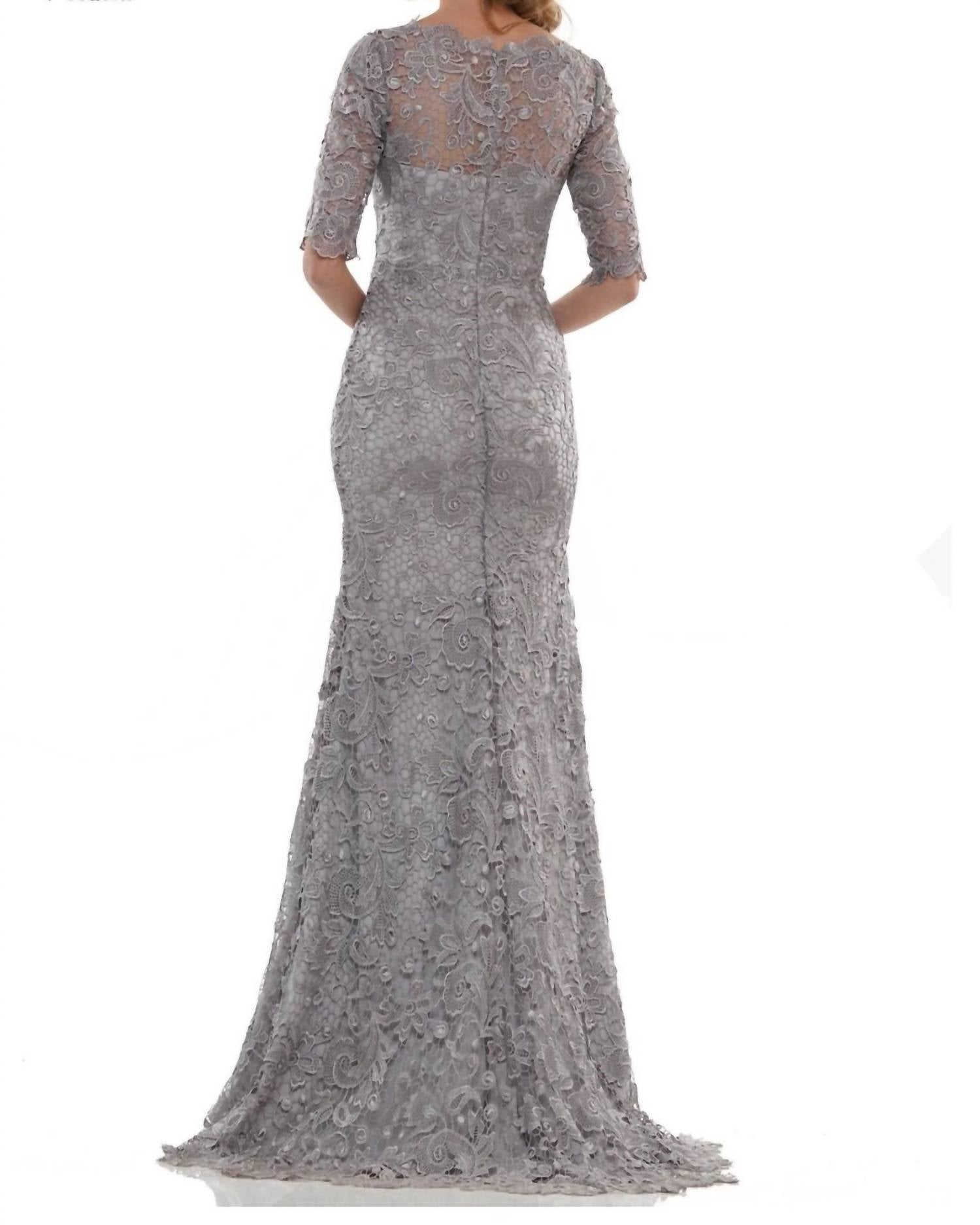 Style this maxi with your favorite statement necklace and sandals for the perfect look. Elevate your wedding look with the Marsoni Long Mother Of The Bride Lace Dress by COLORS DRESS. This textured, gray maxi dress features long sleeves and a V-neck neckline, complete with a flattering mermaid silhouette. Designed for women, it boasts a zip closure for a secure fit. Care instructions recommend dry cleaning to maintain its elegant appearance.