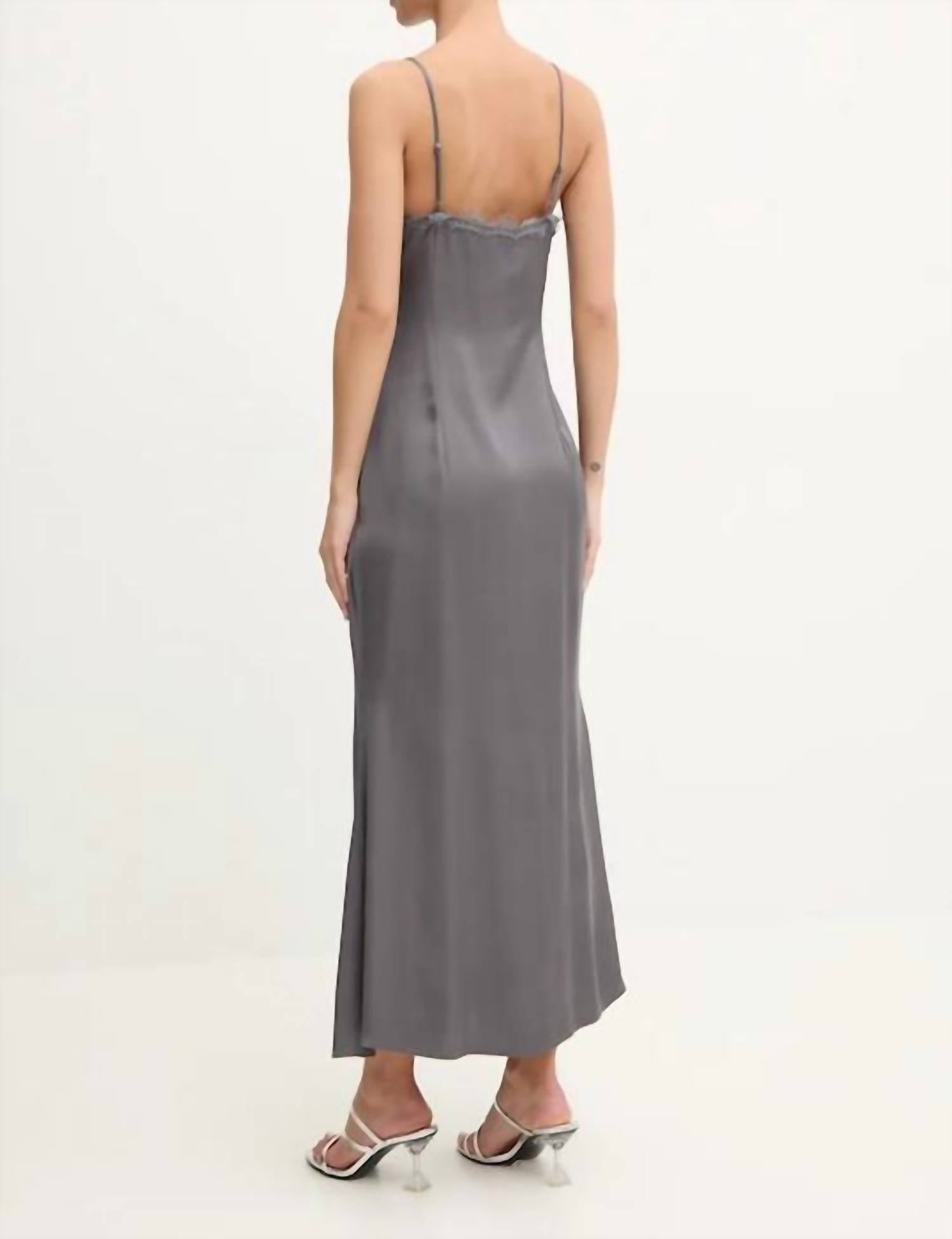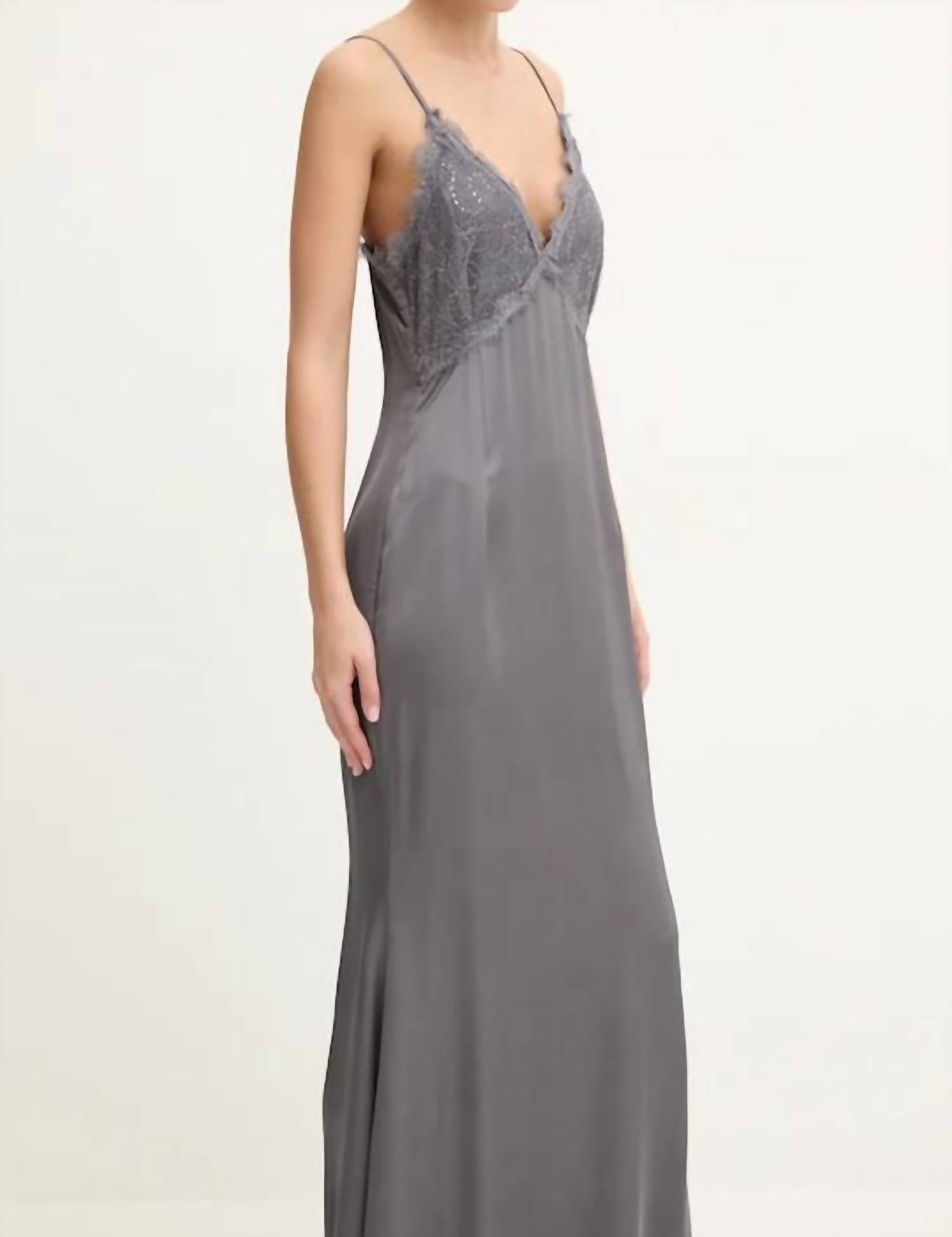Who doesn't love a good maxi dress? This one you'll be reaching for season after season. Elevate your evening wardrobe with the Reha Maxi Dress by Never Fully Dressed, a chic choice for any occasion. Featuring sultry spaghetti straps and a V-neckline, this dress accentuates your curves with its dark grey satin finish, complete with lace detailing along the bodice. Composition: 100% Viscose with a 100% Polyamide lining. Closure: Side zip fastening with adjustable straps. Care: Machine wash at 30 degrees.