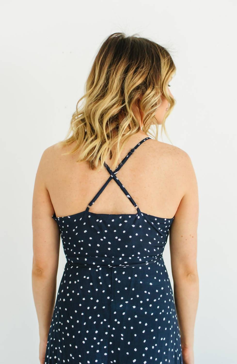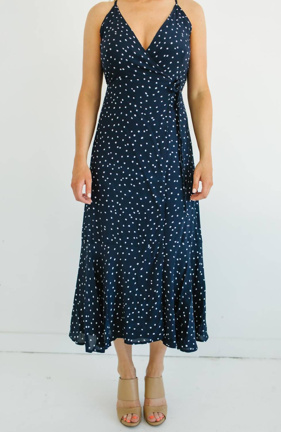 Details:V-necklineWrap front with tie detailsAdjustable straps that criss-cross in backPartial linedMaxi length - 35" from waistline to hemSemi-sheer fabricPerfect for any special eventCare Instructions:Hand wash cold or gentle cycle Wash with like colorsDo not bleachDry flat or hang dryLow iron if needed