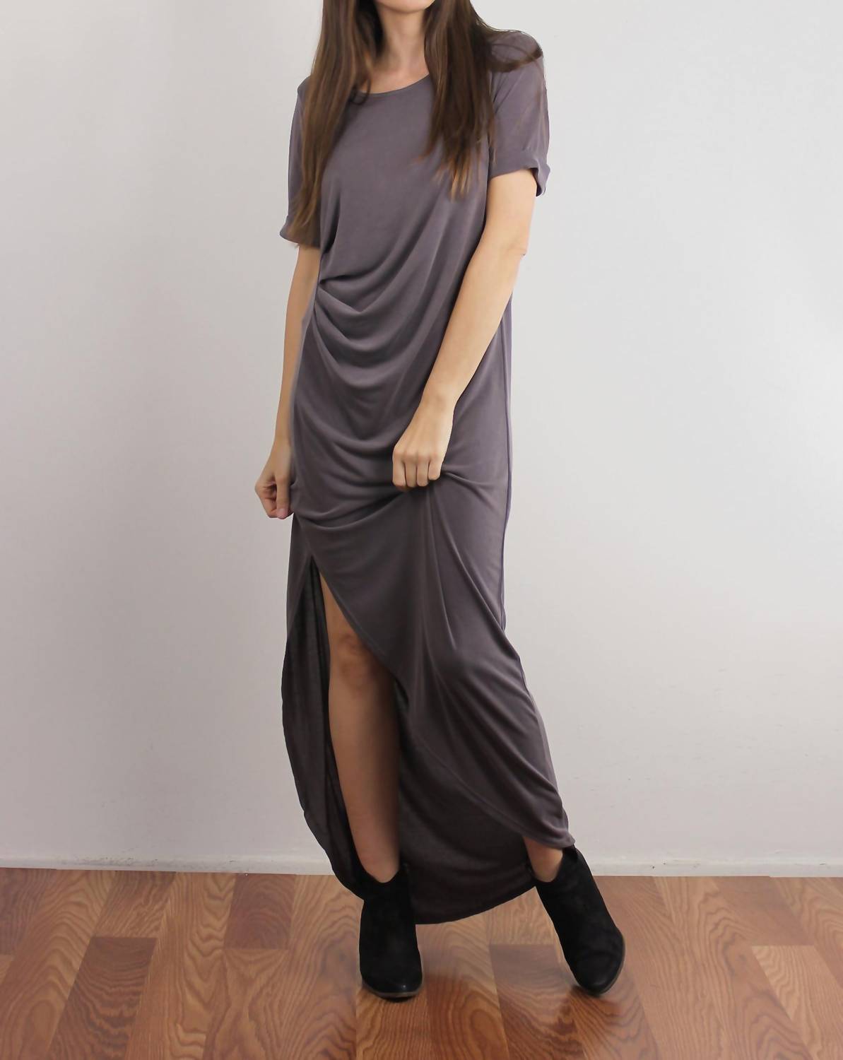 Style this maxi with your favorite statement necklace and sandals for the perfect look. Introducing the Valentina Maxi Dress by Mod Ref, a sophisticated piece in a dusty plum hue perfect for evening events. This dress showcases short rolled sleeves and features a crewneck for a classic touch. Crafted from 72% Modal and 28% Polyester, this solid-patterned design offers a stylish ruched front combined with an asymmetrical front slit for a chic silhouette. Closure: Pull-on. Care: Hand wash recommended.