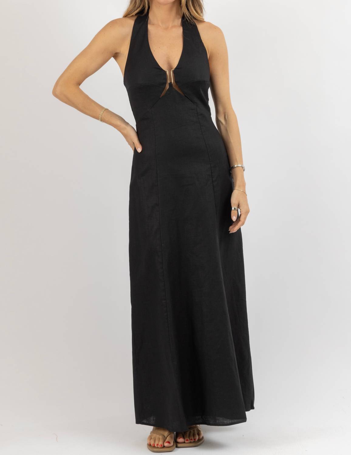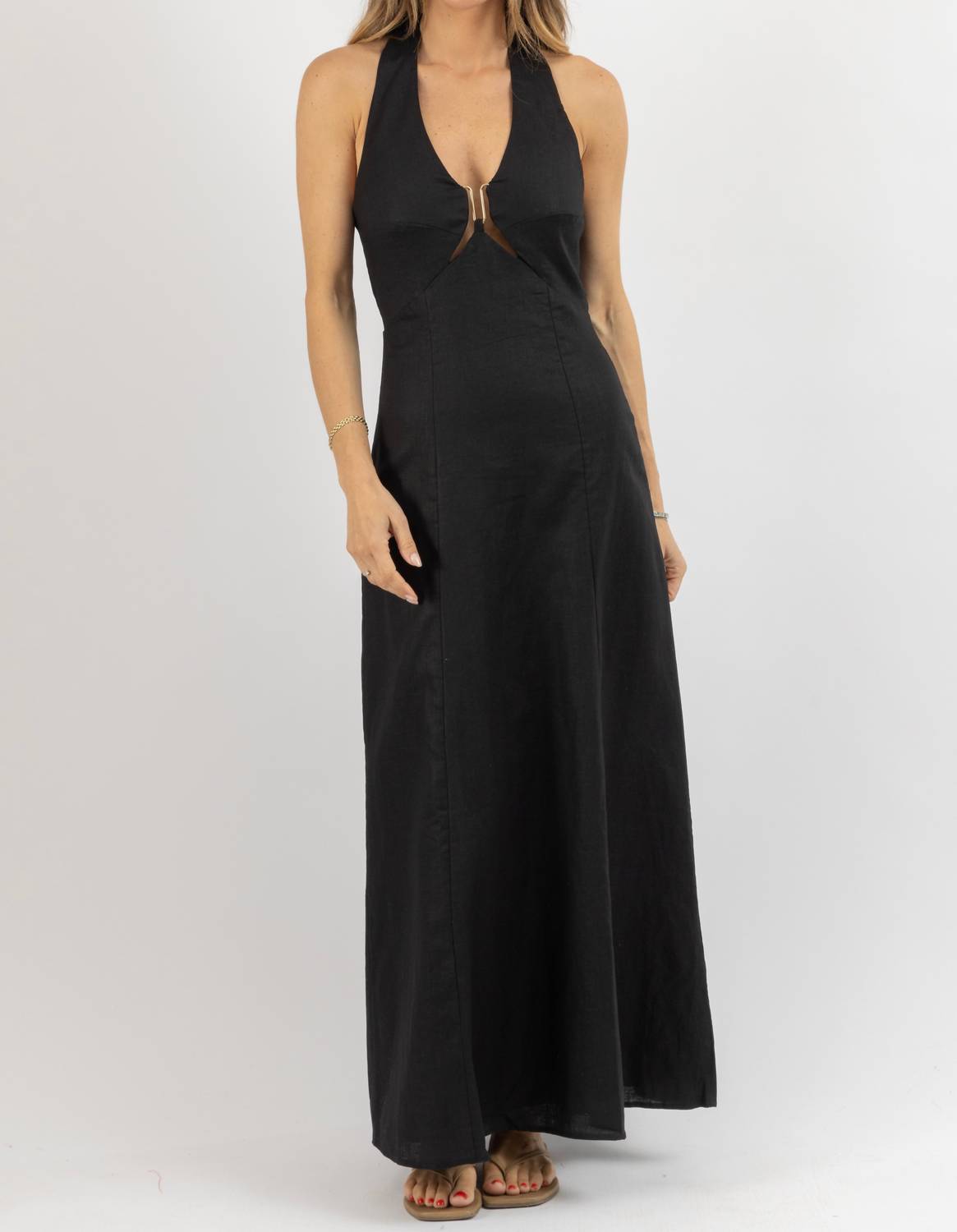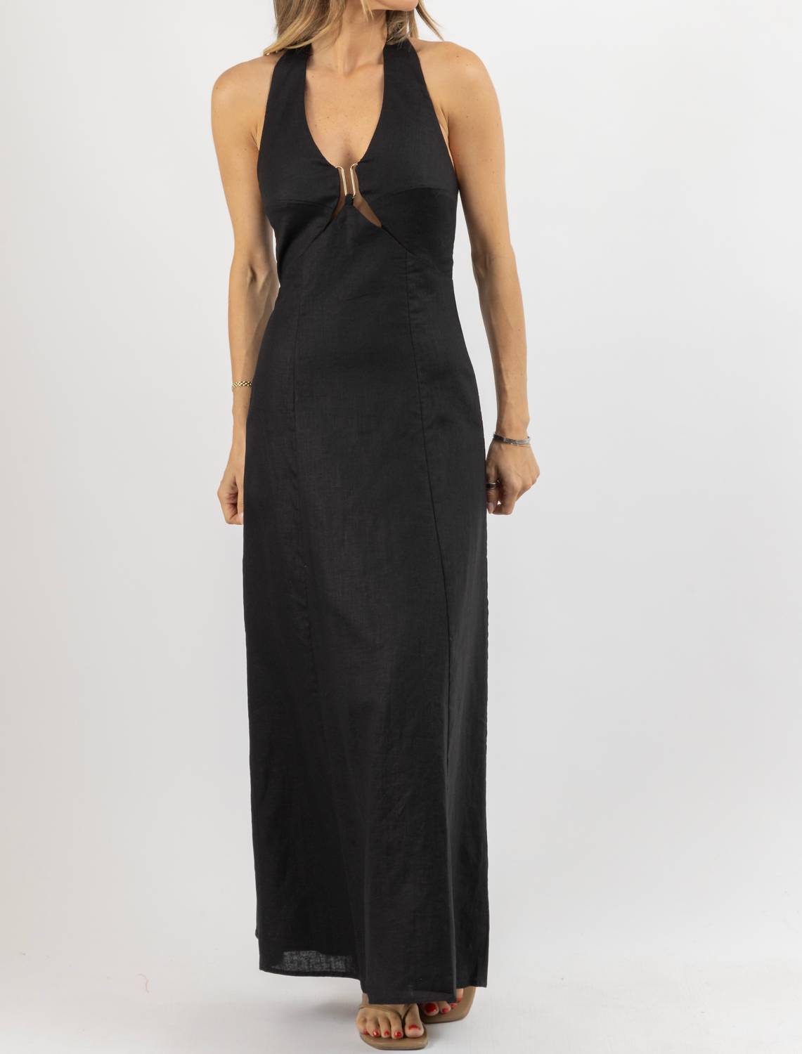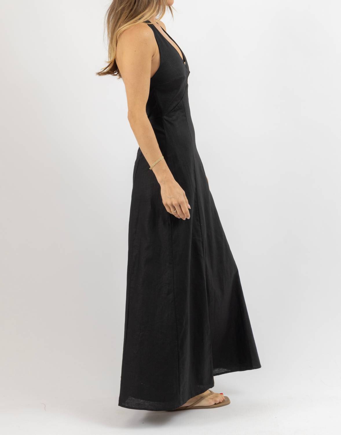 A maxi dress that is just as cute as it is comfortable. Introducing the Holden V-neck Maxi Dress by ENDLESS BLU, a stunning piece for your spring dinner party ensemble. This sleeveless, A-line silhouette features a flattering V-neckline with a golden detail and a chic halterneck design. Crafted from a blend of 90% linen and 10% cotton, it boasts an open-back style and maxi length, ensuring elegance in every stride. Closure: Convenient zip closure. Care: Machine wash. Model Naomie is wearing a size small and stands at 5'8", ideally showcasing its graceful flow.