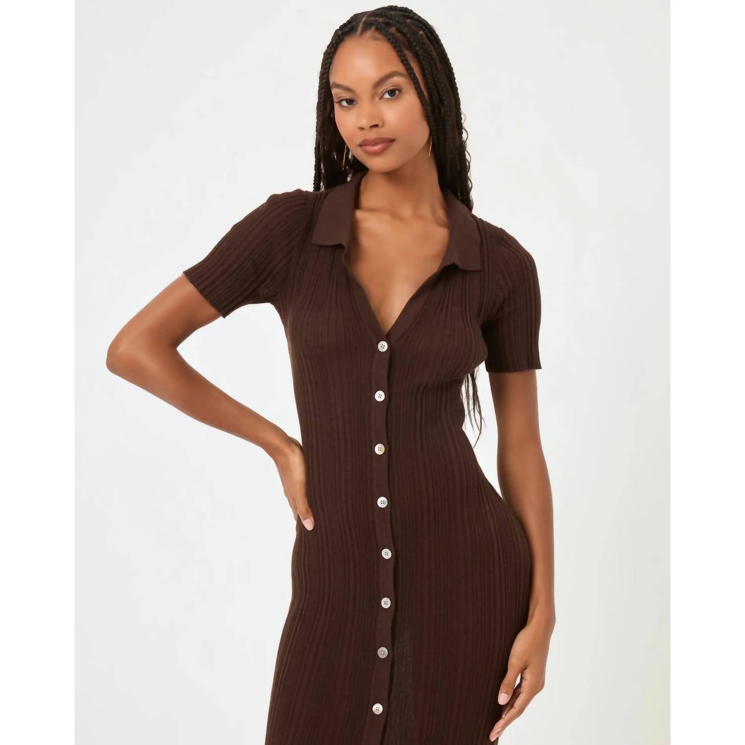 Who doesn't love a good maxi dress? This one you'll be reaching for season after season. Discover the elegance of the Undertow Maxi Dress by L*SPACE, crafted in a rich Espresso Bean hue for a captivating appearance. This short-sleeved, ankle-length dress exudes sophistication with its collar neckline and V-front, made from a textured sweater rib material. The composition includes 49% Linen, 39% Polyester, and 12% Polyamide, ensuring a comfortable and chic fit. Designed with a button closure, it's best maintained with hand washing in cold water and laid flat to dry. Perfect for a holiday party or invoking 90s fashion vibes, it's an essential for your summer wardrobe.