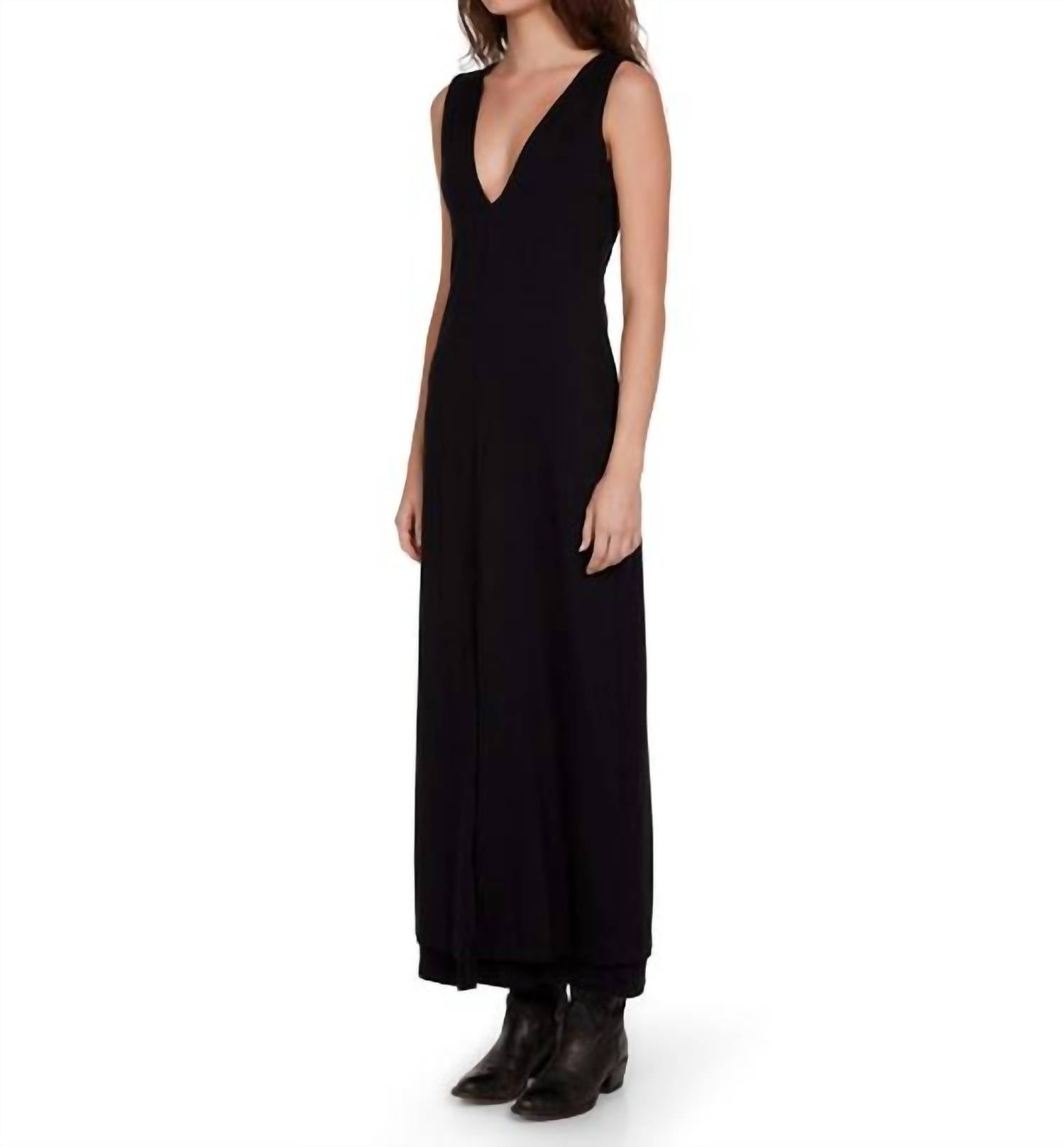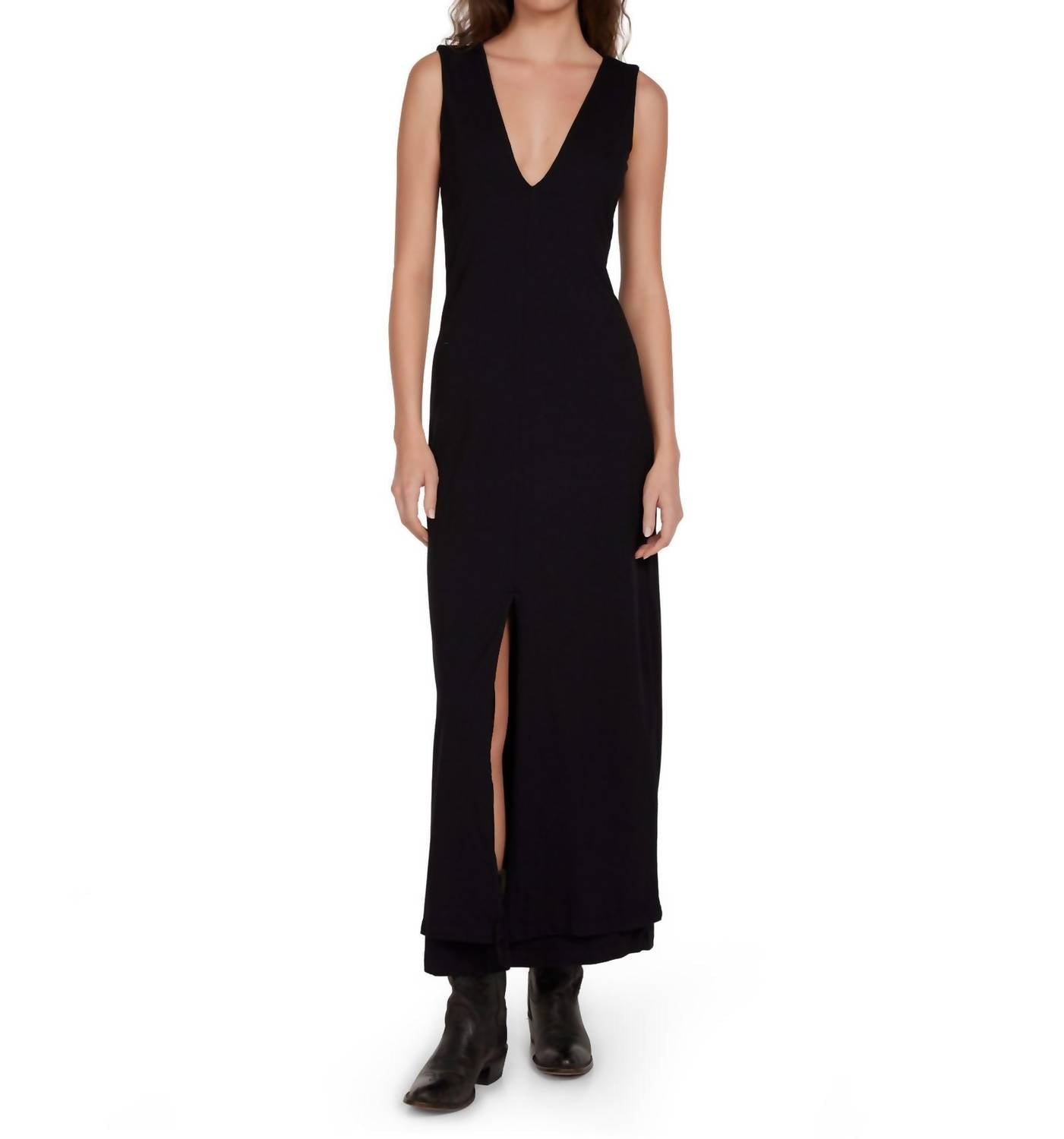 Who doesn't love a good maxi dress? This one you'll be reaching for season after season. Elevate your cocktail party attire with the Ali Double V Tank Dress by LES TIEN, crafted in luxurious Jet Black. This sleek sheath silhouette is designed in a sleeveless style, made from 56% Supima, 38% Modal, and 6% Spandex for a comfortable fit. Manufactured in the US, it features a flattering V-neckline with a pull-on closure for effortless elegance. Ideal for a minimalist look this Thanksgiving season, this maxi dress is a solid choice for summer occasions.