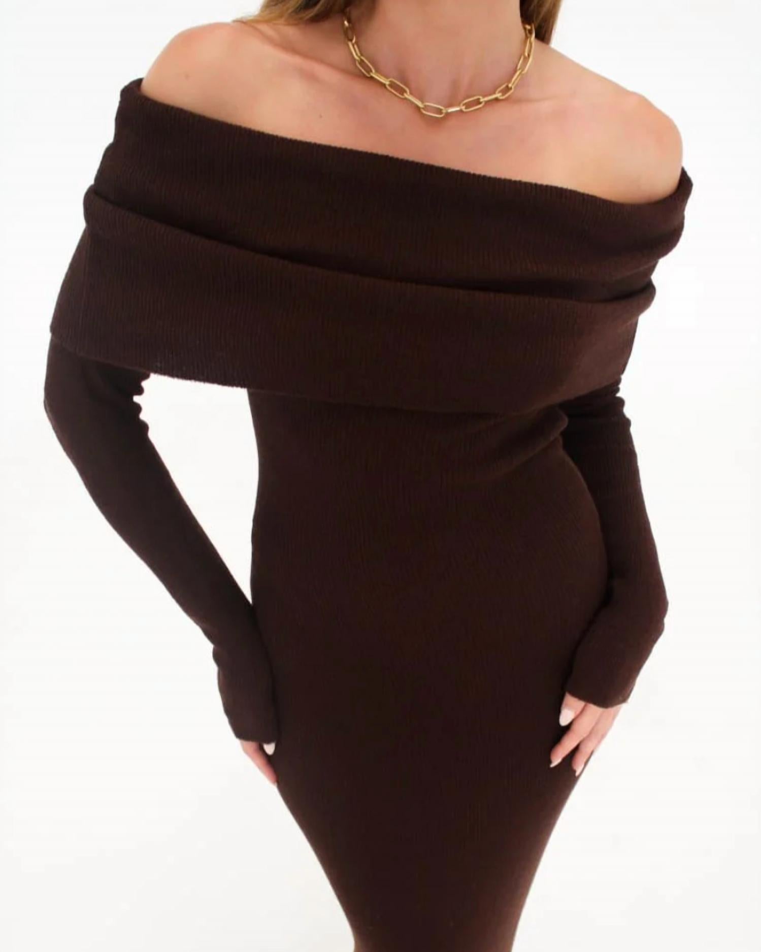 Who doesn't love a good maxi dress? This one you'll be reaching for season after season. Embrace effortless sophistication with the Winona Maxi Dress by Rumored, a true embodiment of quiet luxury ideal for any dinner party. This espresso-toned dress features an elegant off-the-shoulder neckline and long sleeves crafted from a lightweight slub knit, designed to flatter your silhouette with its mermaid design. Made from a comfortable 62% Acrylic and 38% Nylon blend, this maxi dress measures 55 inches from the center front neck seam to hem in size small. The pull-on style is perfectly paired with hand wash care instructions for easy maintenance. Model is wearing size XS (5'4" height, 32.5" bust, 26.5" waist, 38.75" hip).