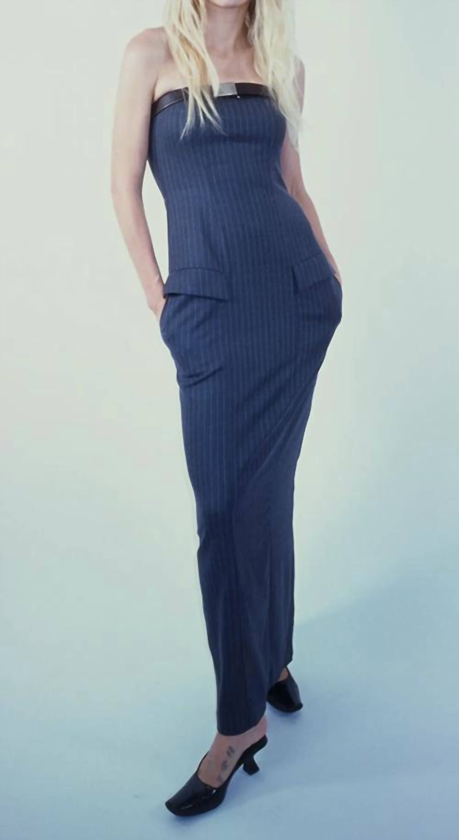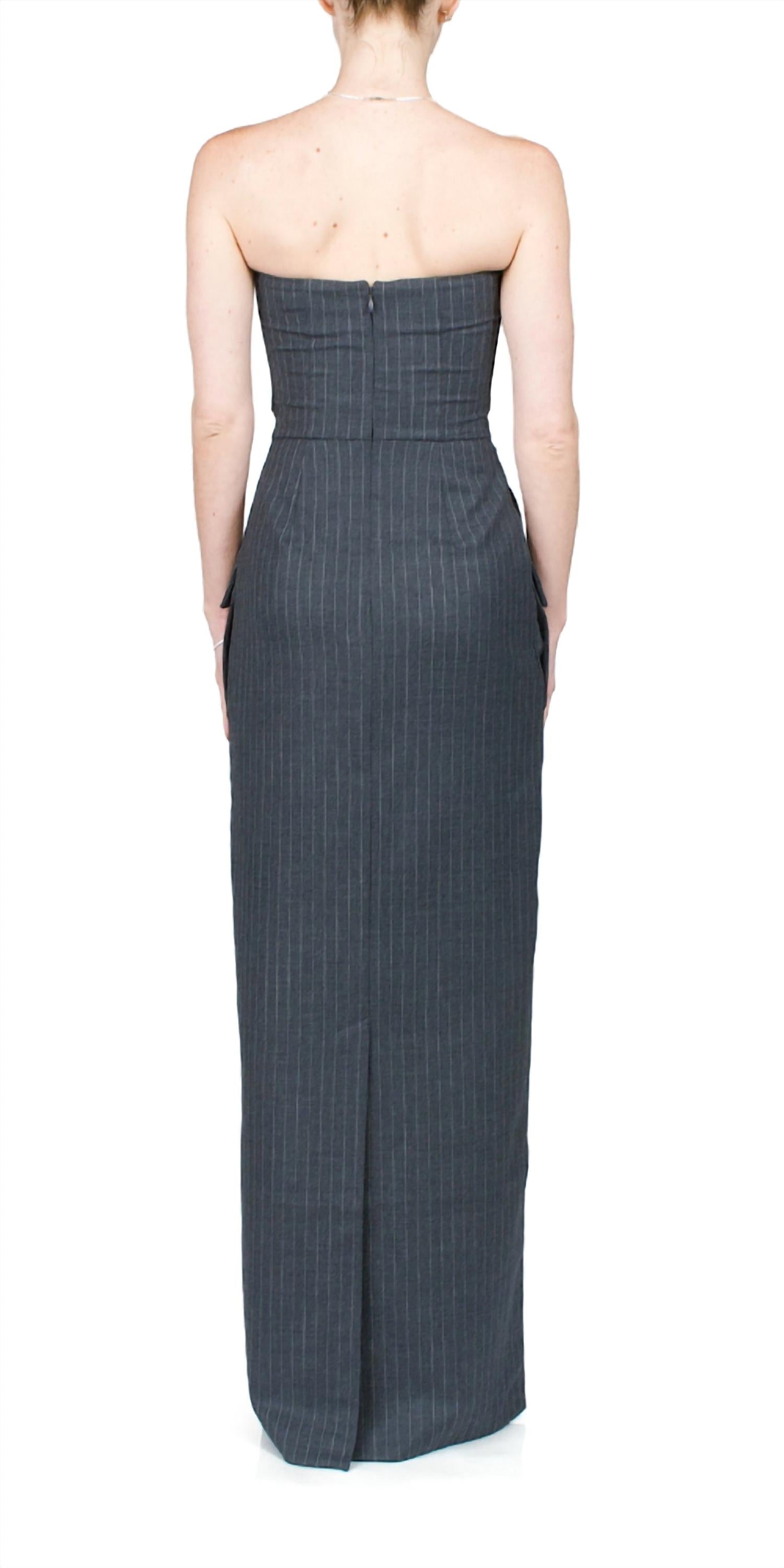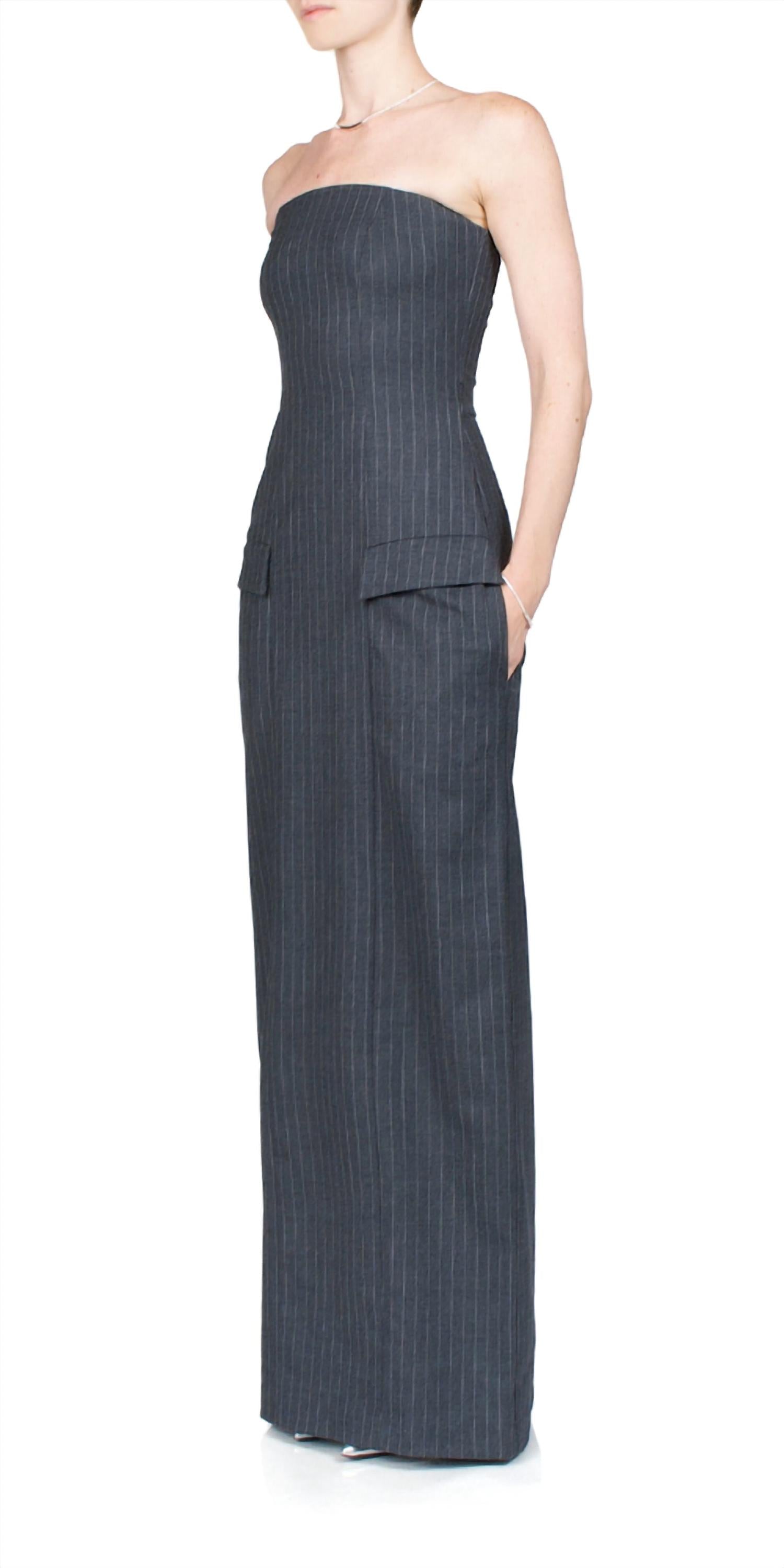 This Strapless Maxi Dress is made from a 40% wool, 29% polyester, 28% viscose, 3% spandex. Pocketing: 100% polyester. Straight strapless neckline and back vent keep the look modern. Design elements like front flap pockets and side slit pockets enhance functionality and style. Fitted at the waist, the dress falls into a straight skirt that elongates your frame, with a hidden zip closure at the back for practicality and style.