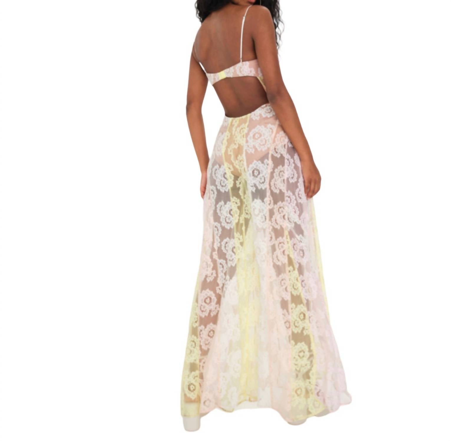 A maxi dress that is just as cute as it is comfortable. Experience the perfect blend of elegance and allure with our Blossom Maxi Dress by For Love & Lemons. This exquisite piece features a beautiful bouquet lace fabric, accented by contrast lace panels that enhance its sophisticated charm. Designed with underwire cups for added support and a flattering fit, this dress ensures you look your best on any occasion. The tonal bodysuit lining provides a seamless silhouette, while the skinny adjustable straps allow for a customized fit. The eye-catching cut-out back detail adds a touch of modern flair, making this dress a standout choice for evening events or special celebrations. Fasten it securely with the hook & eye closure for a polished look.