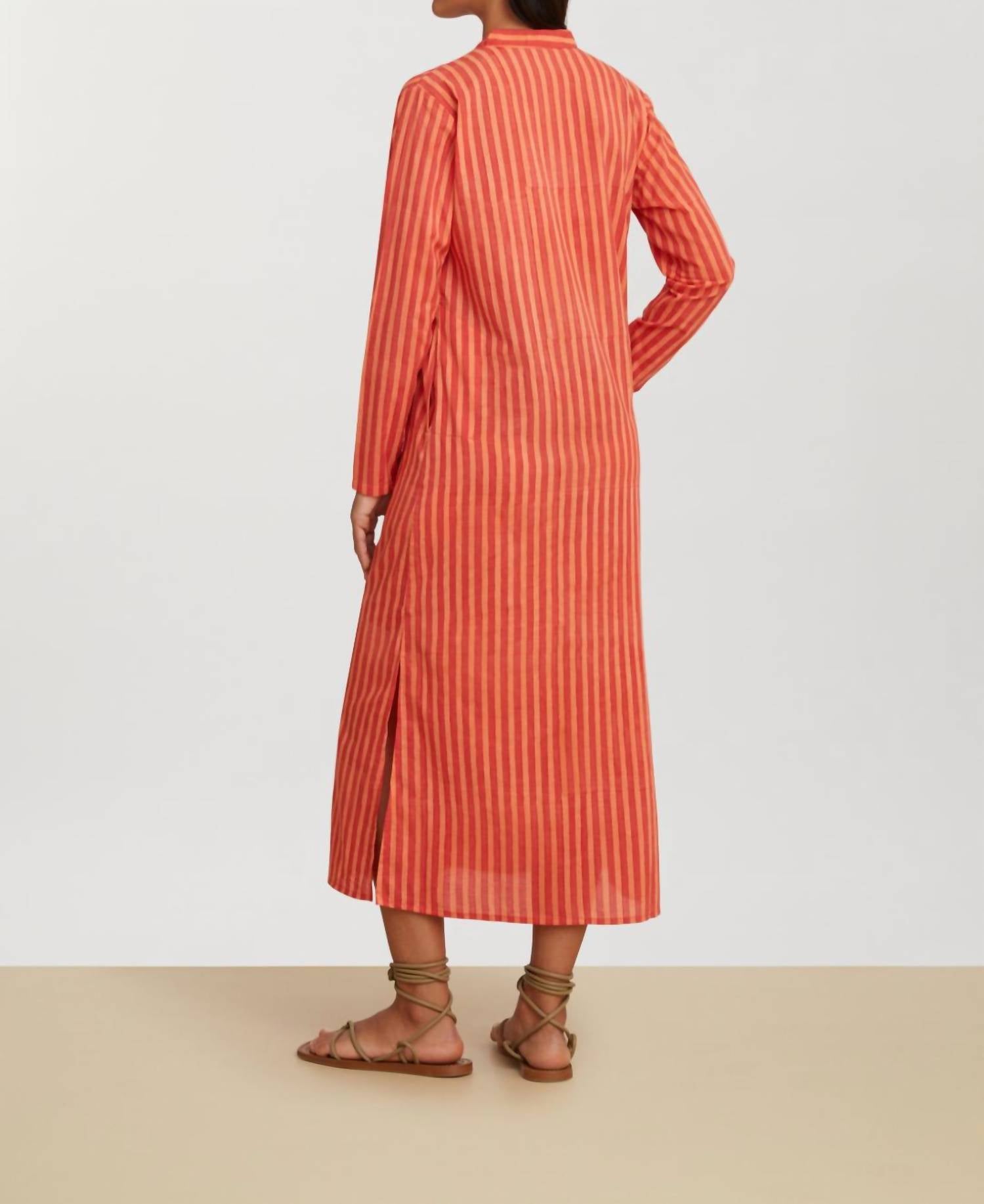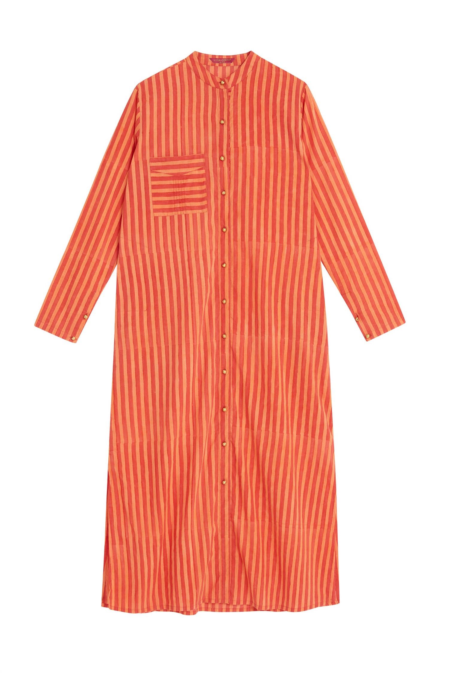 Who doesn't love a good maxi dress? This one you'll be reaching for season after season. Discover the Long Kurta Dress by Lisa Corti, a perfect blend of craftsmanship and style for your summer wardrobe. This maxi dress in Mini Stripes Peach boasts a mockneck and a simplistic shirt silhouette with long sleeves, crafted from high-quality cotton. Produced in India, this piece stands out with its unique, artisan-crafted design, featuring a functional button closure and convenient pockets. Care instructions: Machine wash at 30°, line dry, and do not soak, preserving the handcrafted detailing attributed to the meticulous blockprint technique.
