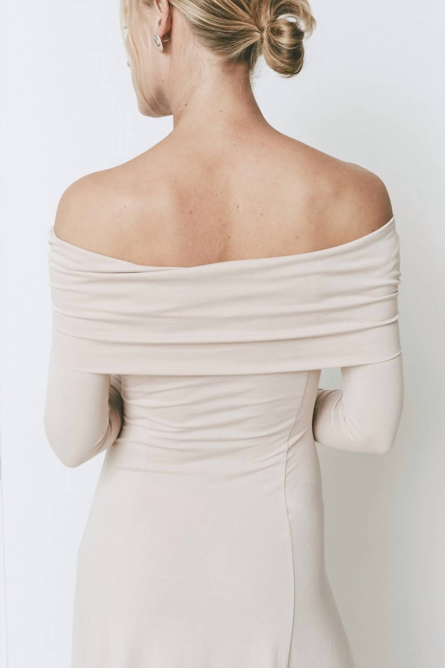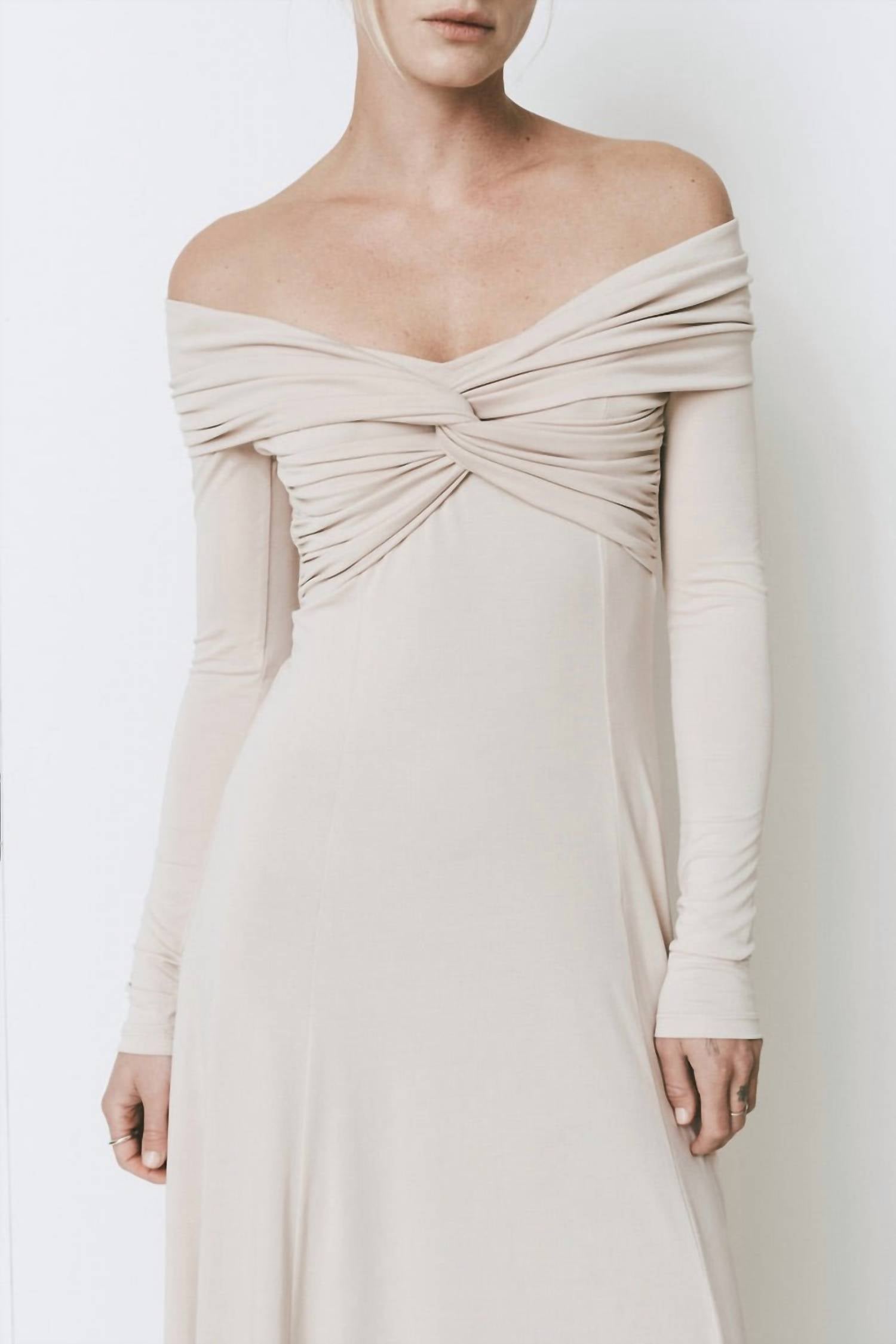 Style this maxi with your favorite statement necklace and sandals for the perfect look. Meet the Giverny Dress by Rue Sophie, a stunning maxi dress in a soft blush hue perfect for your spring wardrobe. Featuring an elegant off-the-shoulder neckline with long sleeves, this dress combines a twist top design and A-line silhouette, ensuring sophistication for wedding occasions. It's expertly crafted from 80% Modal and 20% Lyocell for comfort and durability. The dress offers a practical pull-on closure with the convenience of essential pockets and is easy to care for with machine wash and line dry instructions.