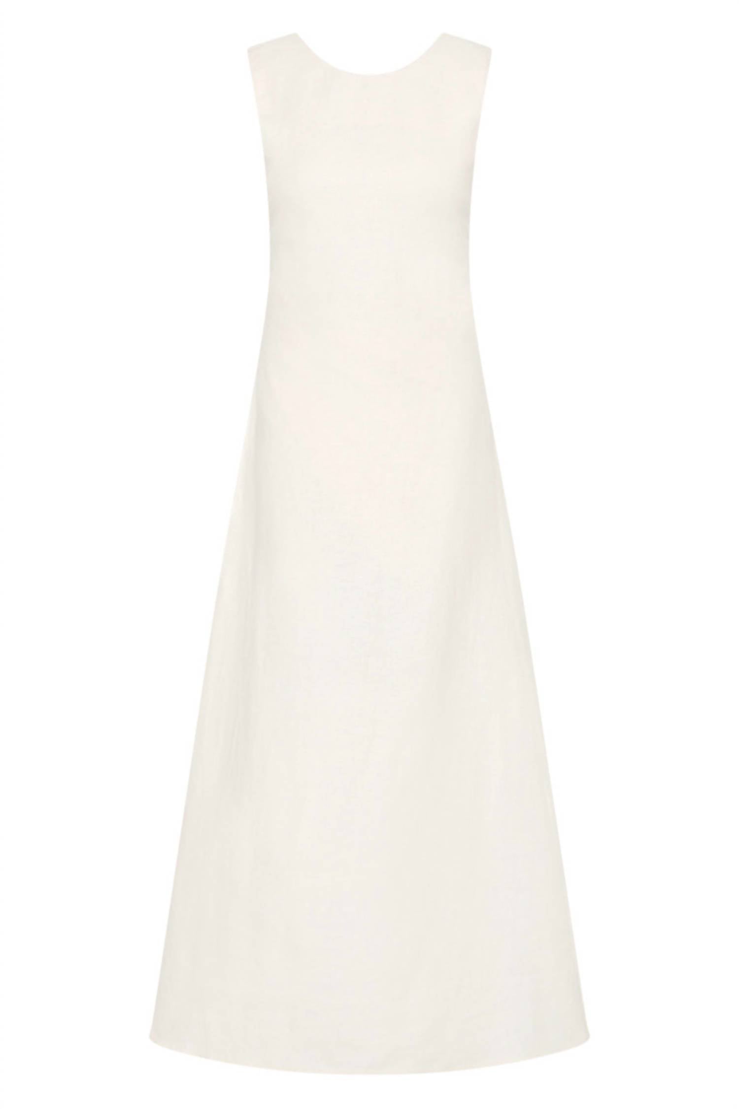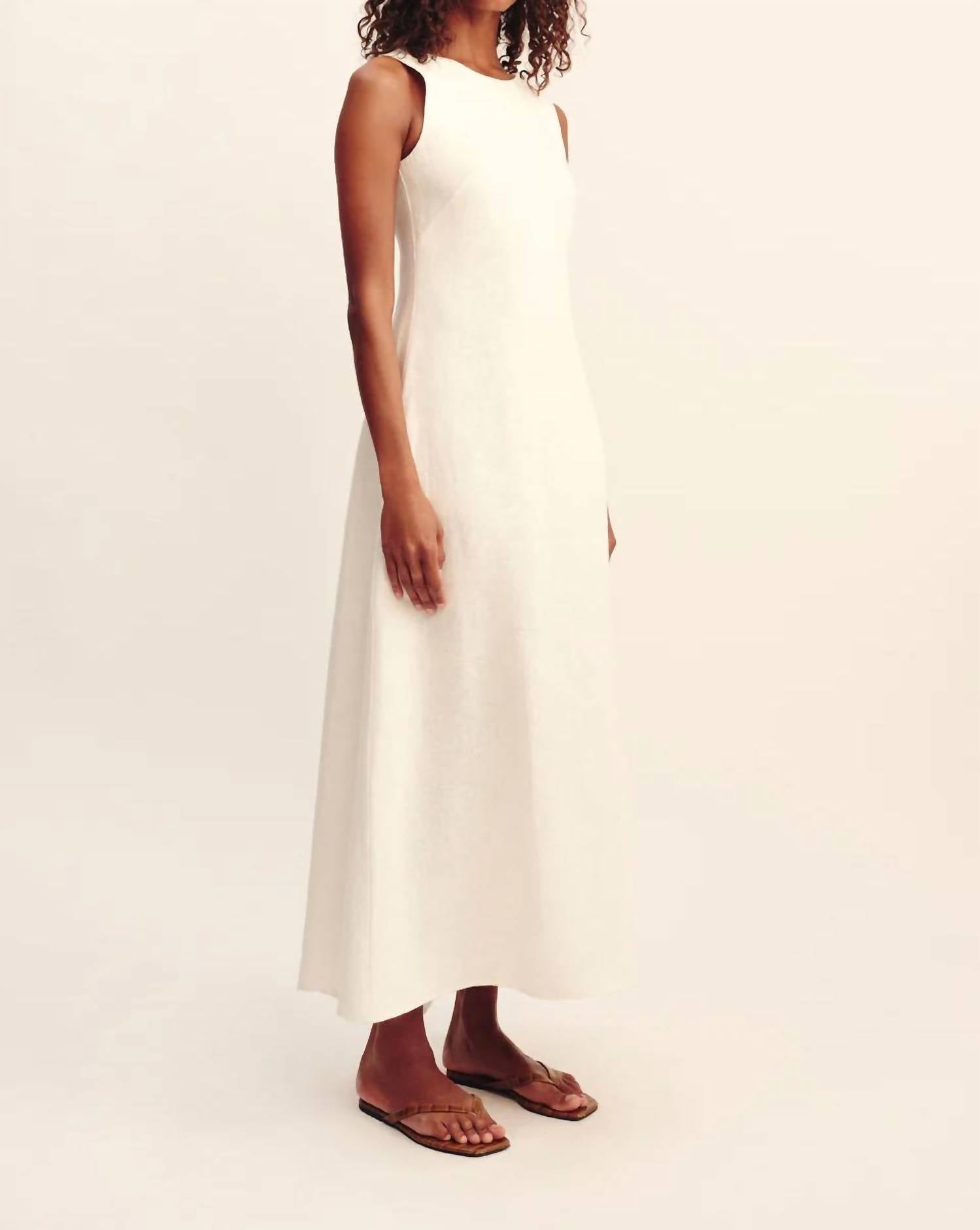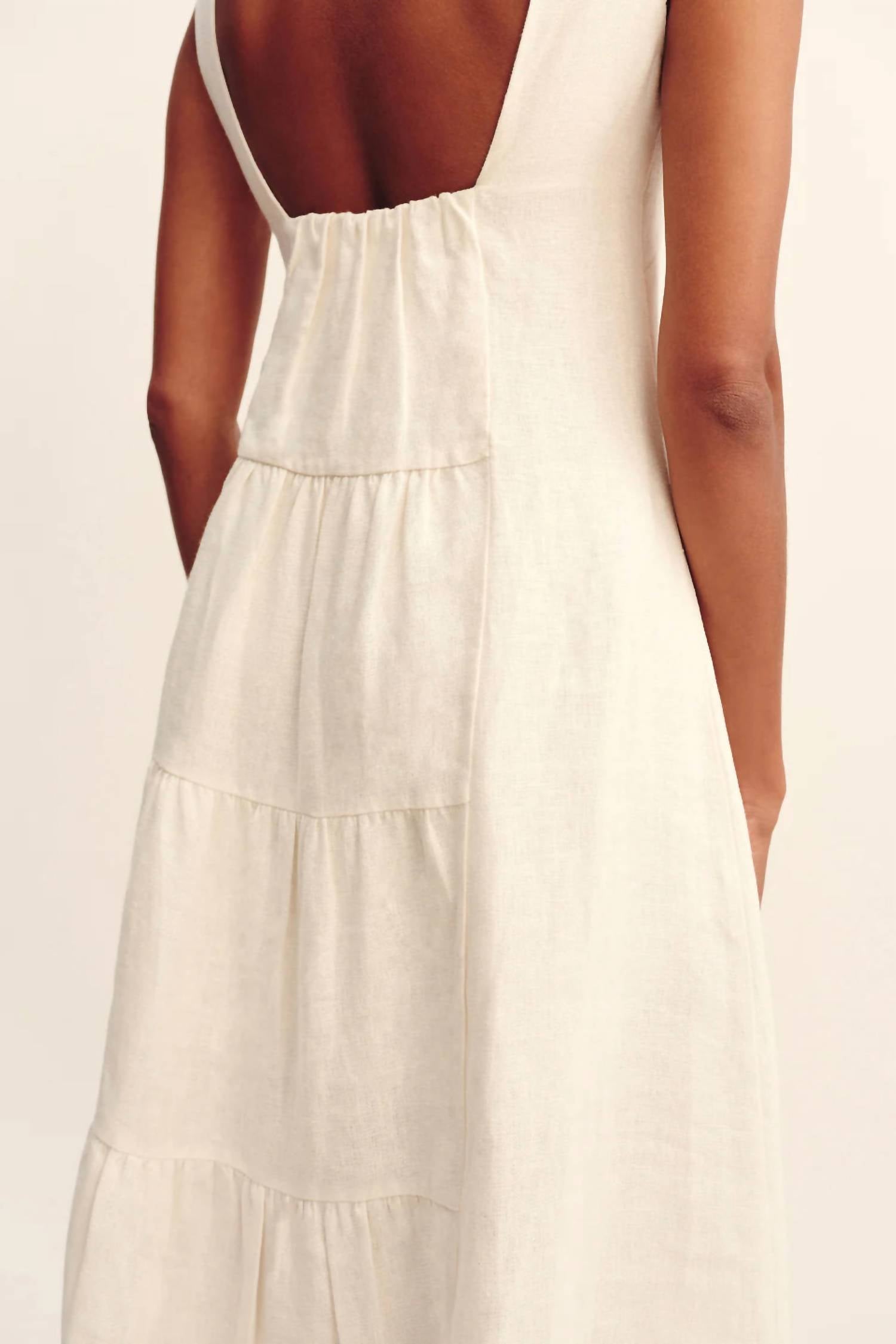 A maxi dress that is just as cute as it is comfortable. The Matilda Maxi Dress by POSSE is a stunning cream piece designed for elegance with its sophisticated sleeveless high neckline and a captivating open back. Crafted from 100% premium linen, it features an elasticated waistband that beautifully shapes your figure, complemented by an A-line silhouette with playful tiered detailing. This pull-on style dress is perfect for a special summer occasion, embodying a minimalist trend with its solid pattern.