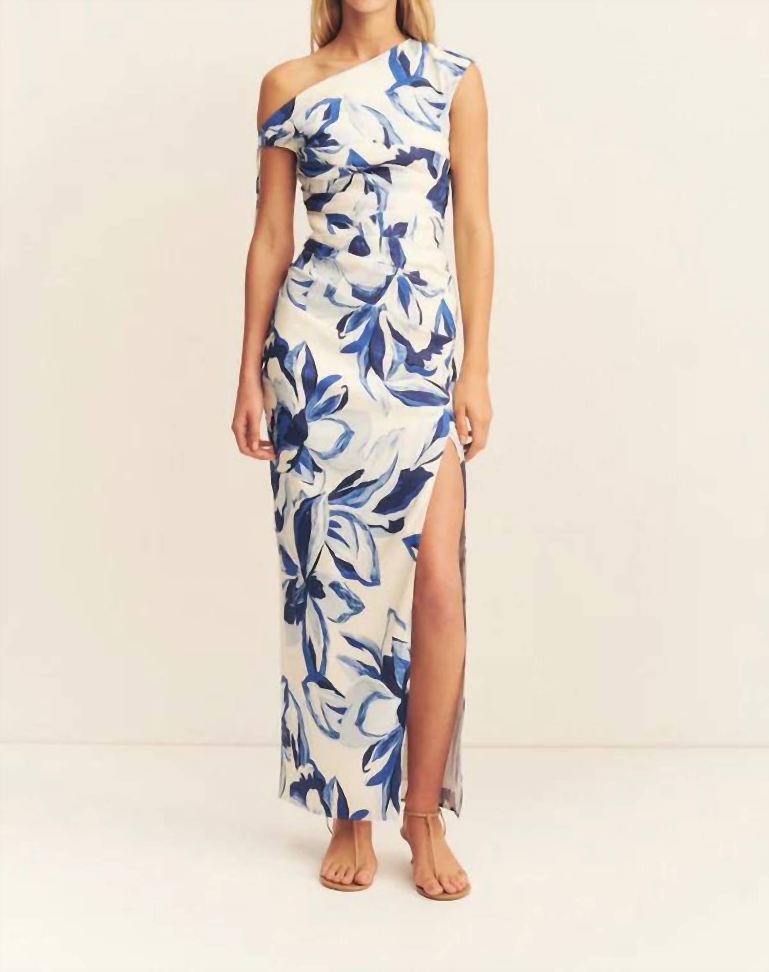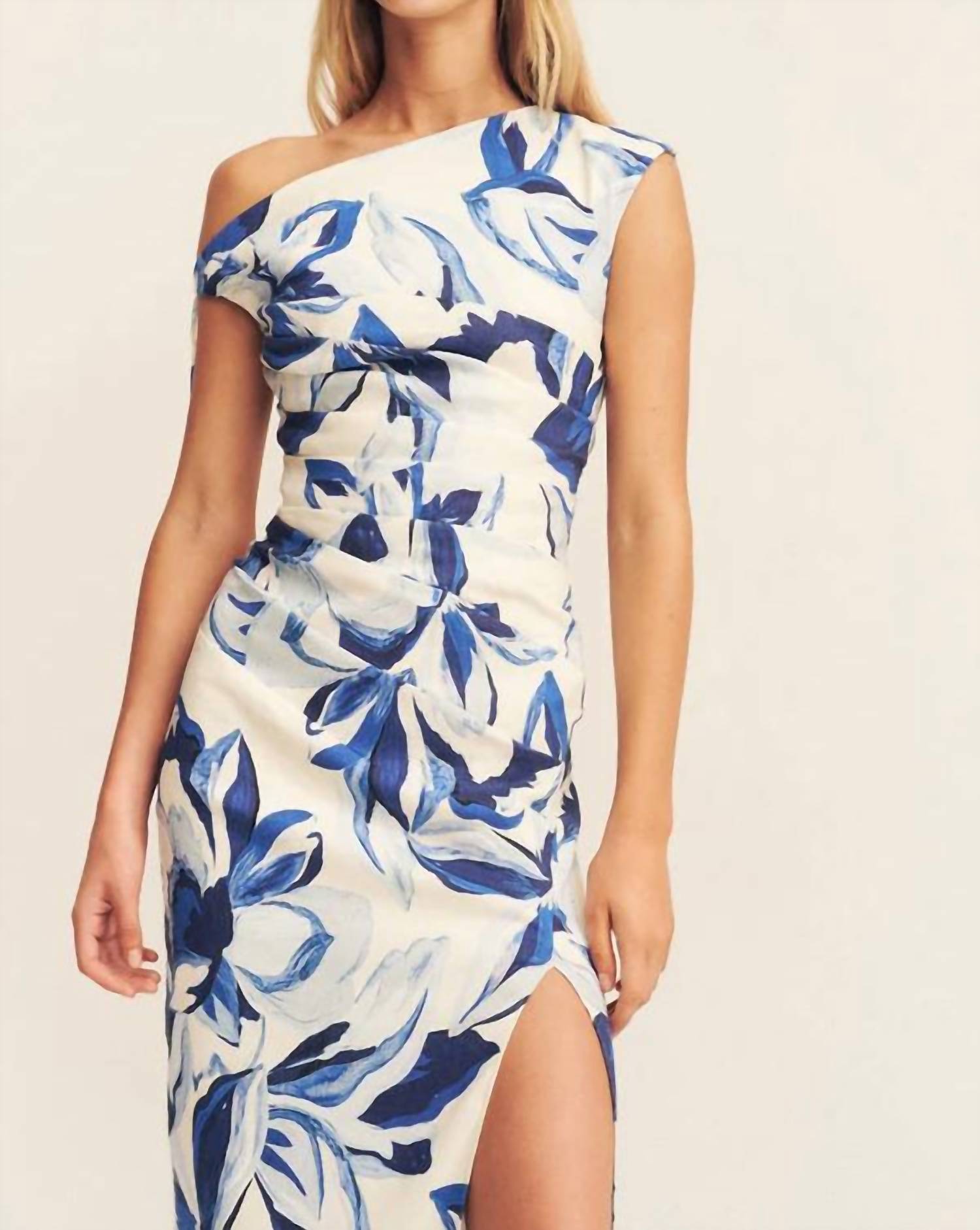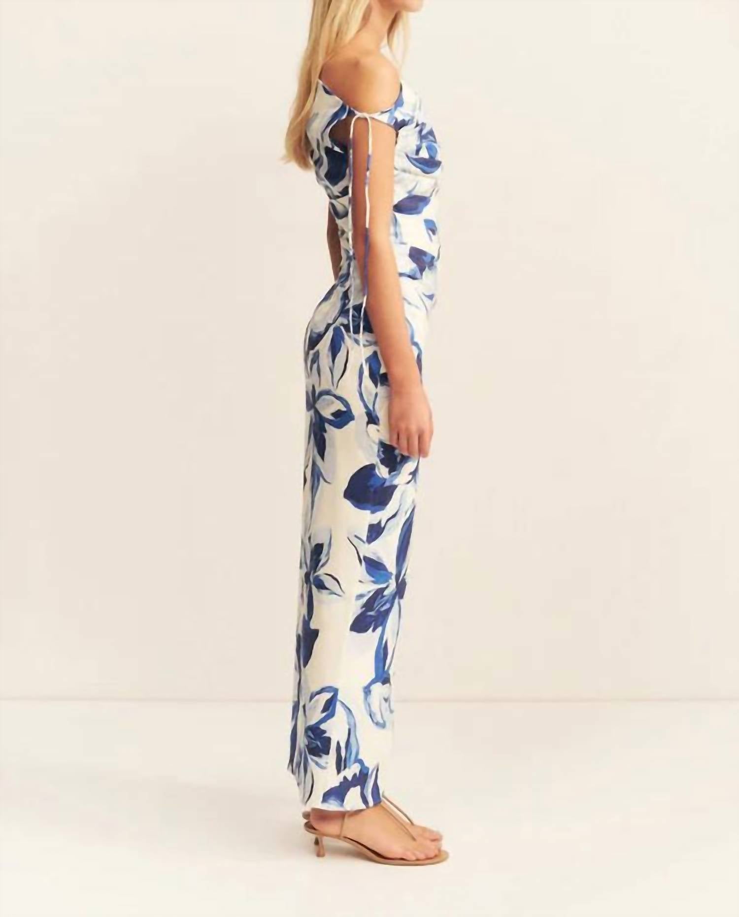 Style this maxi with your favorite statement necklace and sandals for the perfect look. Discover the Stevie Gathered Maxi Dress by Shona Joy, a stunning blend of style and comfort in a sleeveless, sheath silhouette. Crafted from a stretch linen blend that incorporates 53% Linen, 45% Viscose, and 2% Elastane, this maxi dress features an enchanting bluebell wallpaper print, perfect for any summer occasion. The dress highlights an asymmetrical neckline with adjustable ties, complemented by fixed side ruching, a side split, and an invisible side zip. Designed for ease of care, it is machine washable and can be tumble dried.