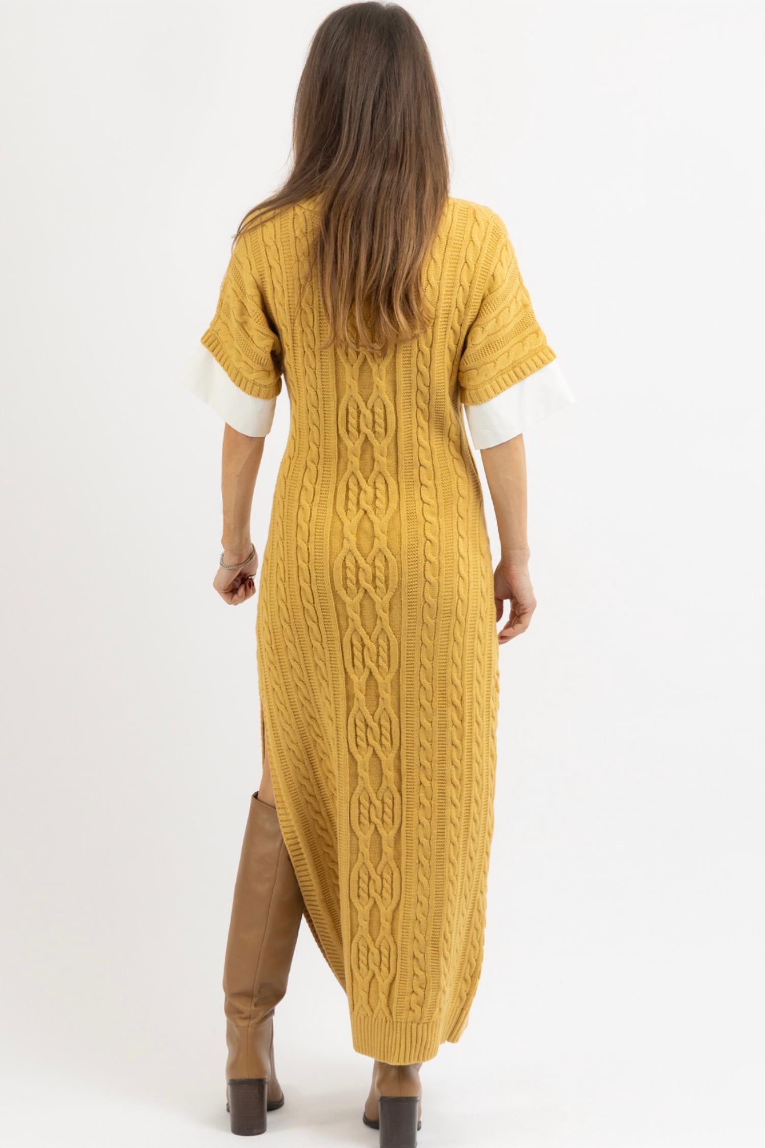Style this maxi with your favorite statement necklace and sandals for the perfect look. Discover the Landon Layered Sweater Dress by Endless Blu, a stylish addition to your wardrobe in a stunning gold hue. This maxi-length dress features short sleeves and a relaxed fit, with a chic side slit and a collared button front blouse layered design. Crafted from 100% acrylic, it offers both comfort and style. Closure: Pull-on. Model Naomie is 5'8" and wearing a size small.