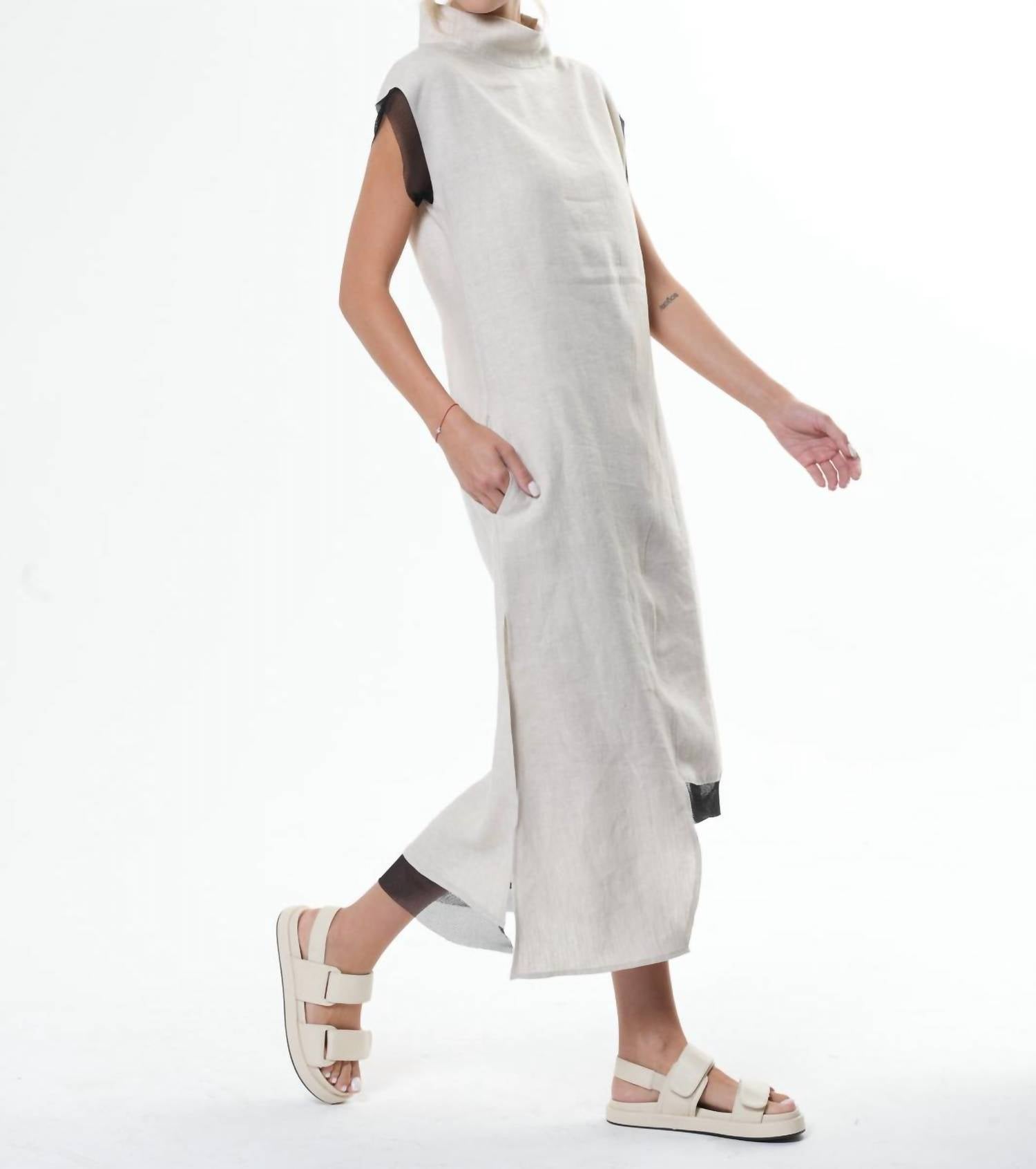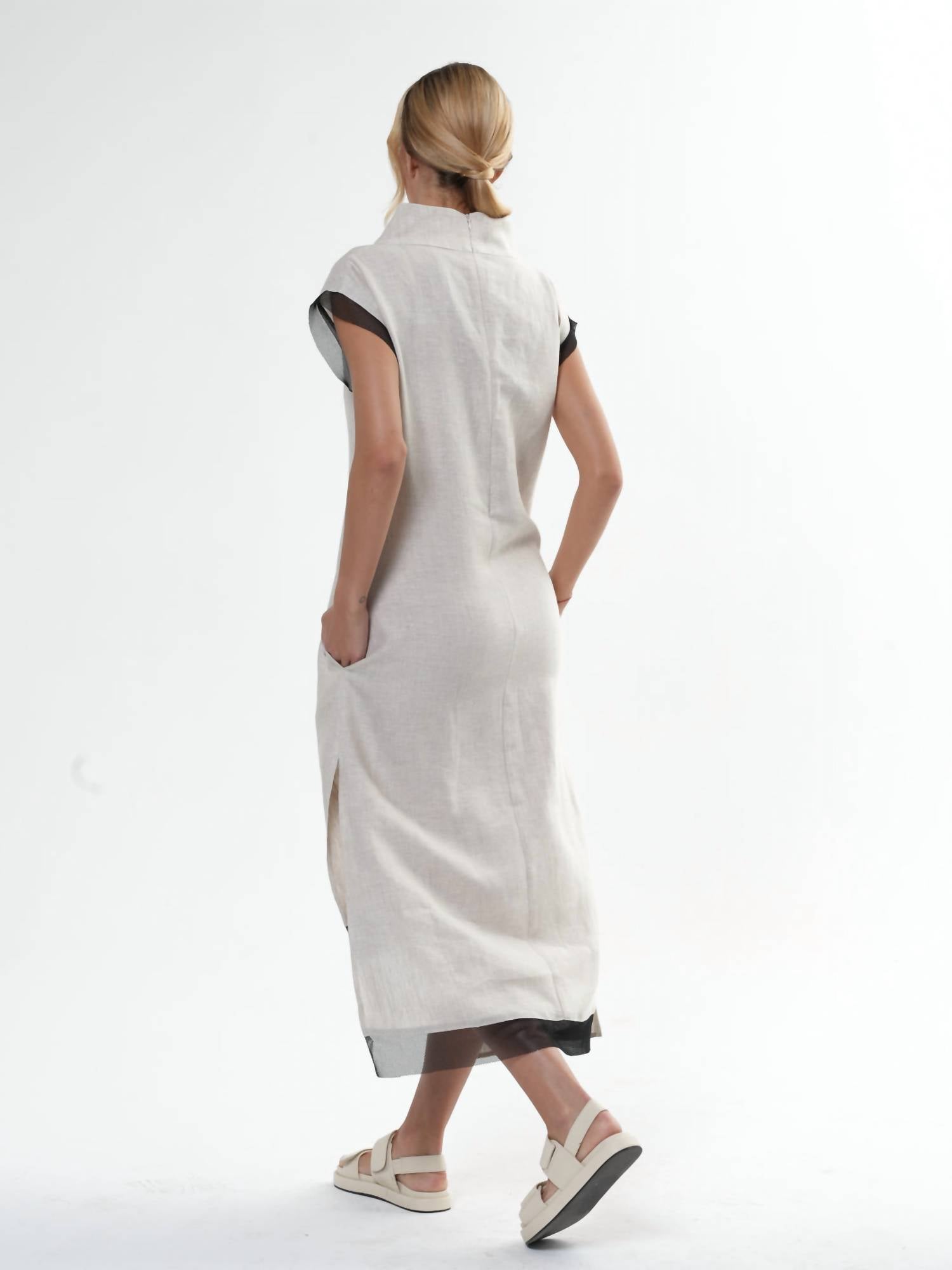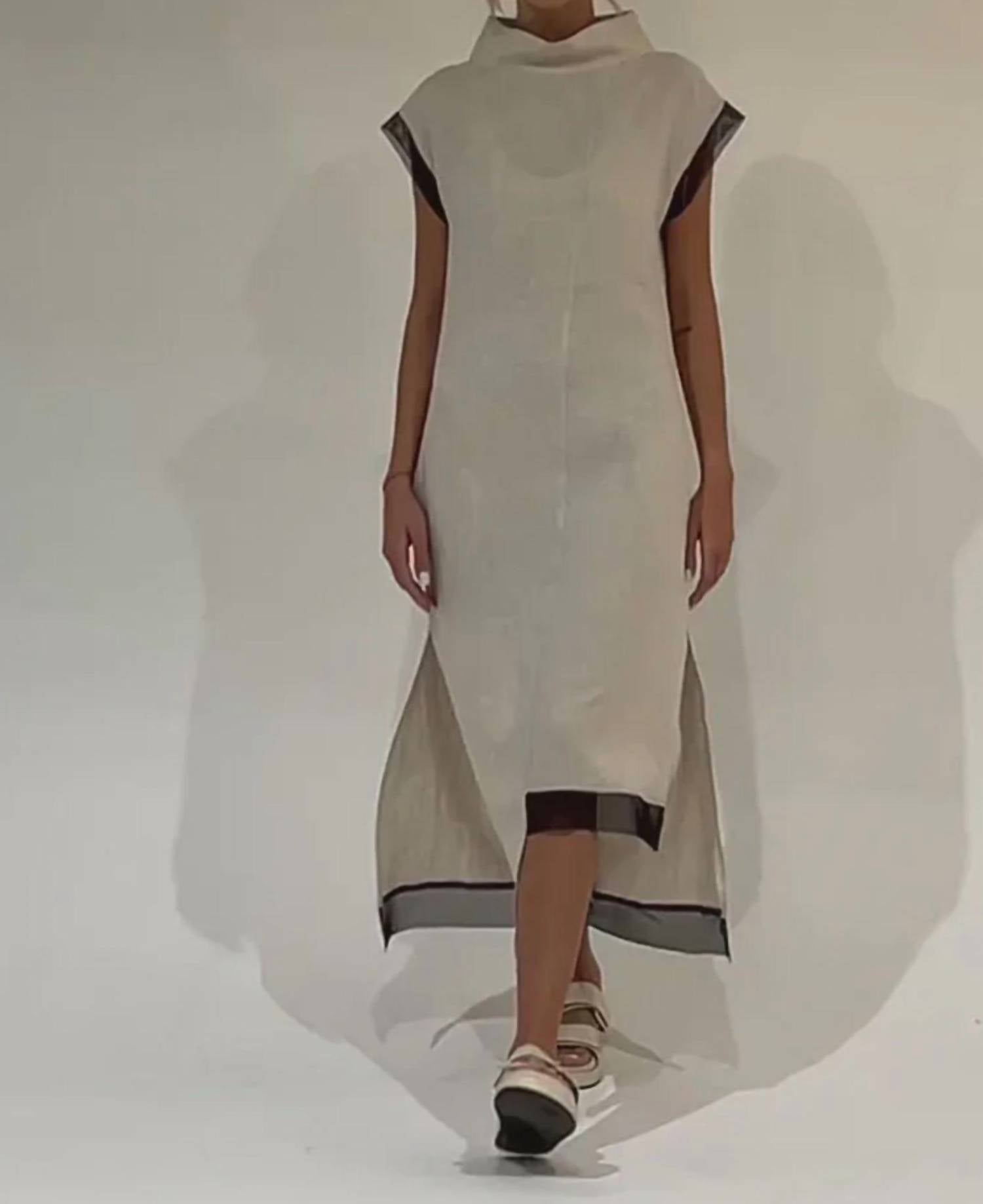 Who doesn't love a good maxi dress? This one you'll be reaching for season after season. Meet the Asymmetrical Linen Dress by Metamorfosi, a chic choice for your spring evening events in elegant beige. This women’s maxi dress features cap sleeves and an asymmetric silhouette with a high mockneck neckline, adding a contemporary edge. Made from 100% natural linen, it includes a hidden zip closure at the back and practical side pockets for comfort. Care for it by handwashing in cool water or machine washing on a delicate cycle, but refrain from using a clothes dryer. The dress measures approximately 126 cm/49.2 inches in length, making it a refined statement piece for any occasion.