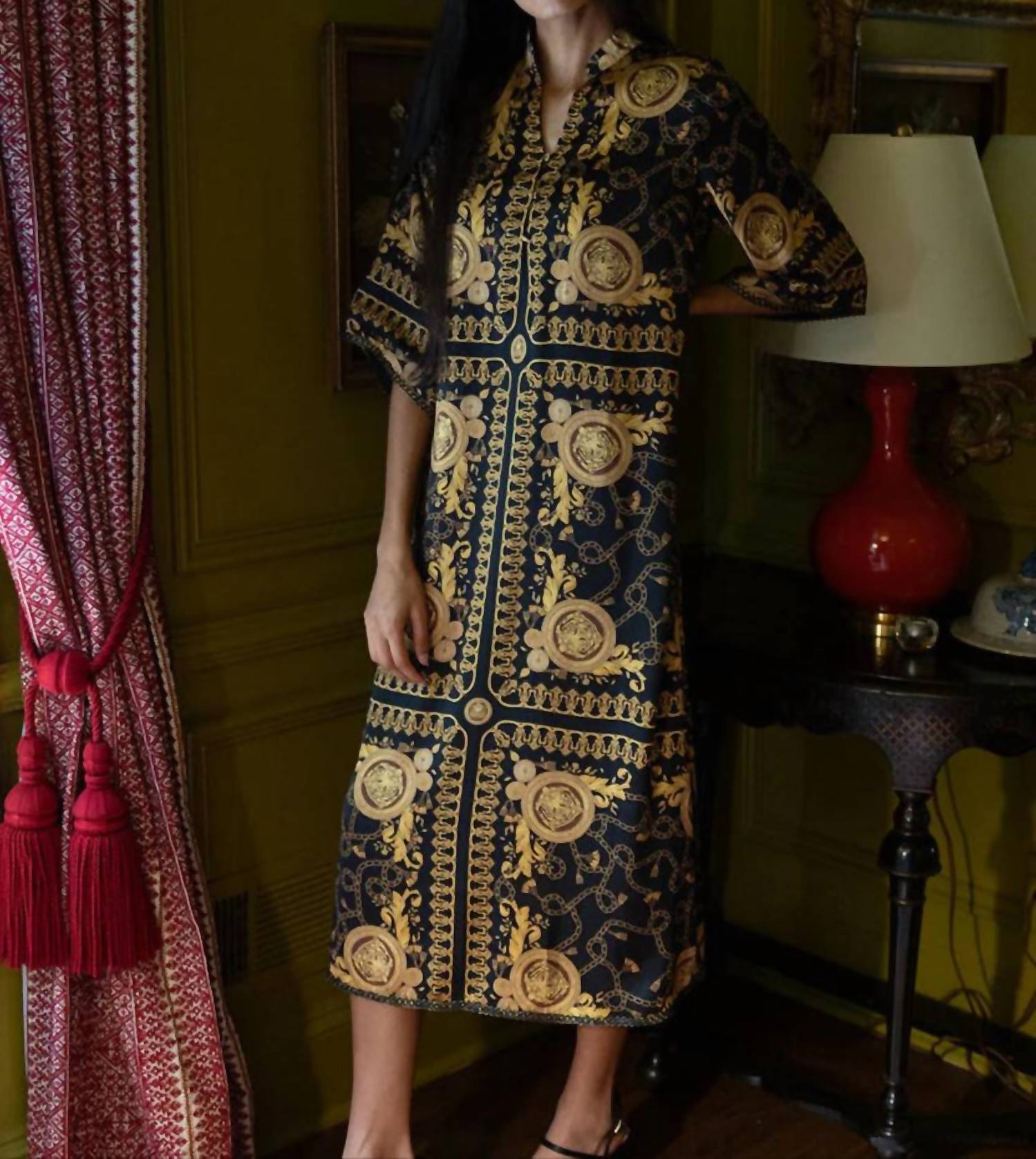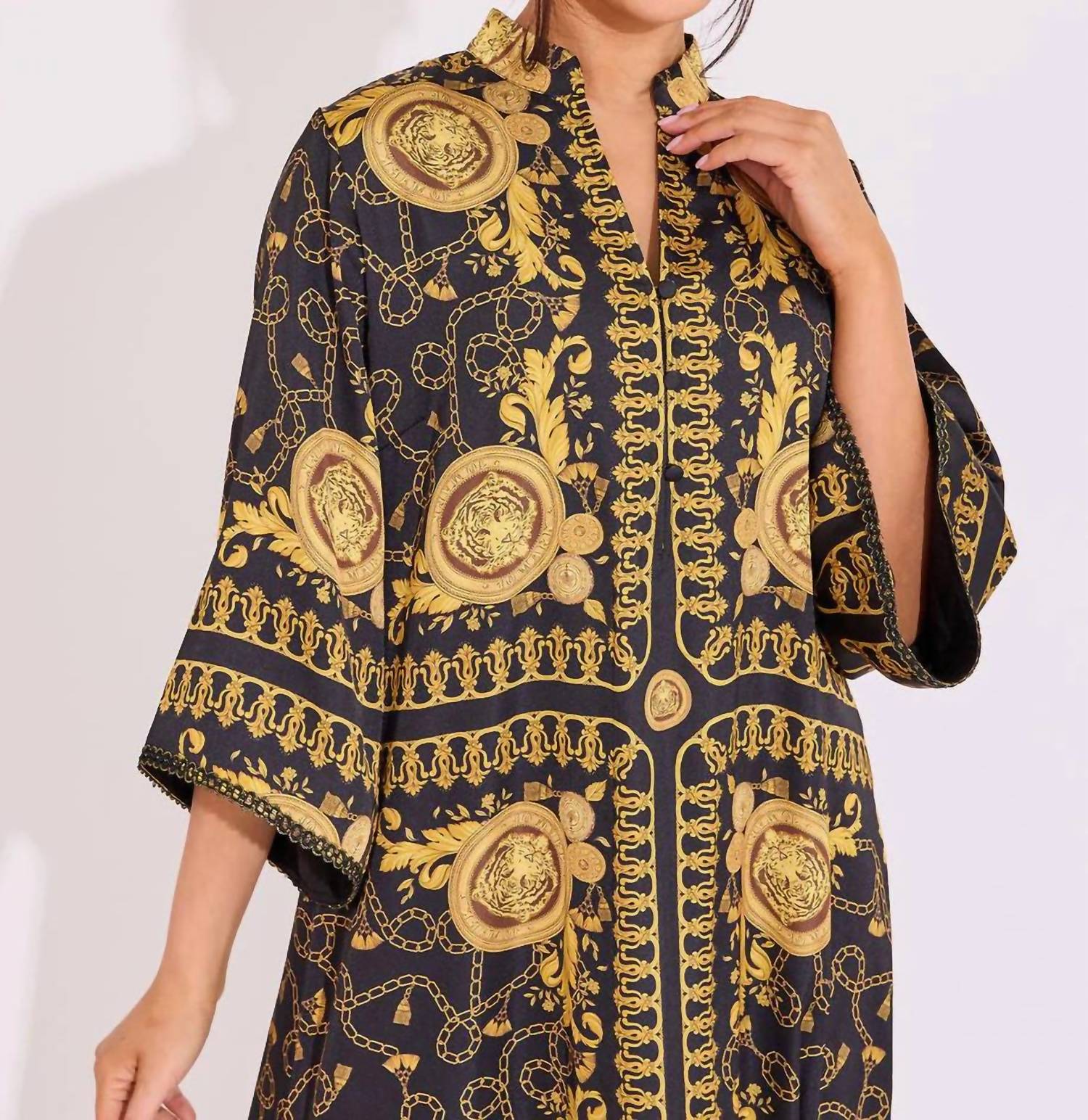 A maxi dress that is just as cute as it is comfortable. Introduce a touch of elegance to your wardrobe with the Jerry Dress by Alden Adair, a sublime creation in the captivating Donatello color. Featuring three-quarter sleeves, this maxi dress is crafted from 100% poly charmeuse to bring a boho chic vibe to your summer vacation look. Its graphic pattern and kaftan silhouette exude sophistication, enhanced by a practical pull-on closure. Made in China, this piece is machine washable and requires line drying to maintain its gorgeous allure.