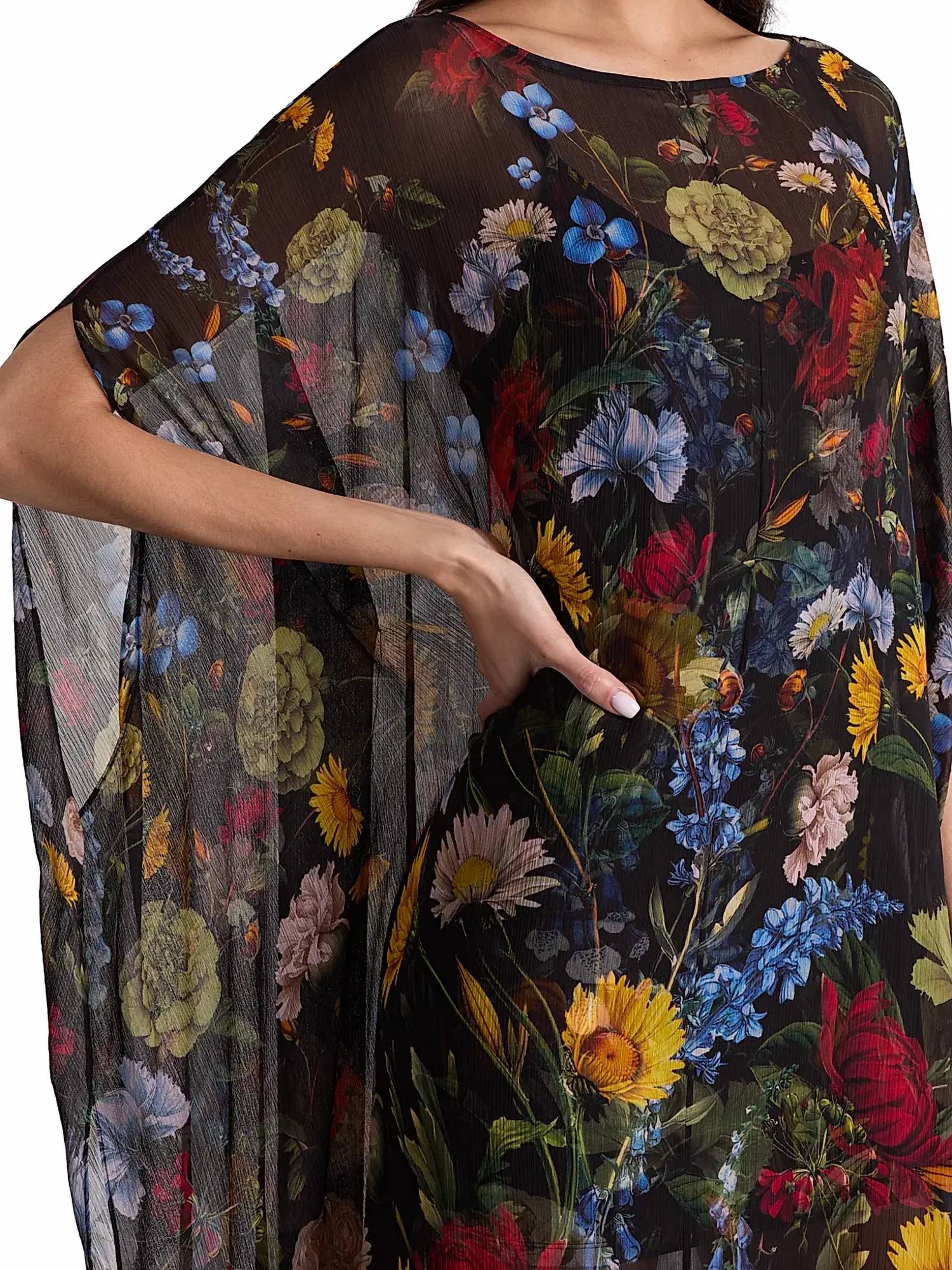 A maxi dress that is just as cute as it is comfortable. The Linn Cape Maxi Dress by Alice + Olivia brings an air of effortless glamour to any evening event. This dress features three-quarter capelet sleeves and a dramatic 59-inch length, crafted from printed semi-sheer chiffon in a moody, abstract black pattern. Made from 100% polyester with an attached cami lining of 97% viscose and 3% elastane, this dress offers both style and comfort. Closure is easy with a back zip, and it should be dry cleaned to maintain its elegance. Imported for the utmost quality, this A-line silhouette embodies the trend of quiet luxury. Model is 5'10" wearing a US size 4.