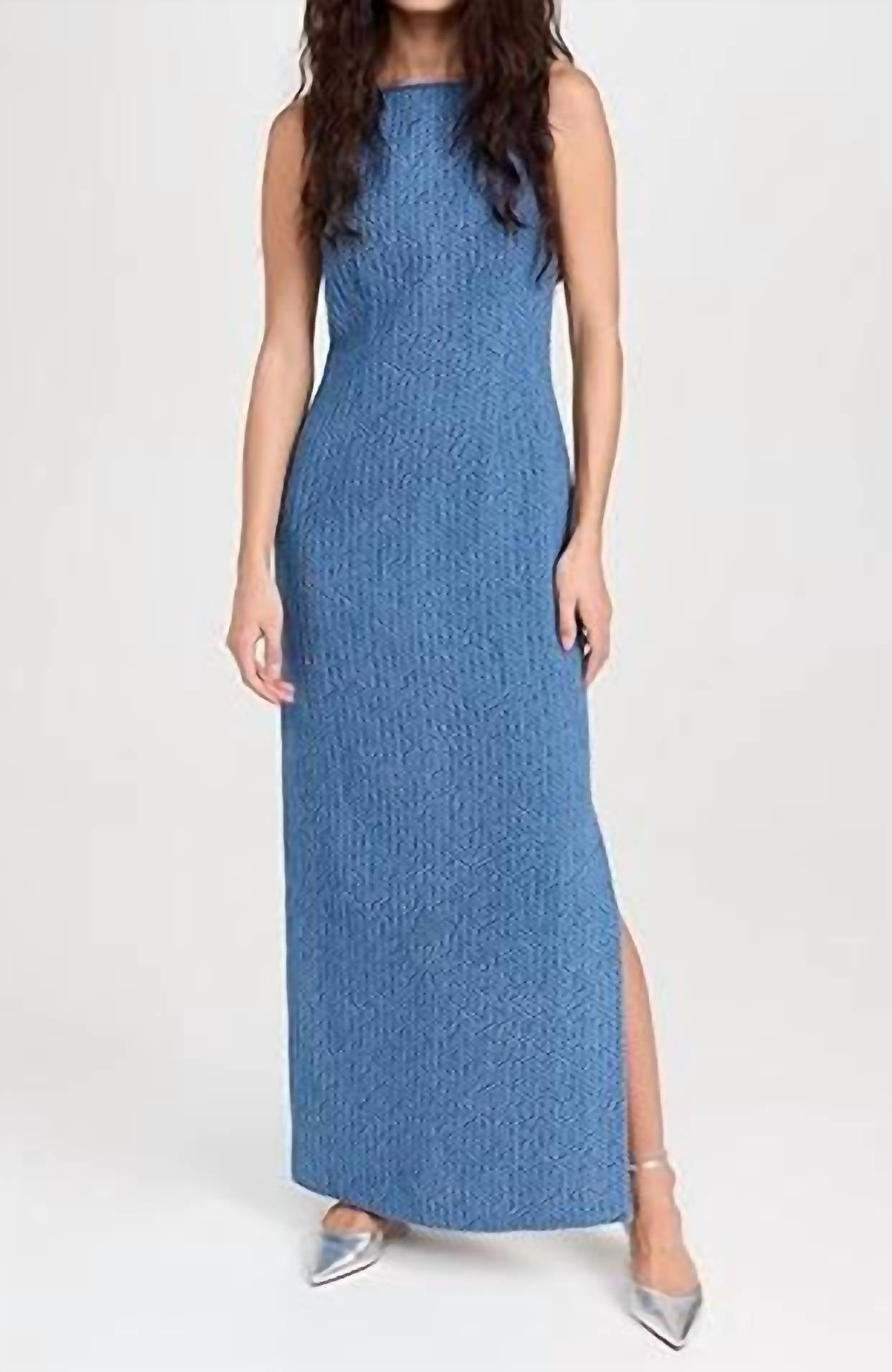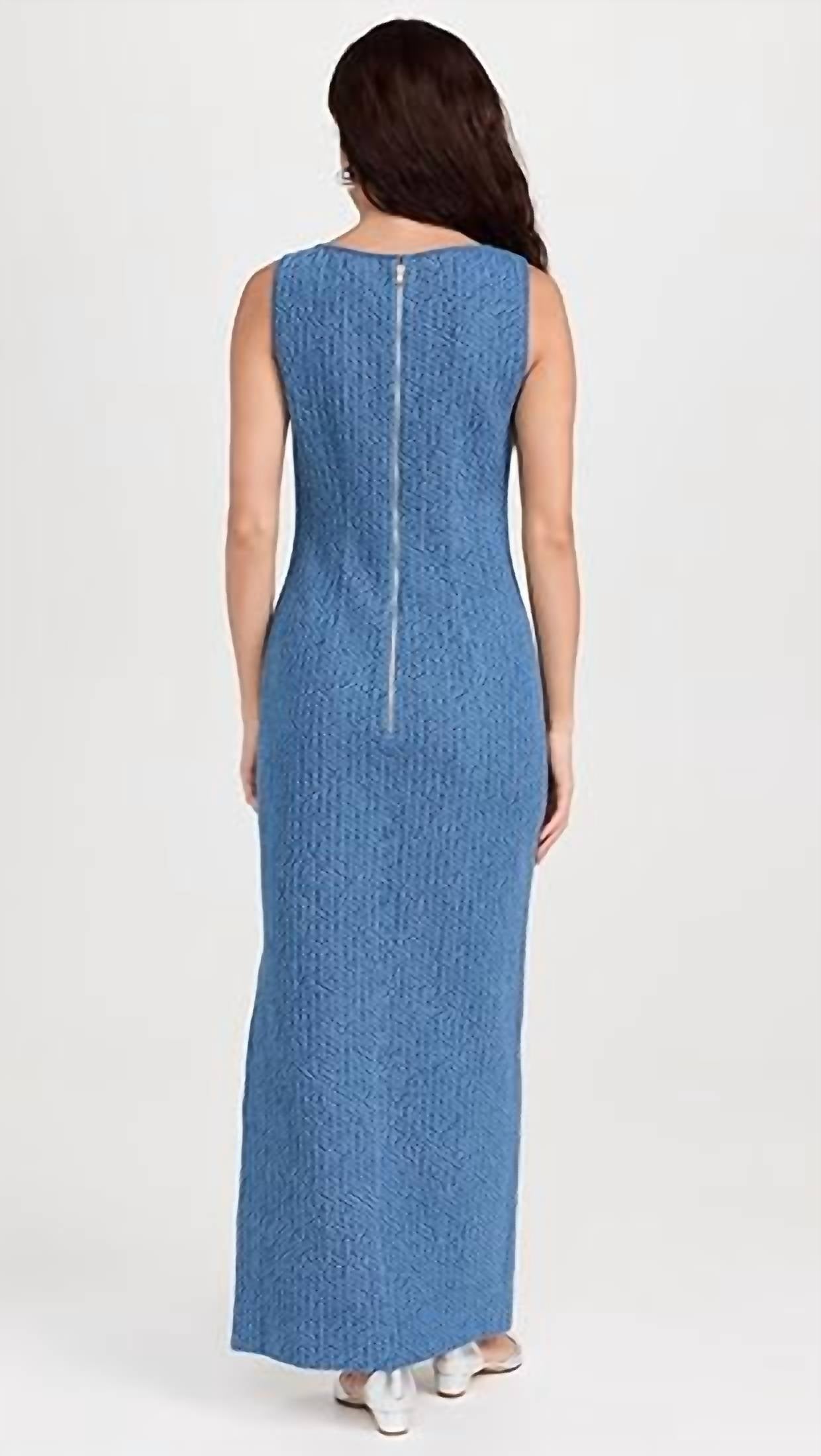 A maxi dress that is just as cute as it is comfortable. Introducing the Easy Denim Dress by Arianne Elmy, a chic creation in classic blue perfect for any occasion. This sleeveless sheath dress is crafted from a cotton blend, boasting a textured finish for added style. It features a flattering boatneck and a scooped out back, complemented by a side slit for a touch of elegance. Fitted with a convenient zip closure, this maxi dress is easy to care for with machine wash instructions, making it an ideal choice for minimalist spring vacations.