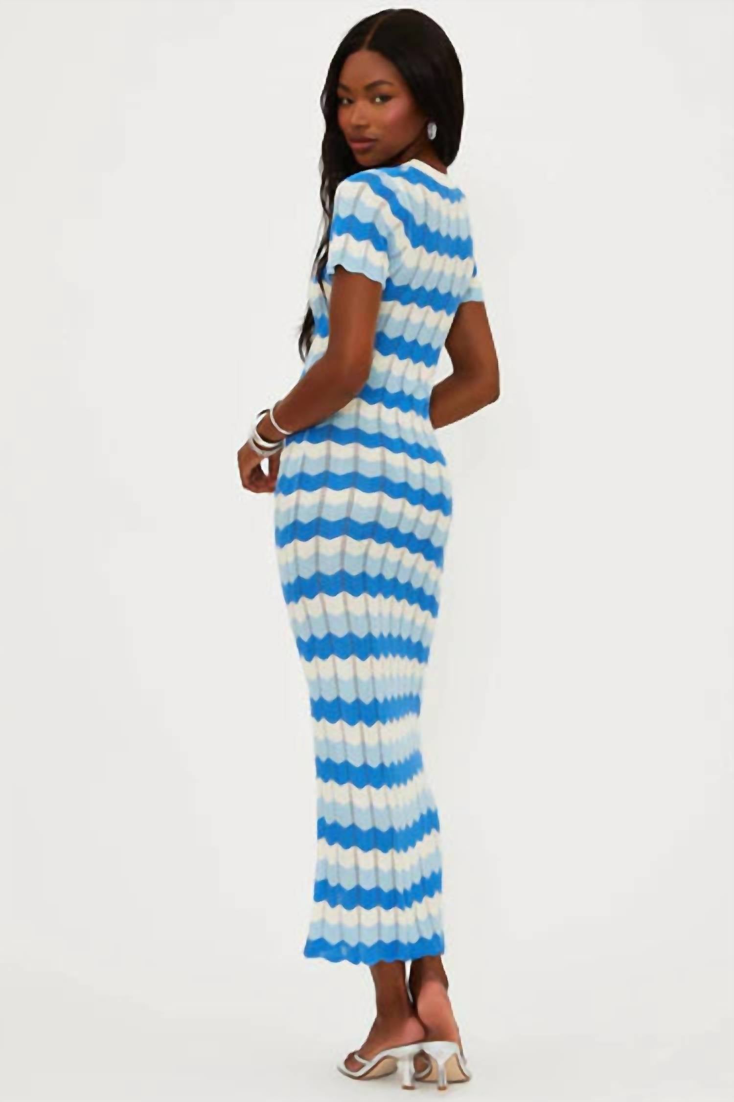 Style this maxi with your favorite statement necklace and sandals for the perfect look. Introducing the Emory Maxi Dress by Beach Riot, a stunning choice for any holiday party. This dress features short sleeves and a bodycon silhouette, crafted from soft viscose for a comfortable fit. The Coastal Waves stripe pattern adds a coastal touch, while the pull-on closure and crewneck provide ease and style. Care for this dress by hand washing and laying it flat to dry, ensuring it remains a wardrobe favorite.