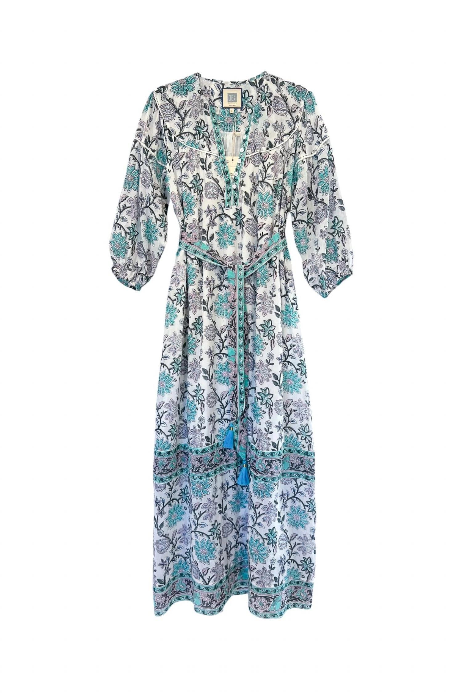 Style this maxi with your favorite statement necklace and sandals for the perfect look. Introducing the Katherine Maxi Dress by BELL, a stunning addition to your summer wardrobe in a light turquoise and purple floral pattern. This three-quarter sleeve, A-line maxi dress is crafted from a breathable cotton blend with a composition of 70% cotton and 30% silk. Featuring a crewneck and button closure with a tassel tie waist, this dress offers both style and comfort for a chic boho look. Care is easy with machine wash instructions, making it perfect for vacation or Easter occasions.