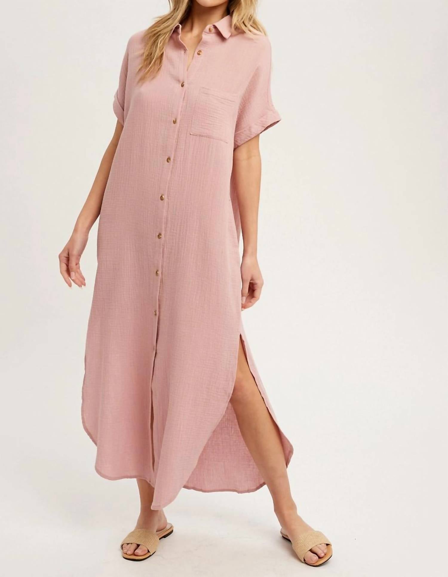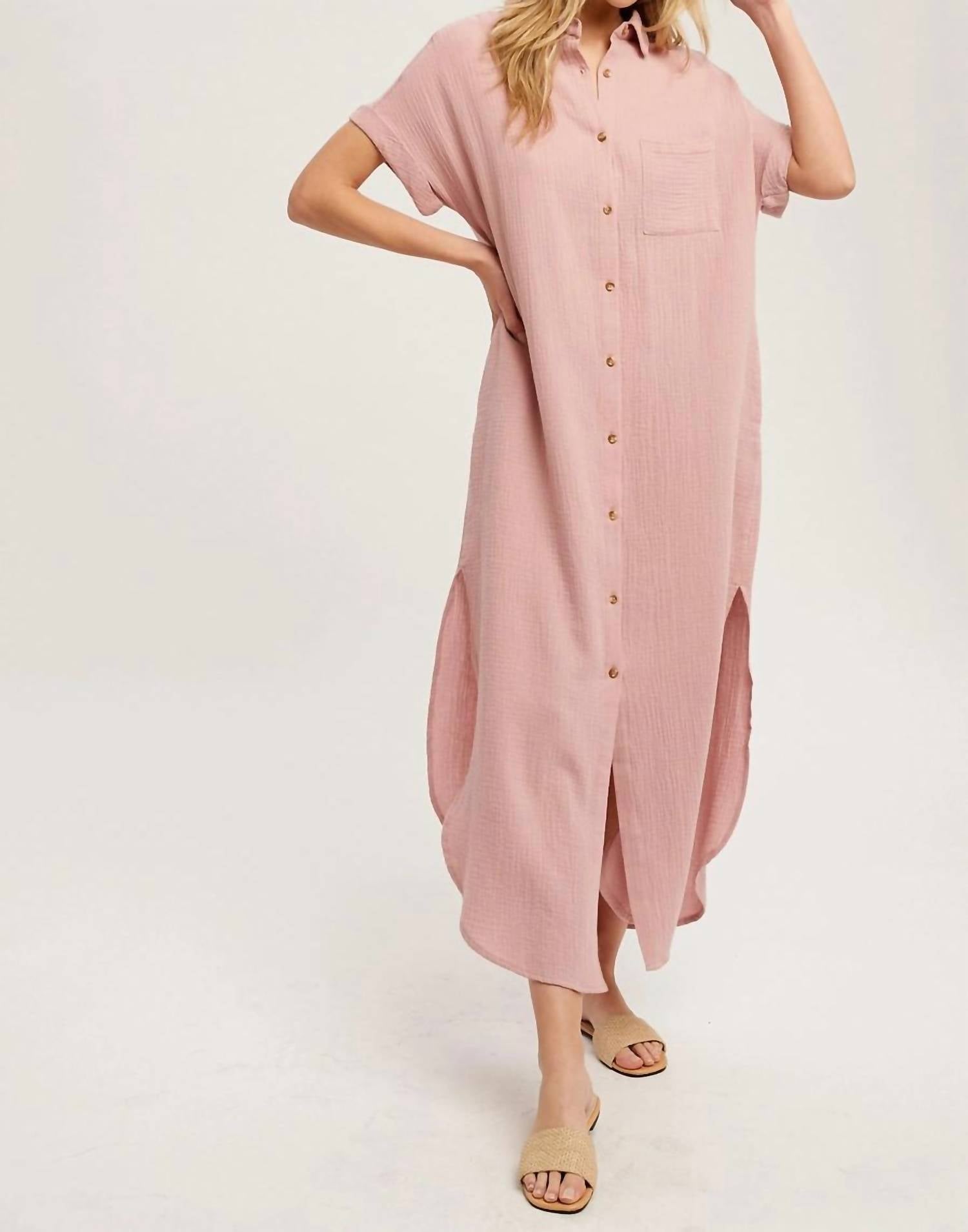 Who doesn't love a good maxi dress? This one you'll be reaching for season after season. Introduce yourself to effortless elegance with the Rose Dreams Maxi Shirt Dress by BluIvy, an ideal choice for a holiday party. This pink dress, crafted from textured cotton, showcases short sleeves with cuffs and a relaxed fit. Designed with a v-neckline and collar, its button closure offers a casual yet sophisticated look. Functional side seam and front breast pockets complete the minimalist style, while side slits and the gauzy maxi length ensure comfort and ease for any spring occasion.