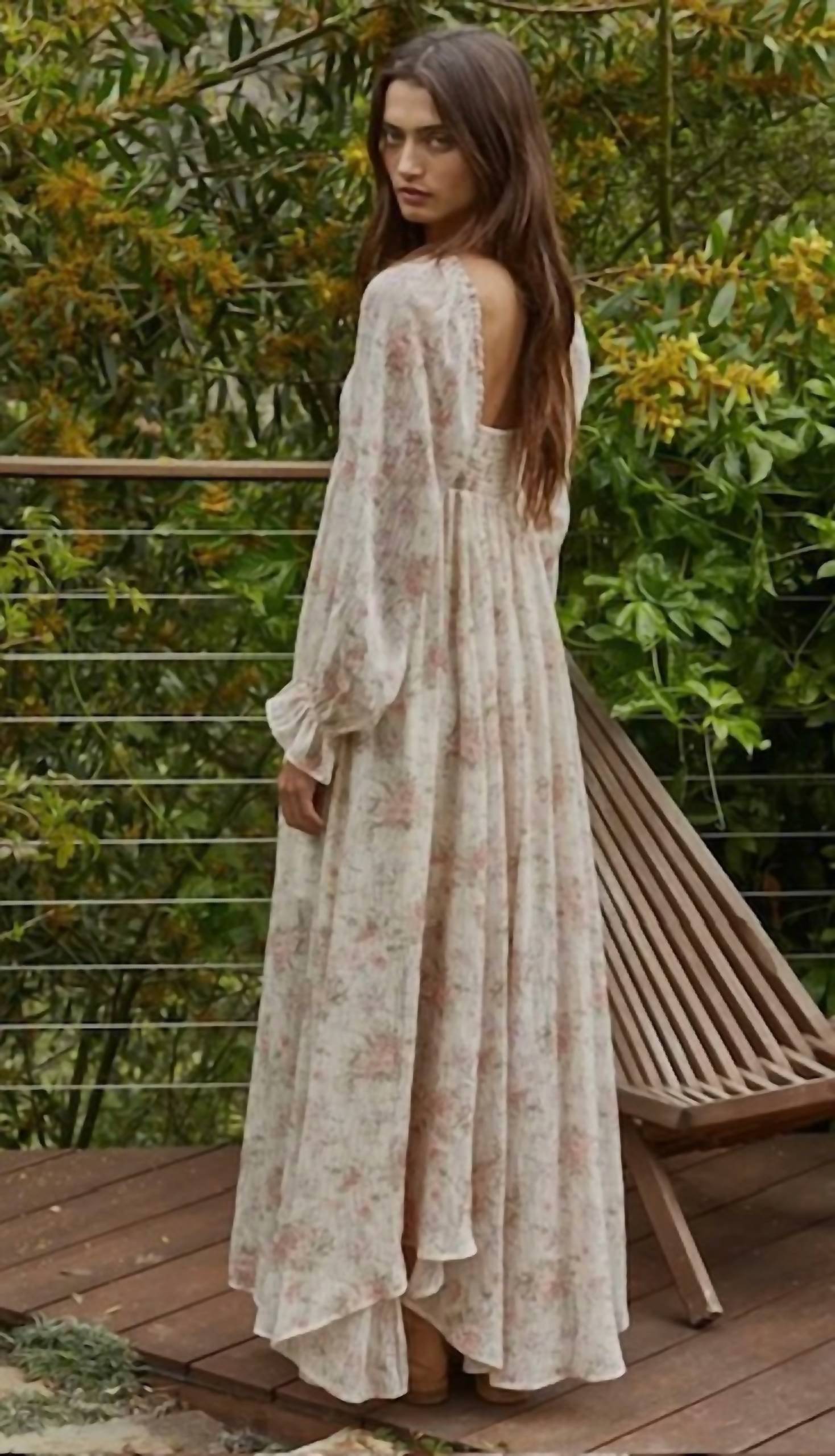 A maxi dress that is just as cute as it is comfortable. Woven Polyester Chiffon Floral Print Square Neck Long Sleeve Flare Maxi Dress With Back Smocking And Rayon Lining