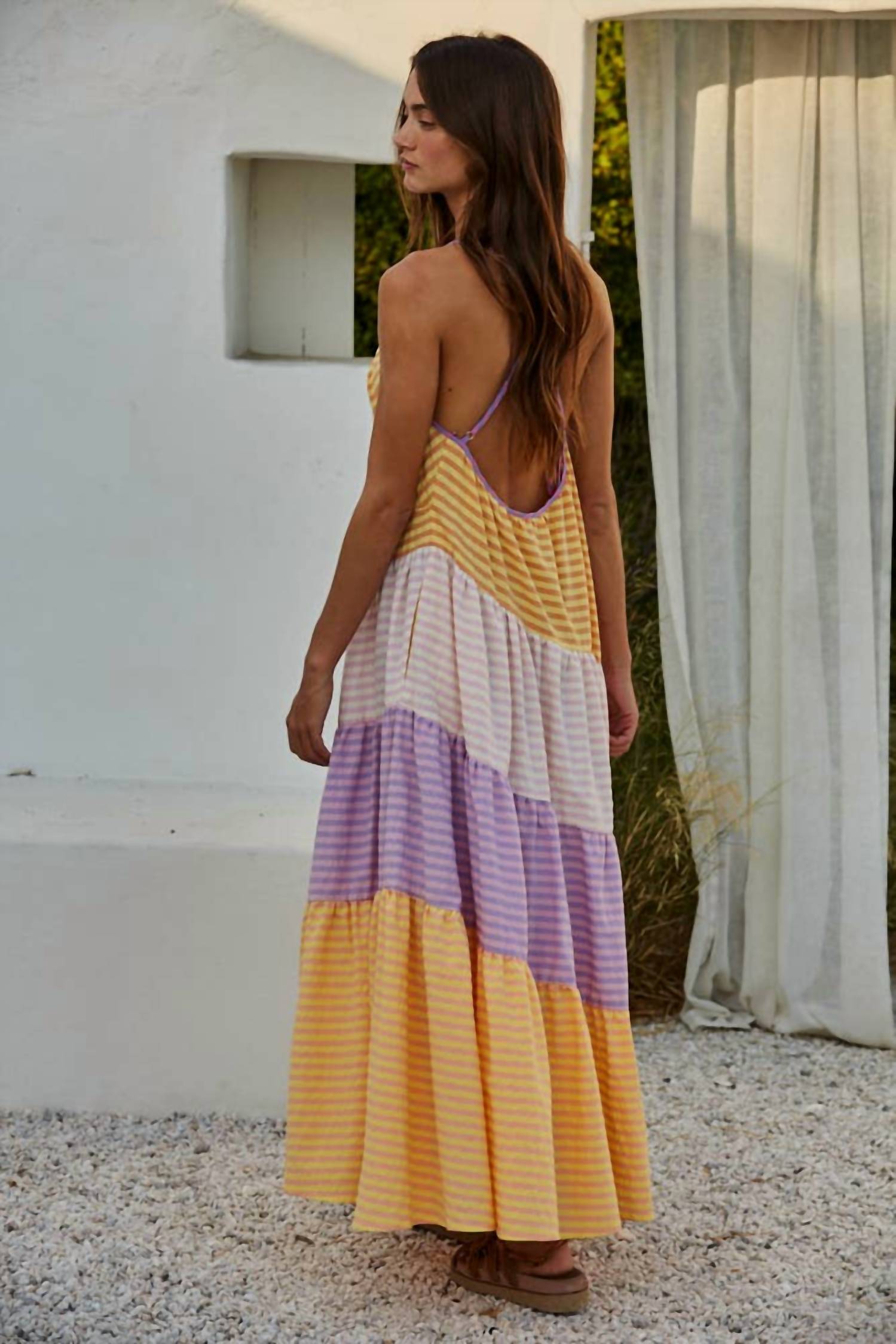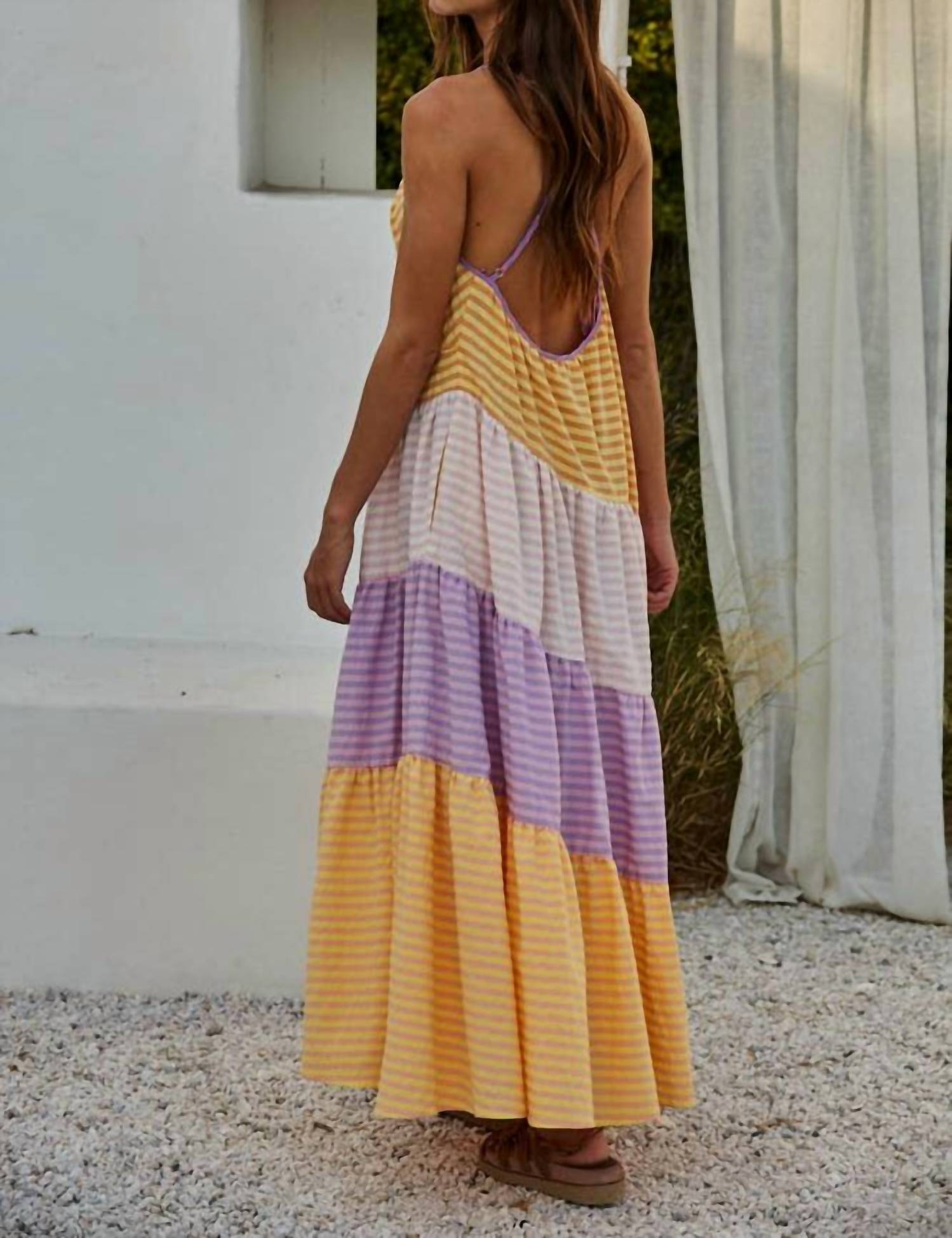 Who doesn't love a good maxi dress? This one you'll be reaching for season after season. Introducing the Striped V-neck Dress by By Together, a perfect addition for your summer beach day. This maxi dress features spaghetti straps and a criss-cross back, crafted from a cotton blend for comfort and style. The A-line silhouette is enhanced with functional pockets and a flowing tiered design. Closure is via tie closure. Ideal for embracing the 90s fashion trend in vibrant yellow and purple stripes.