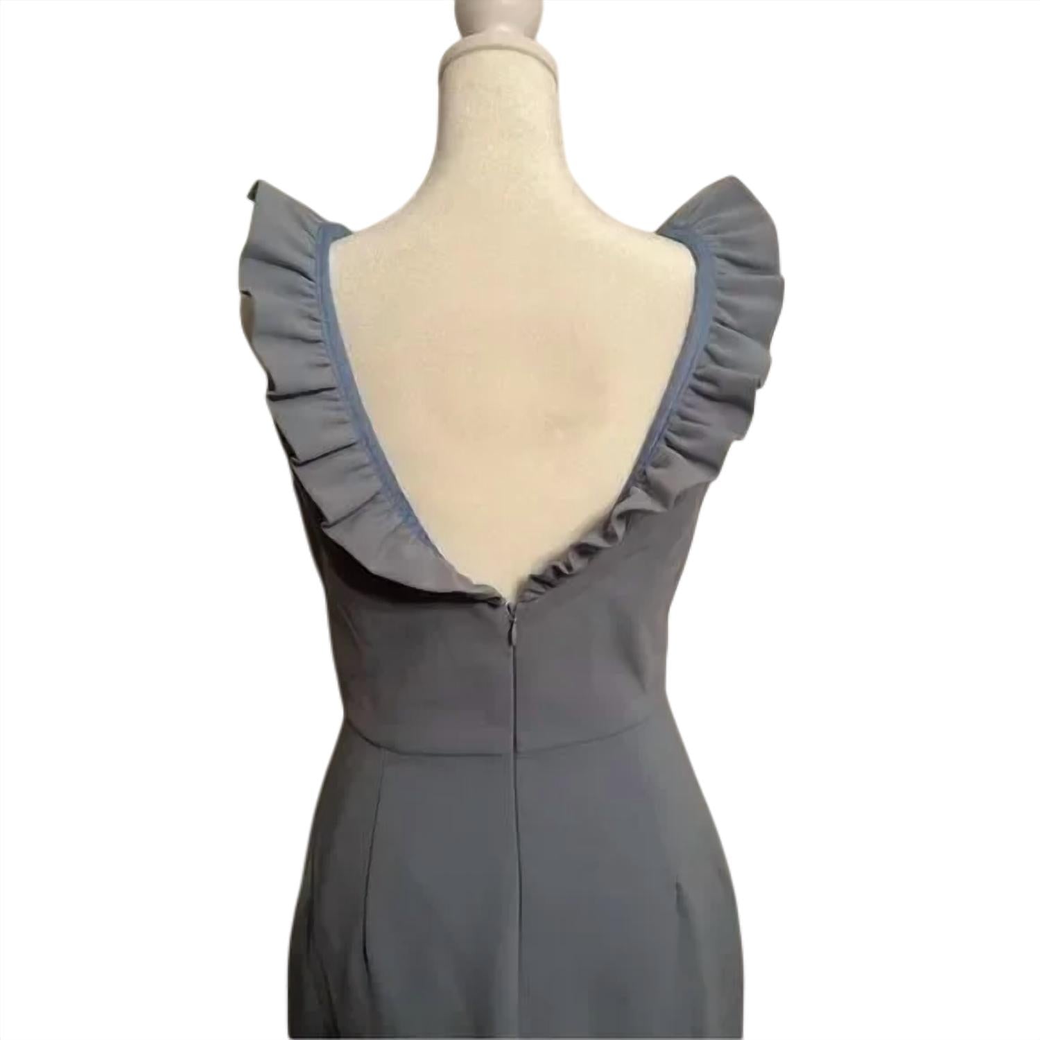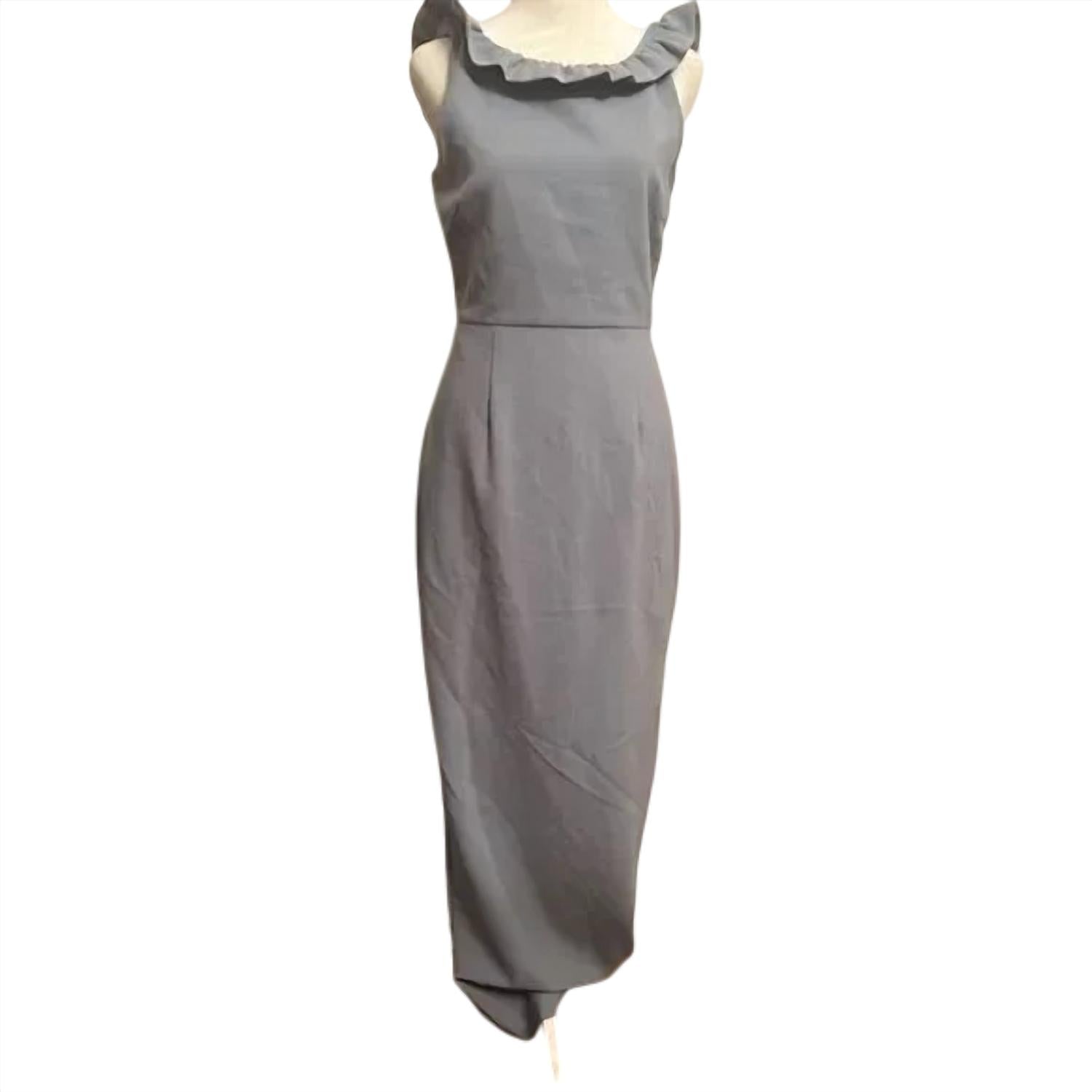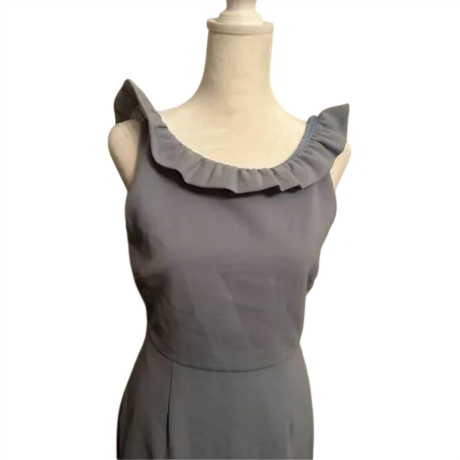 A maxi dress that is just as cute as it is comfortable. Introducing the Alexandria Maxi Dress by Camilyn Beth, a stunning addition to your spring wardrobe in elegant silver/grey. This sleeveless sheath silhouette features a chic ruffle neckline and a boatneck design, perfect for a minimalist dinner party look. Made in the US with a luxurious fully lined finish, it boasts a seamless invisible zipper closure for a sleek silhouette. Care: Dry clean only.