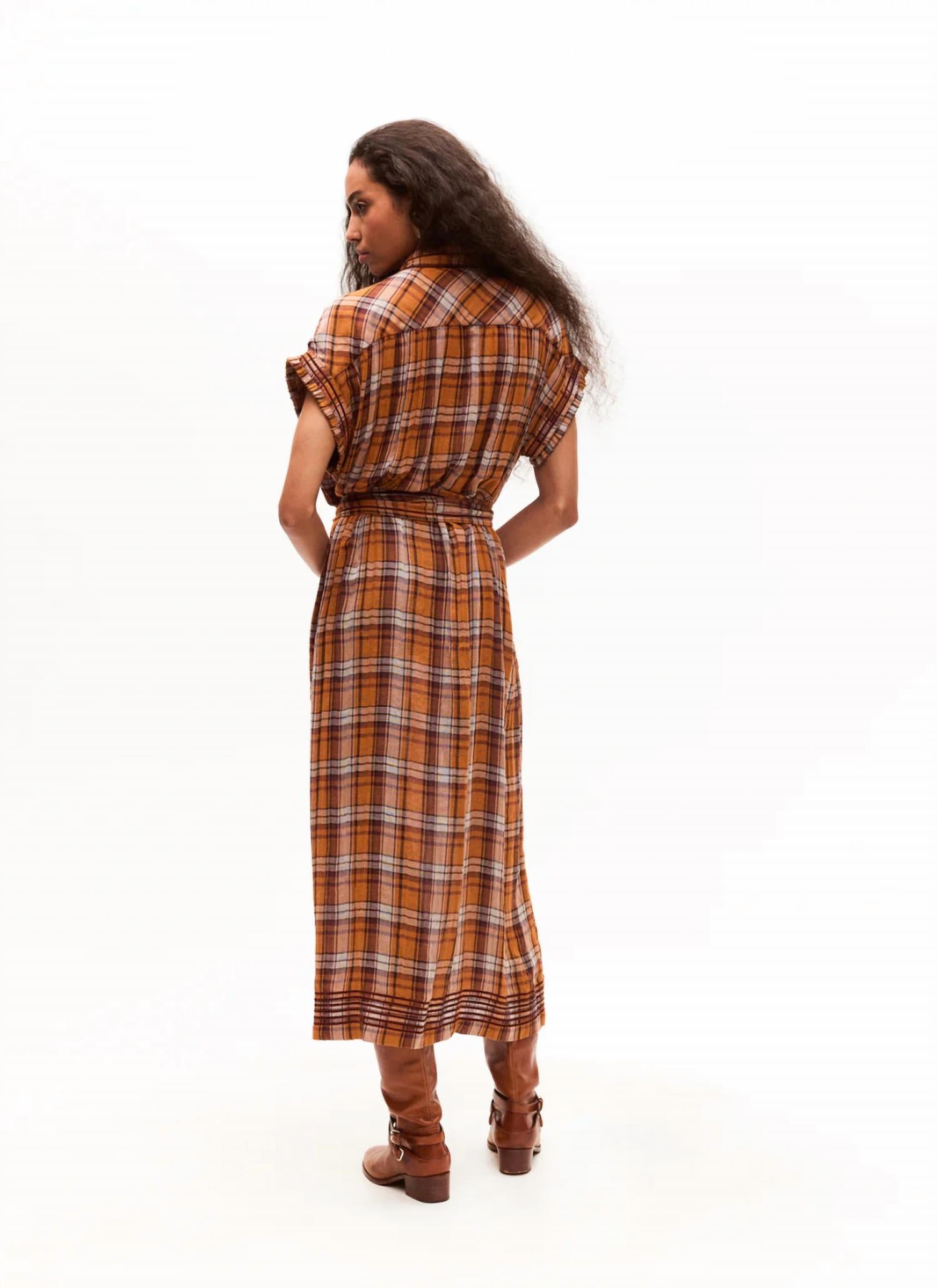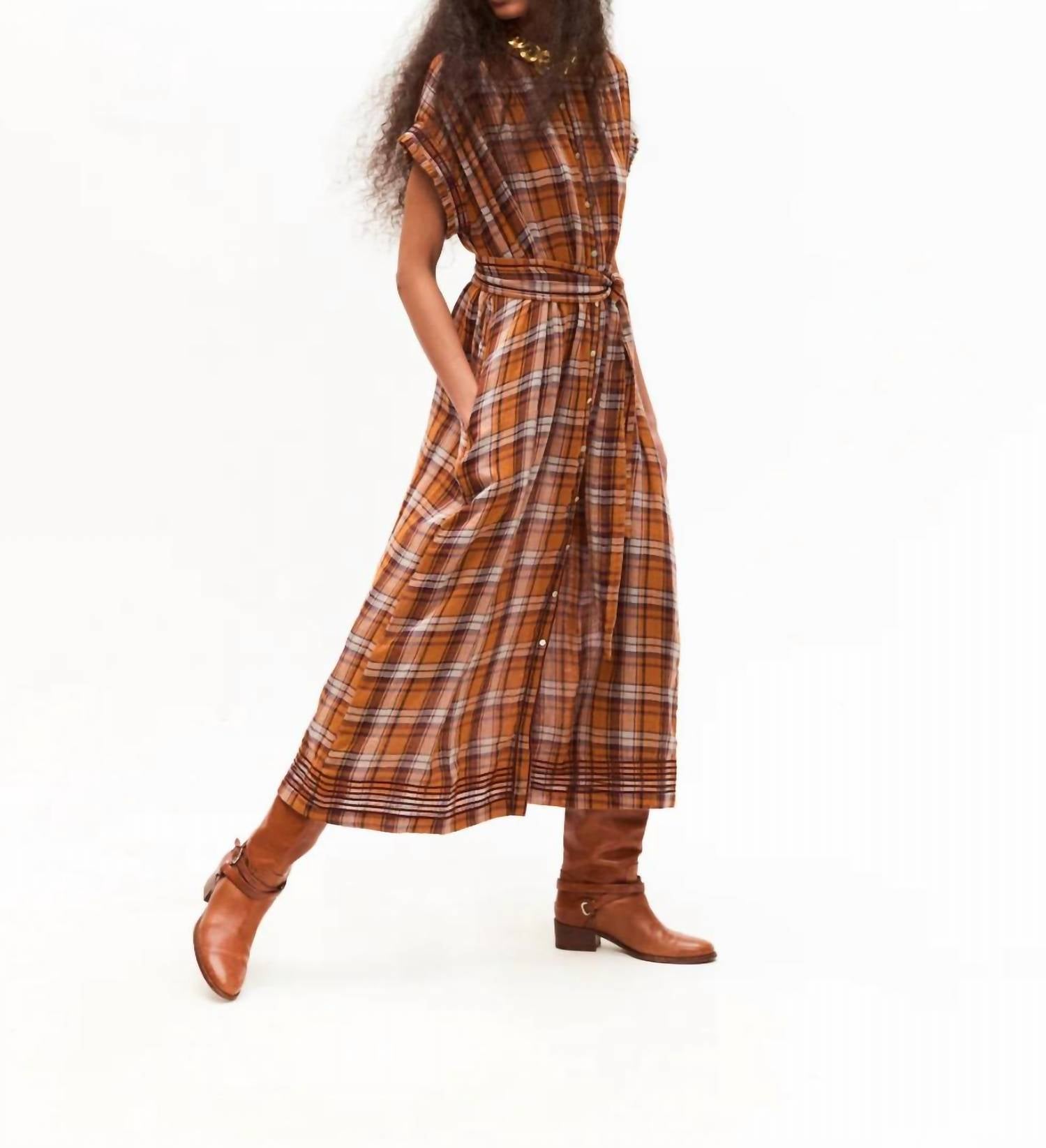 Style this maxi with your favorite statement necklace and sandals for the perfect look. Discover the Valerie Short Sleeve Maxi Kaftan Dress by CAROLINA K, perfect for a maximalist fall wardrobe. Crafted from artisanal loomed fabric, this brown plaid dress boasts a button-down closure with a mandarin collar and pockets for functionality. Its relaxed silhouette is cinched at the waist with a matching fabric belt, offering a flattering fit. Care for this patterned piece with machine washing to keep it looking its best.